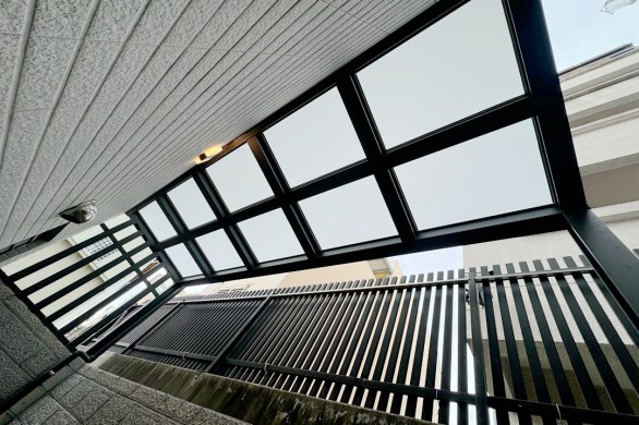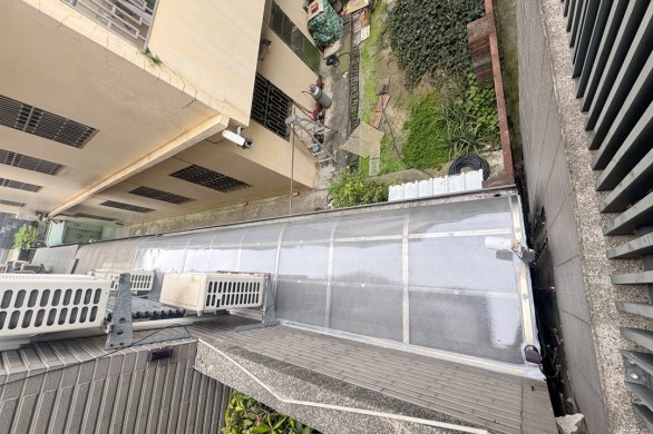 一樓車庫的採光罩板老舊,要更換新板◎有影片