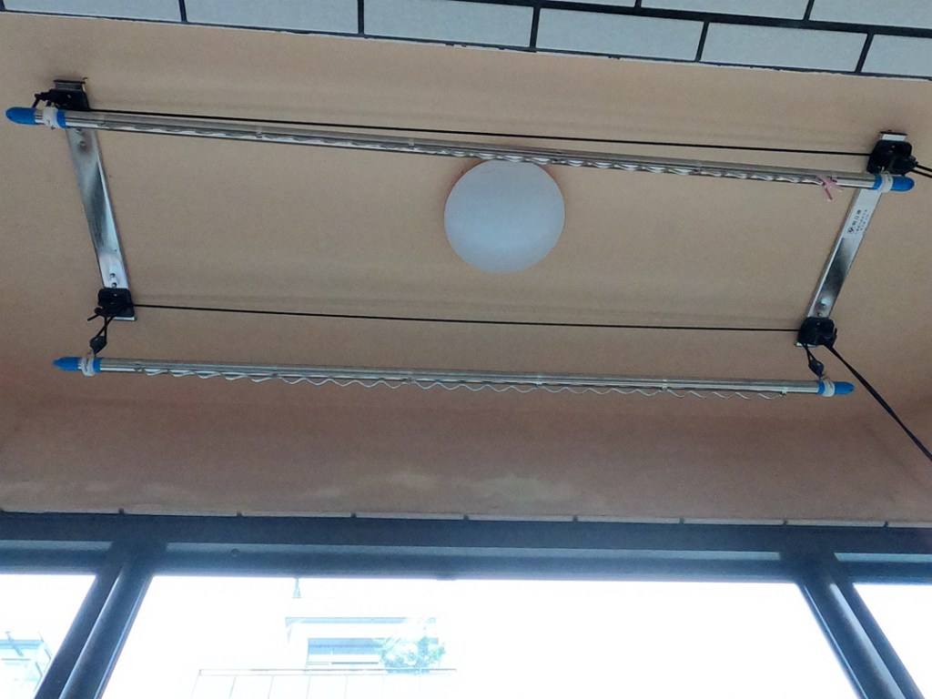業主有晒衣需求,施工時再加裝活動晒衣架。升降式晒衣架,不使用時,可升高在天花板,避免遮蔽視線,使用時只需拉活動線降落,從此晒衣不怕落塵,也不怕大風吹落。