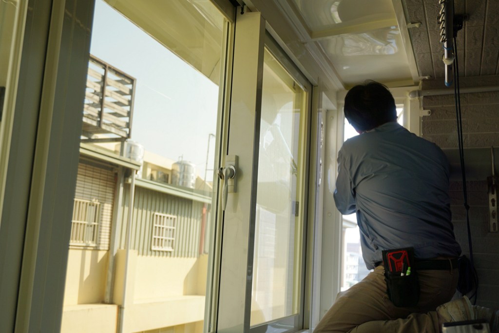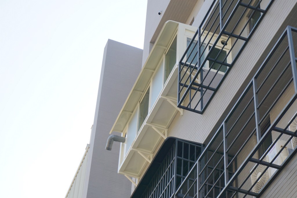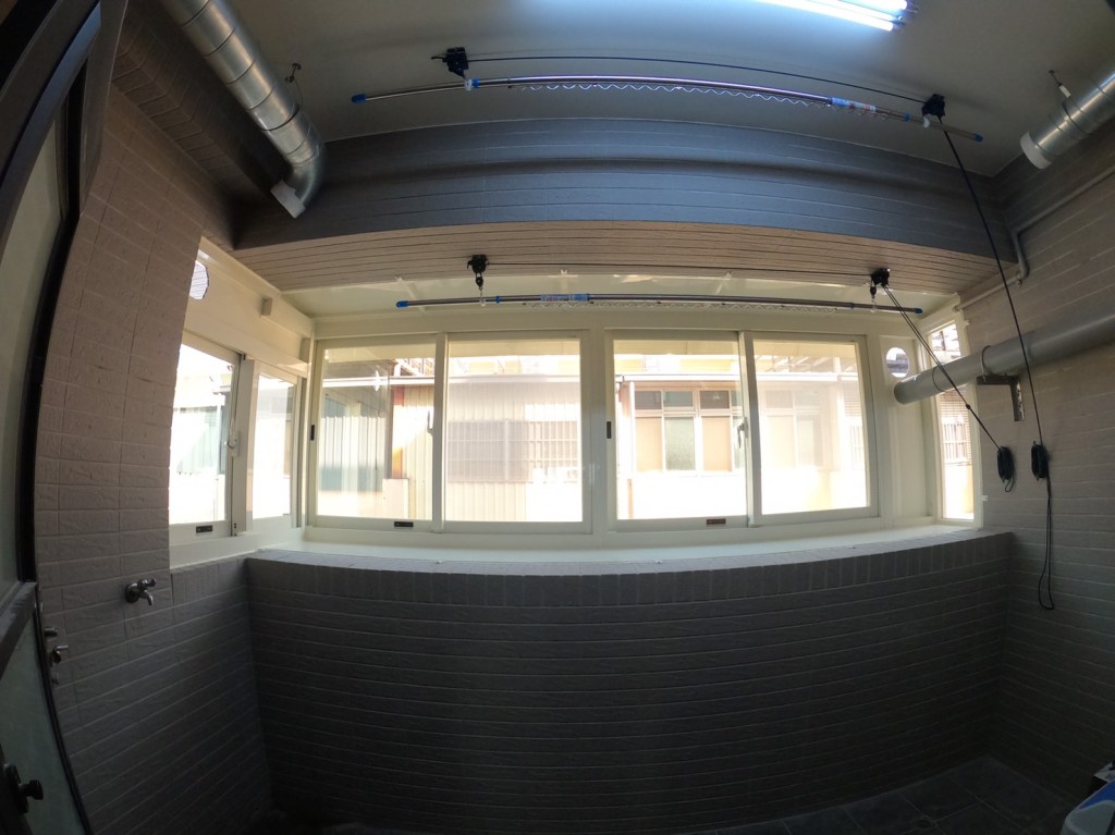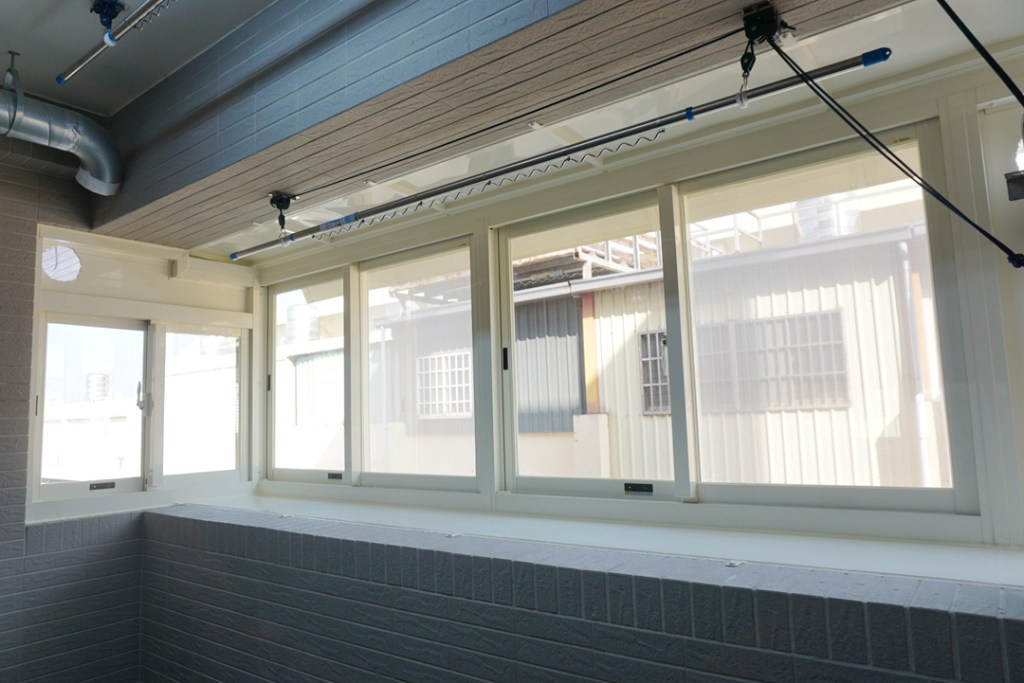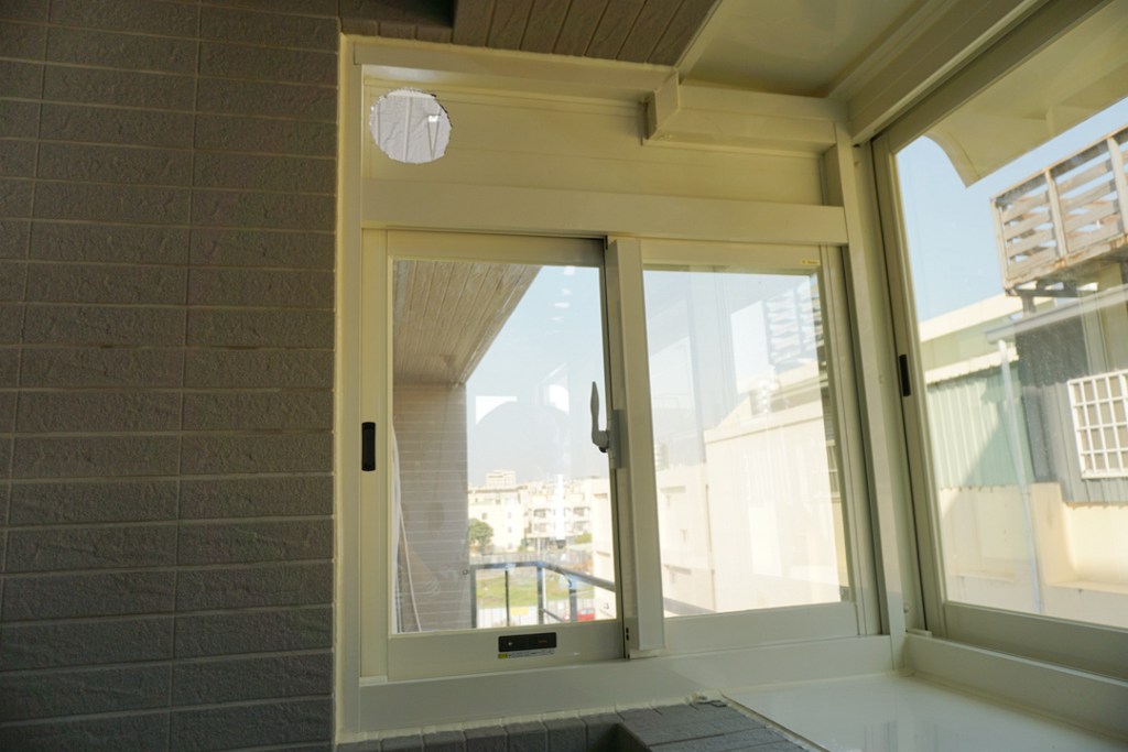 業主自建電梯華廈自住,考慮陽台的使用便利性,裝設陽台氣密窗後,一可防止晾曬的衣物吹落,二可保持陽台乾淨落塵堆積減少。洗衣機等電器設備,有雨遮陽台也可安心不怕雨淋故障。排氣孔通風管則依業主需求開孔向外,整齊美觀。白色陽台窗瞬間明亮室內,視覺上空間會比較寬廣。