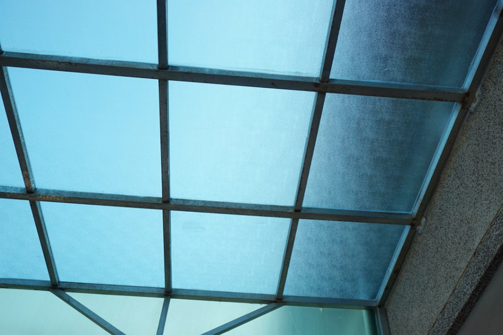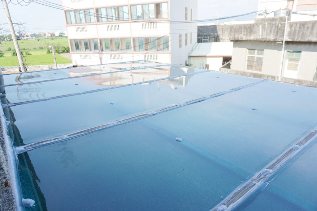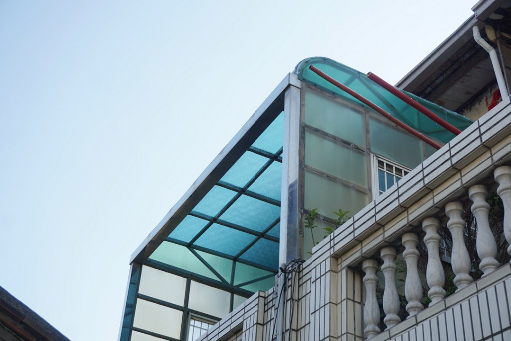 業主家二樓大陽台原裝設PC板採光罩,經久使用採光罩頂蓋面板氧化破裂,恐有漏水之虞,委託更換PC板。