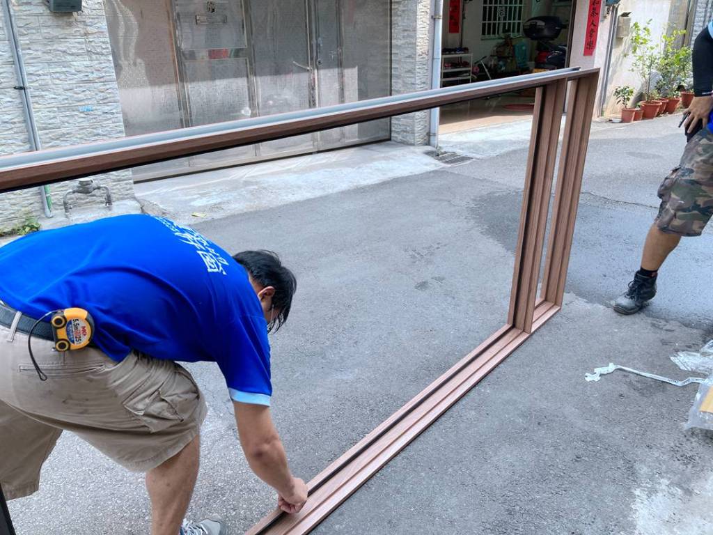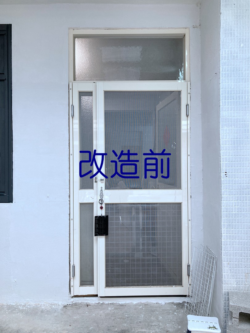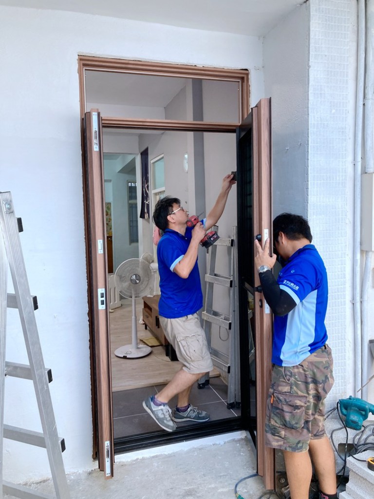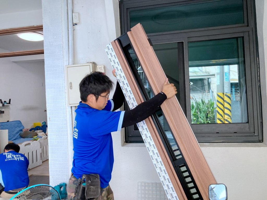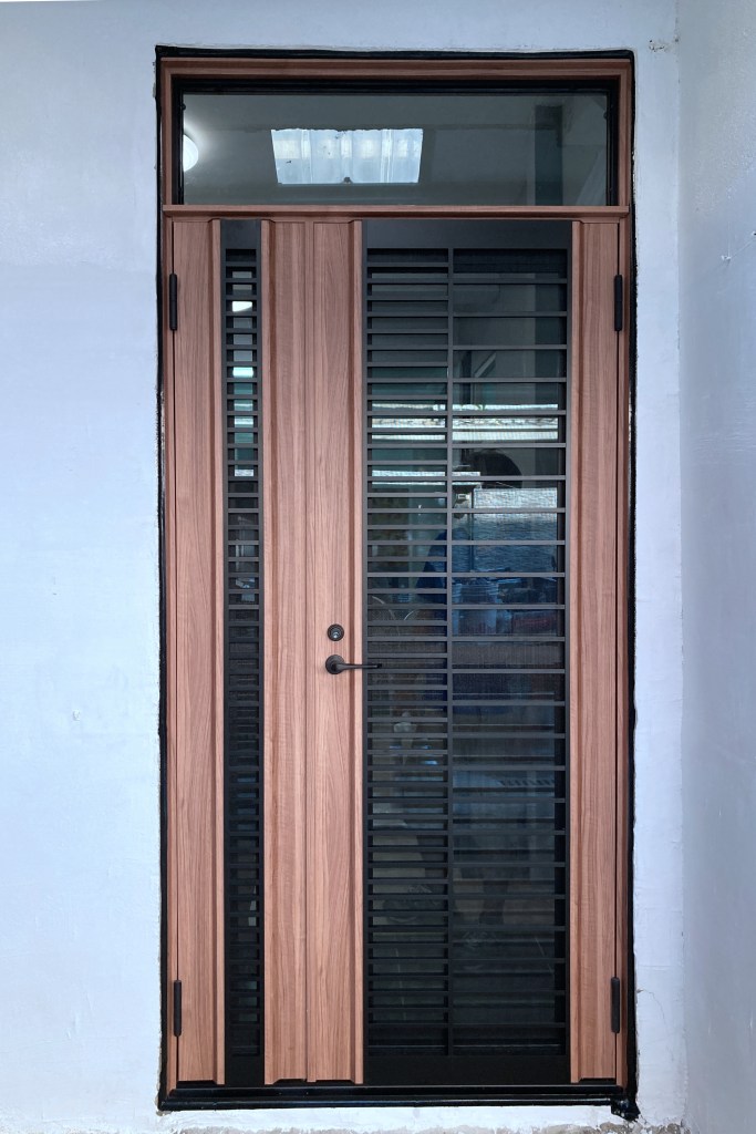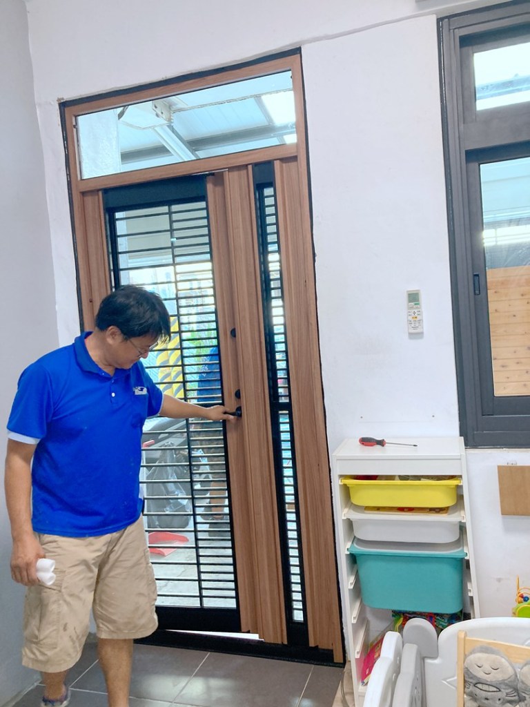 業主對居家品質要求高,舊屋入住幾年後大刀闊斧改造,從原來白色系轉換成現代風裝潢質感宅。大門選定木紋通風門作為玄關門,因應原門幅寬度,維持上固定氣窗加雙扇子母門型式設計。平時只需開啟單門進出,若有大型物件出入則可全開。氣密窗則挑選鐵灰砂色系。