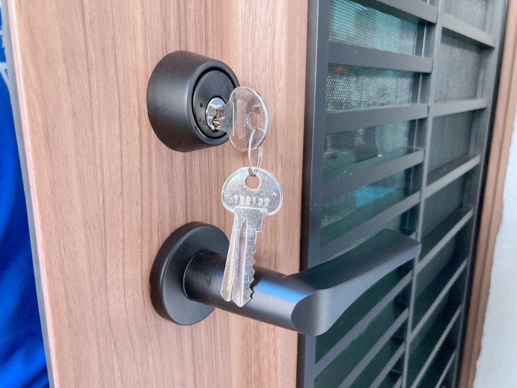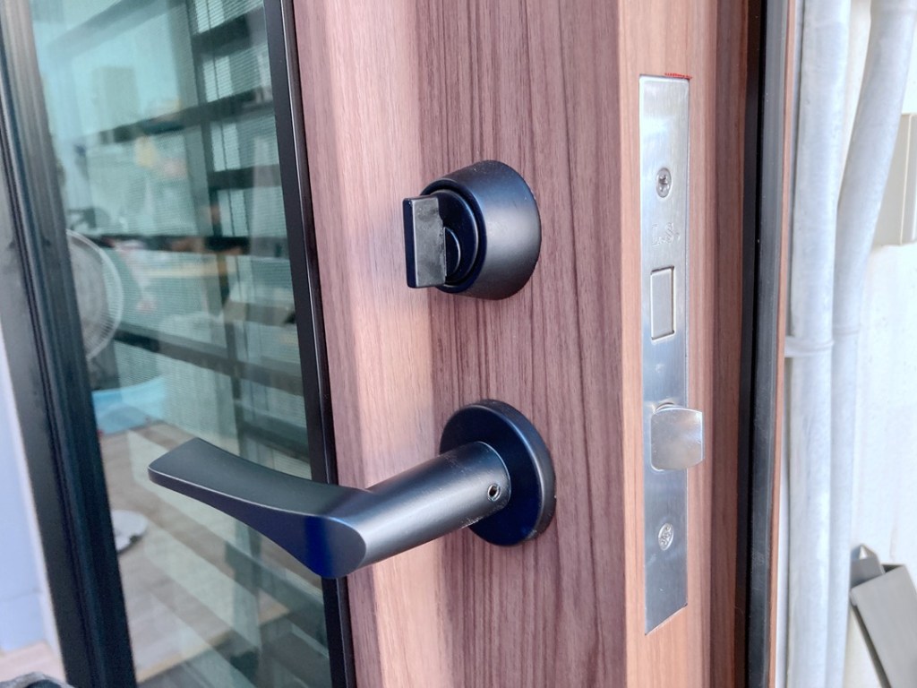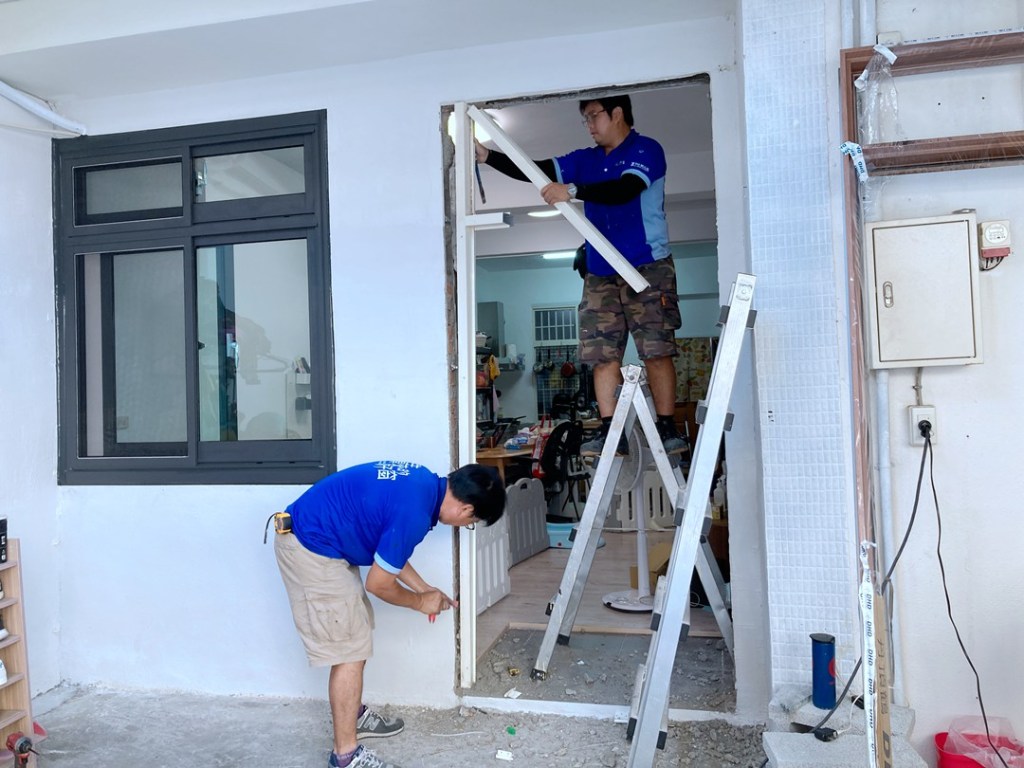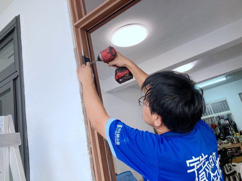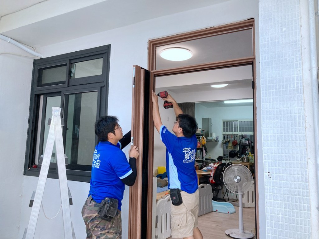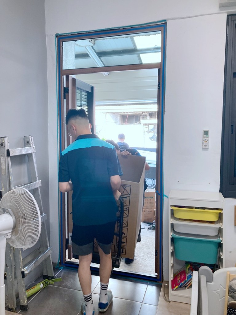 業主對居家品質要求高,舊屋入住幾年後大刀闊斧改造,從原來白色系轉換成現代風裝潢質感宅。大門選定木紋通風門作為玄關門,因應原門幅寬度,維持上固定氣窗加雙扇子母門型式設計。平時只需開啟單門進出,若有大型物件出入則可全開。氣密窗則挑選鐵灰砂色系。