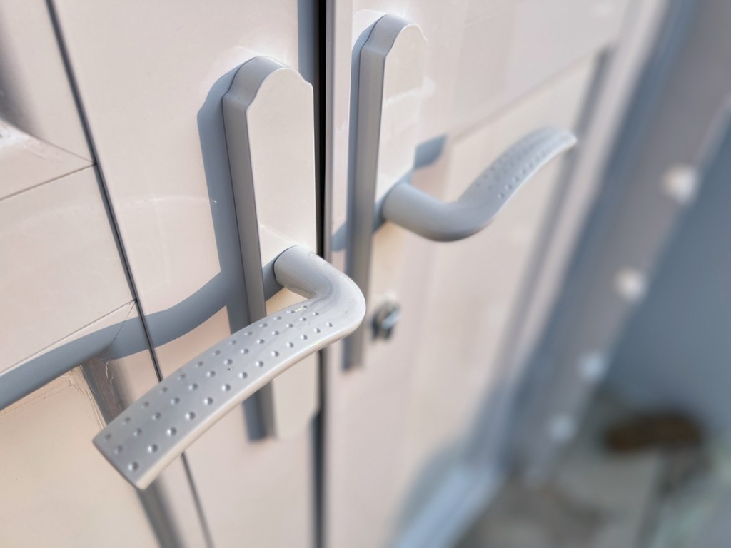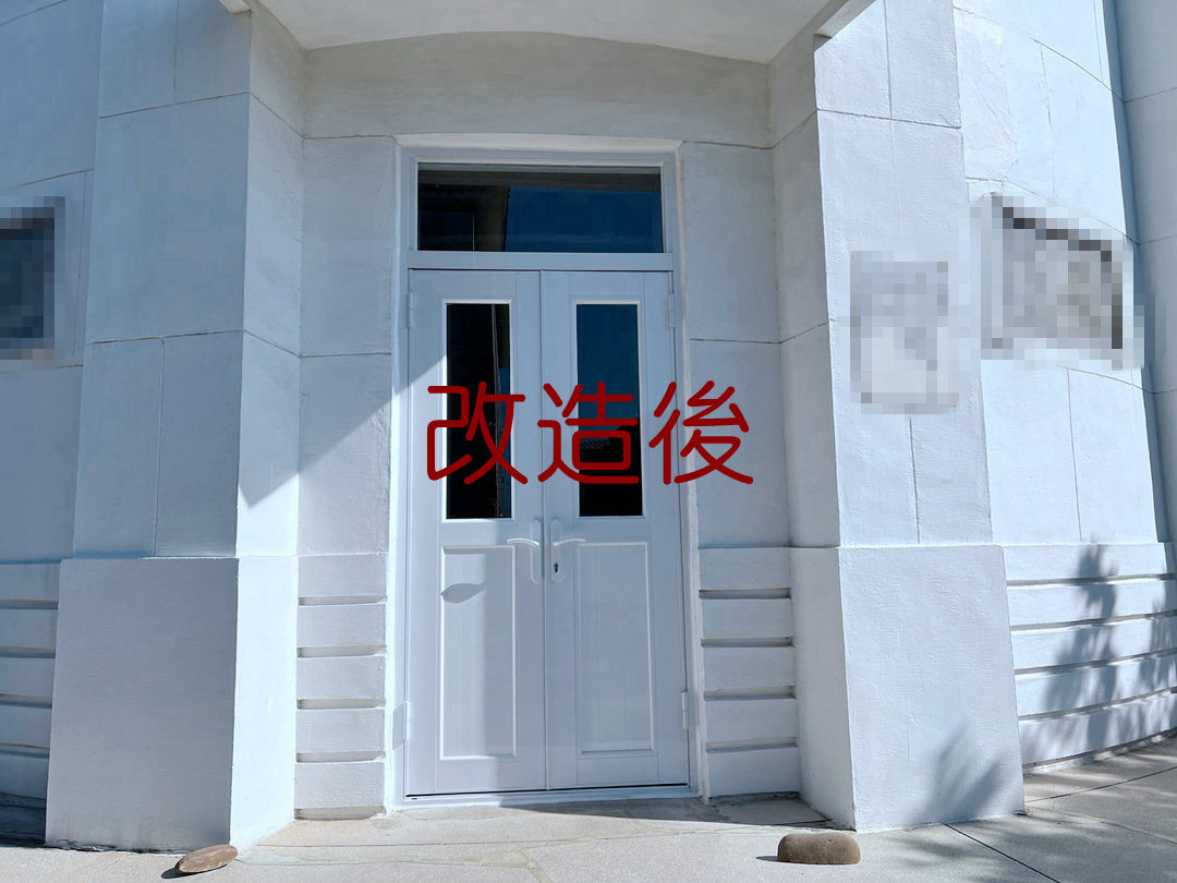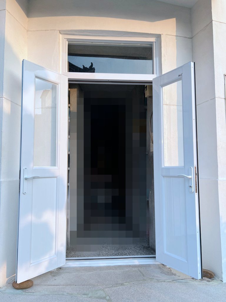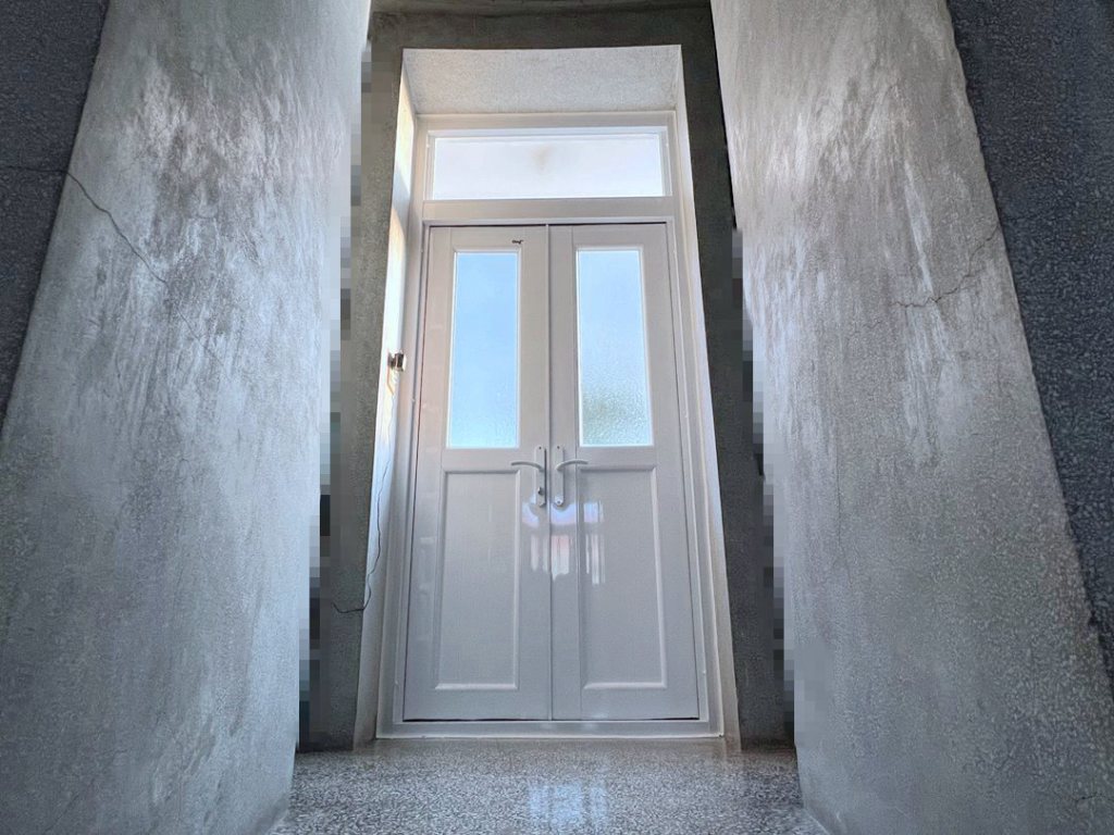 業主共有五座老舊塑鋼雙開門已不堪使用,決定改換裝潢家雙推開大門。雙推開門採用銀霞玻璃及透明玻璃,天窗貼以固定玻璃全封,減少落塵。純白色大門搭配全棟白色建築,整體潔淨的空間保持一致的素雅格調,視覺上更加大氣,而且開啟的同時能讓空間通暢,光線視覺都有所提升,簡約精緻的推薦選擇。