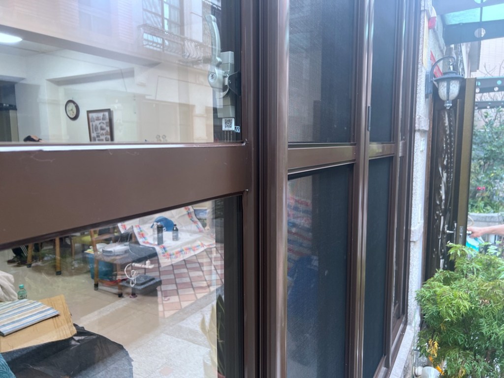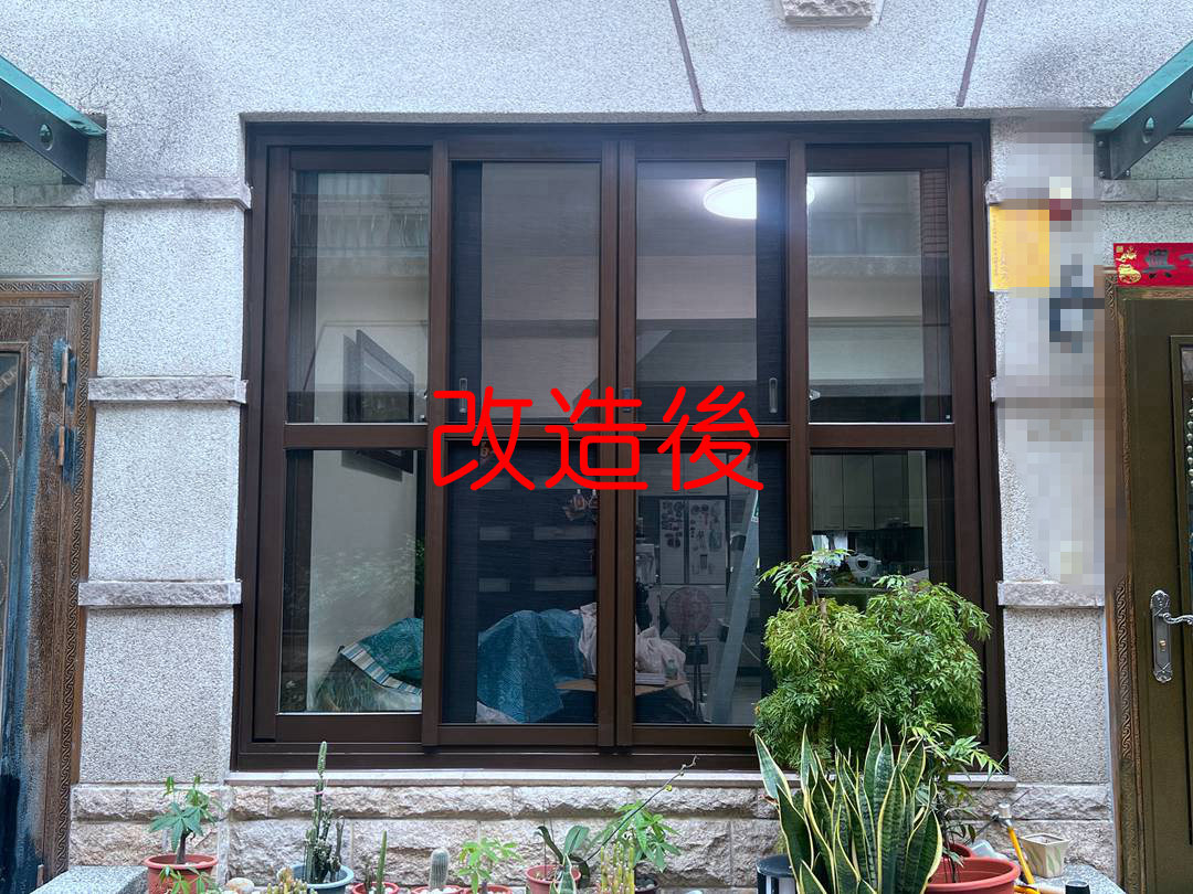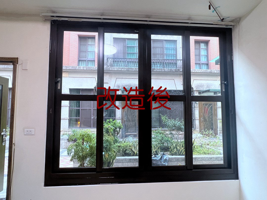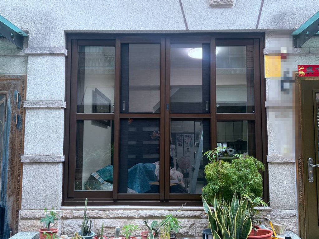 業主家客廳四拉型氣密窗,改裝新型氣密窗,咖啡色鋁合金框體,搭配透明玻璃,低調沈穩。