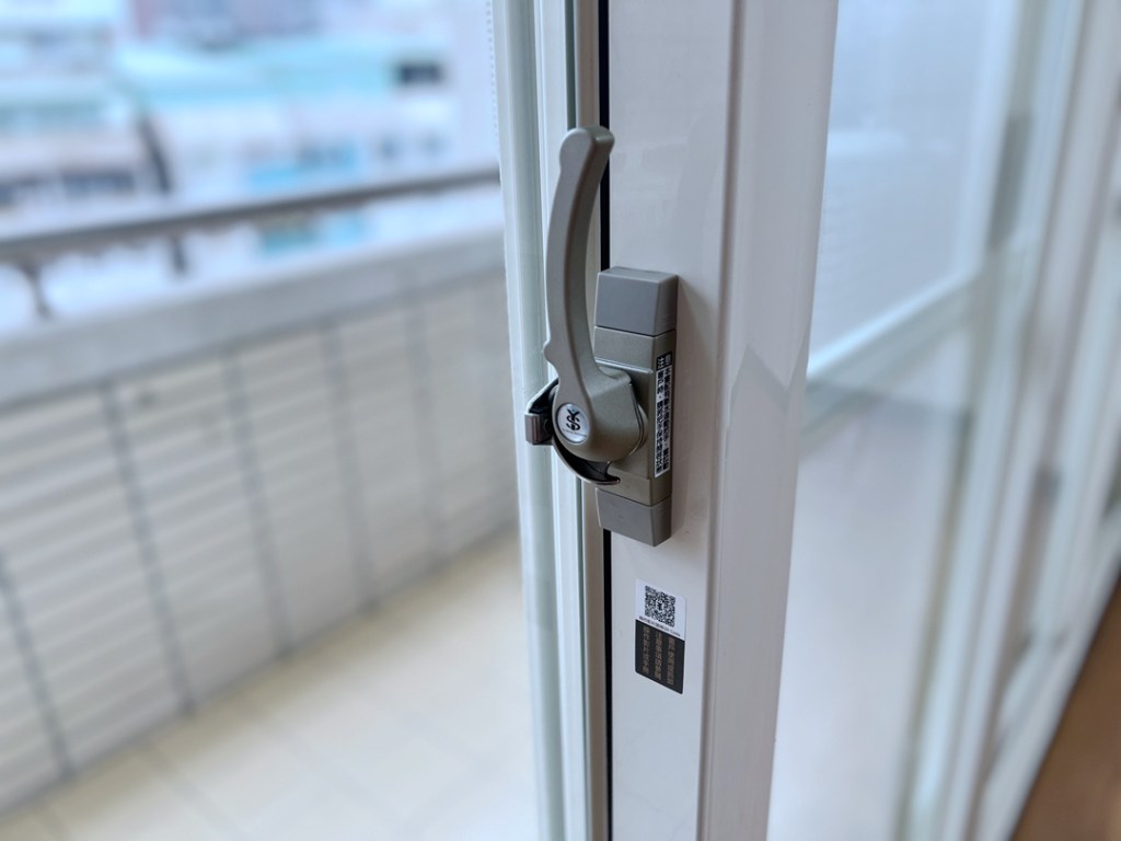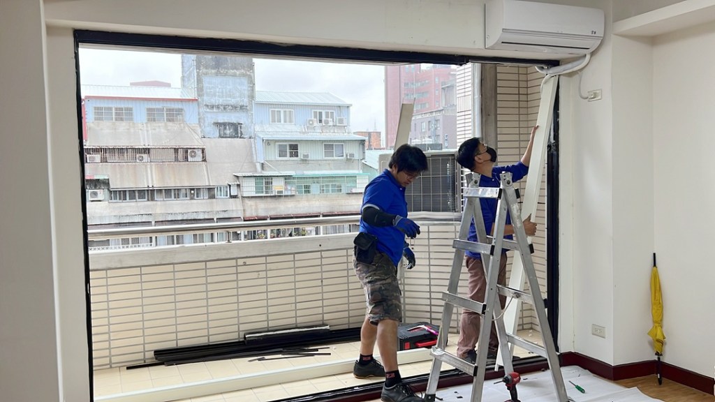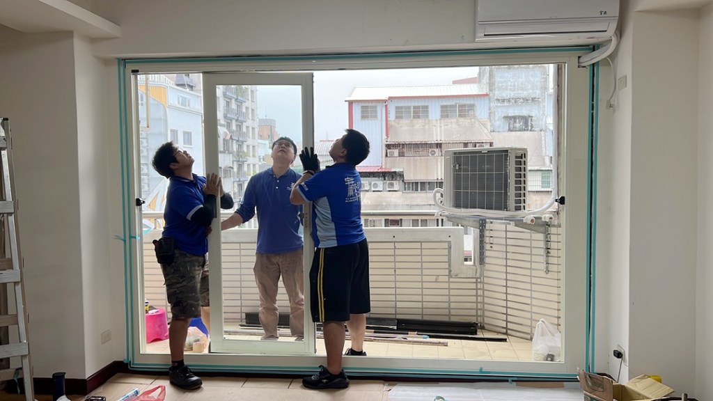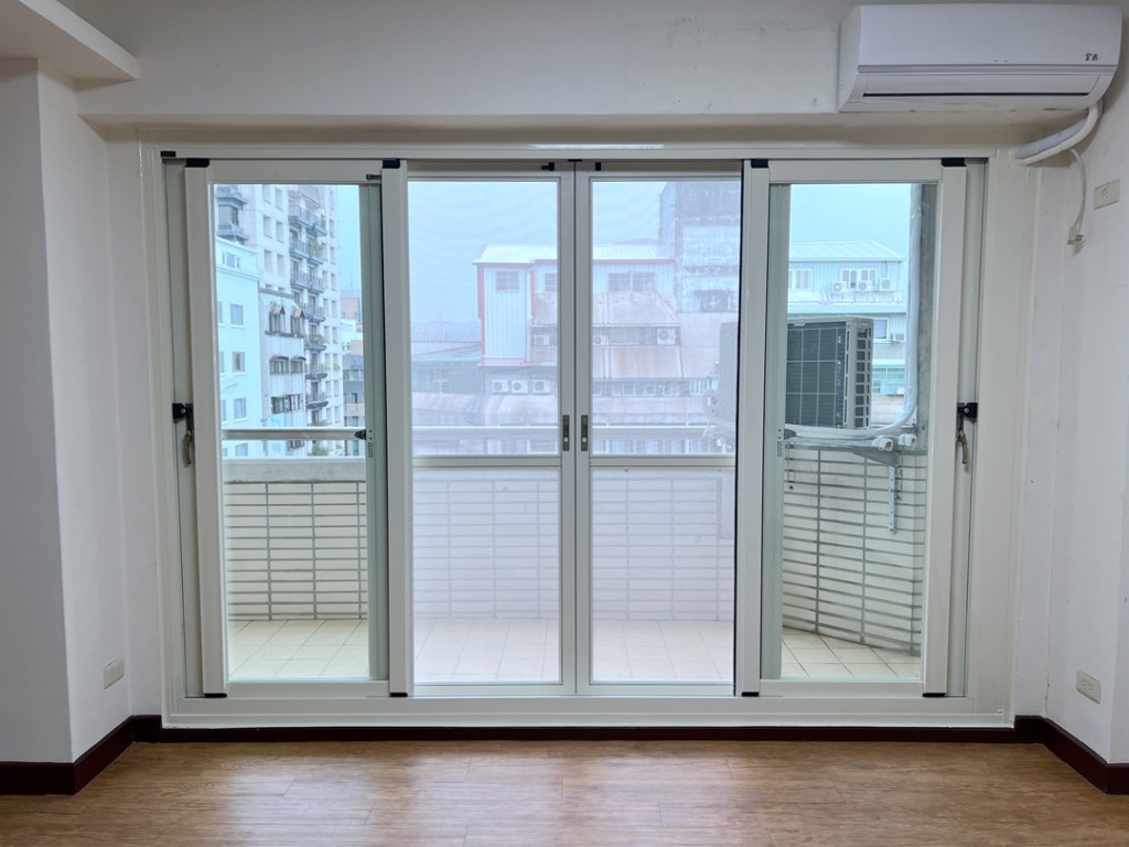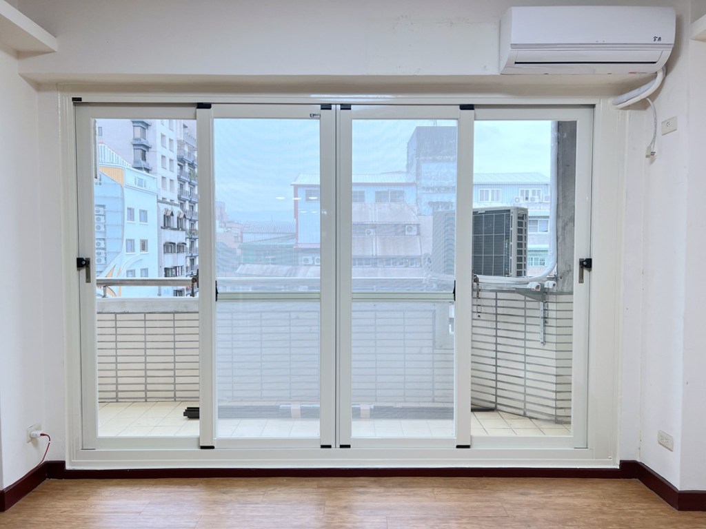 業主家舊型四拉落地窗,要更換氣密落地窗。業主希望新落地窗能讓室內有明亮光線,同時不要遮蔽視野。建議連同冷氣下方的大塊固定玻璃全部拆除,向外作一完整四拉落地氣密窗。另將冷氣管線整理至側邊,側邊加裝鋁板,挖孔讓冷氣管線通過。玻璃選用5mm透明玻璃+5mm透明膠合安全玻璃,採用包框乾式施工法,只需半日即可完成。