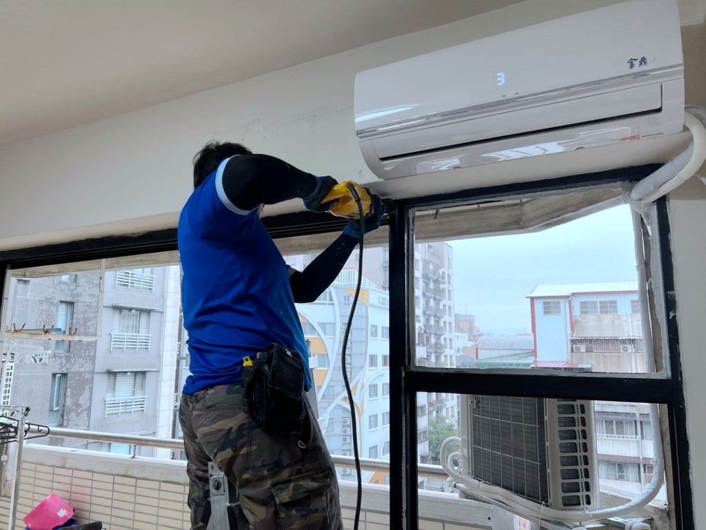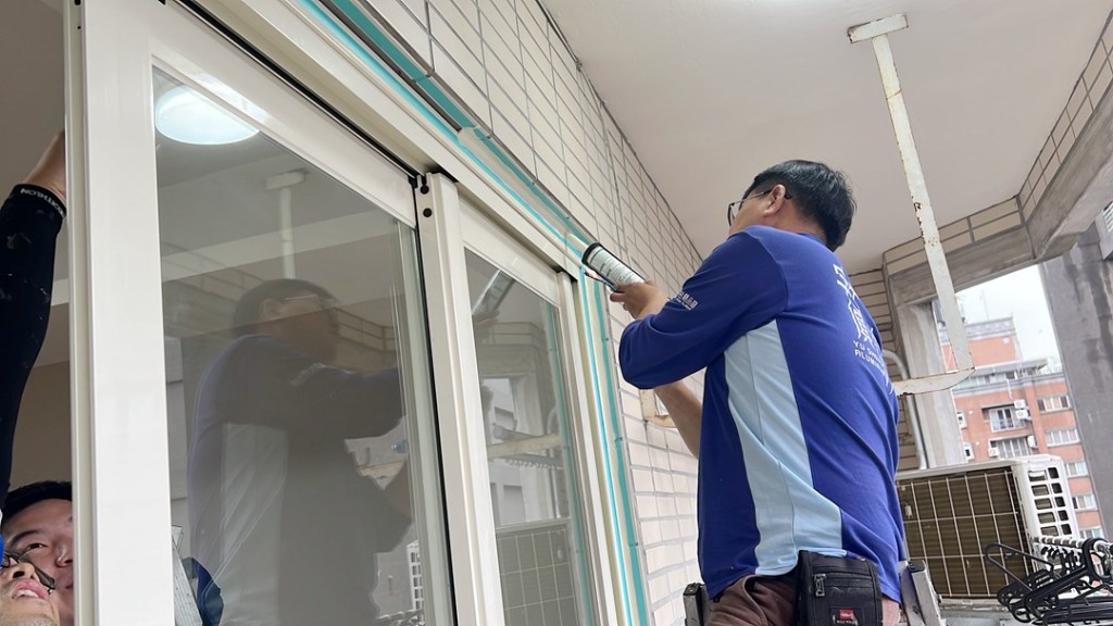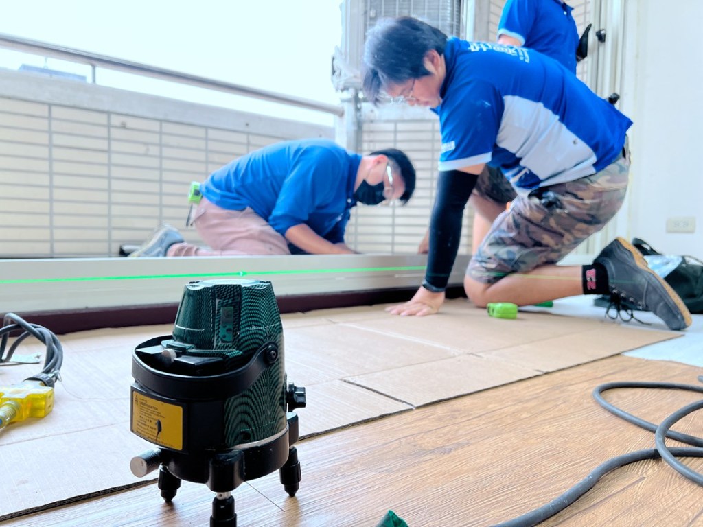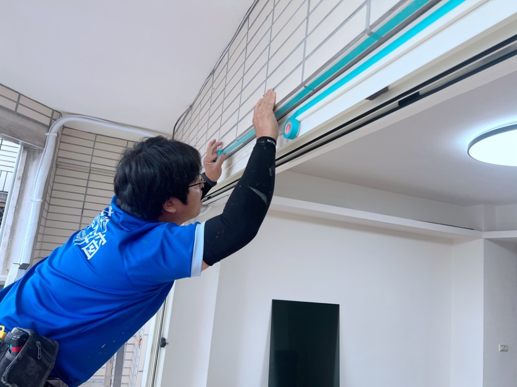 業主家舊型四拉落地窗,要更換氣密落地窗。業主希望新落地窗能讓室內有明亮光線,同時不要遮蔽視野。建議連同冷氣下方的大塊固定玻璃全部拆除,向外作一完整四拉落地氣密窗。另將冷氣管線整理至側邊,側邊加裝鋁板,挖孔讓冷氣管線通過。玻璃選用5mm透明玻璃+5mm透明膠合安全玻璃,採用包框乾式施工法,只需半日即可完成。