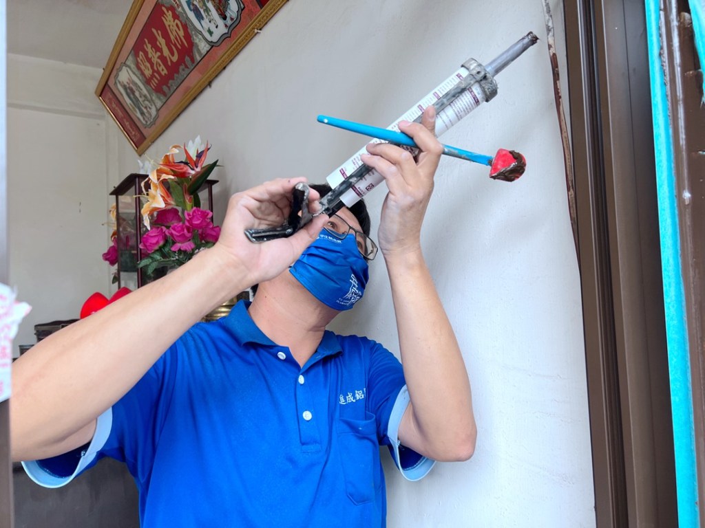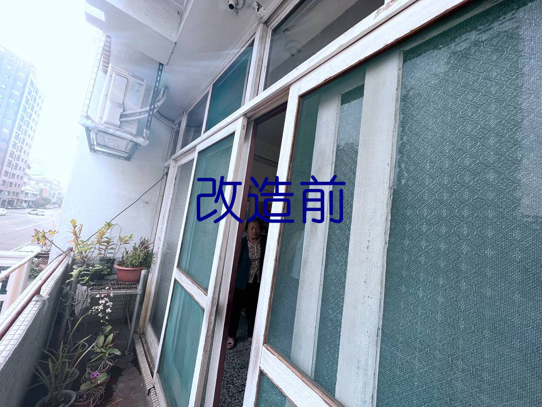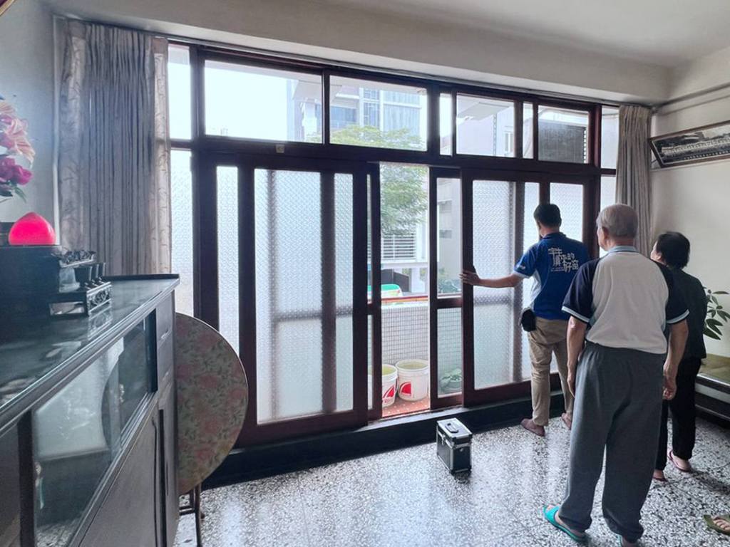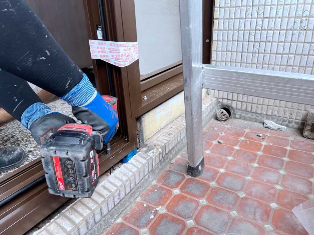 業主家木門使用多年損壞且木框遭白蟻入侵被啃咬恐有安全之虞,建議整座拆除後依原樣式作四拉落地氣密窗+二側固定玻璃窗,以溼式施工法安裝,地磚破損以水泥填補。