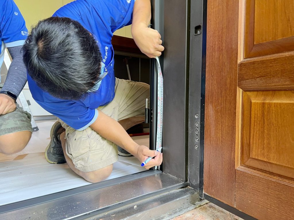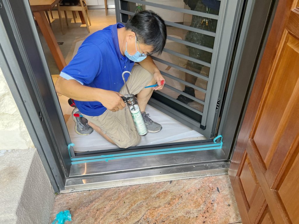 業主家後院自然環境多蚊蟲,原在後門加裝折疊紗門,但常進出開啟容易損壞,想改裝設多段式微調三合一通風門。三合一通風門兼具紗門、玻璃門及防盜門的功能。