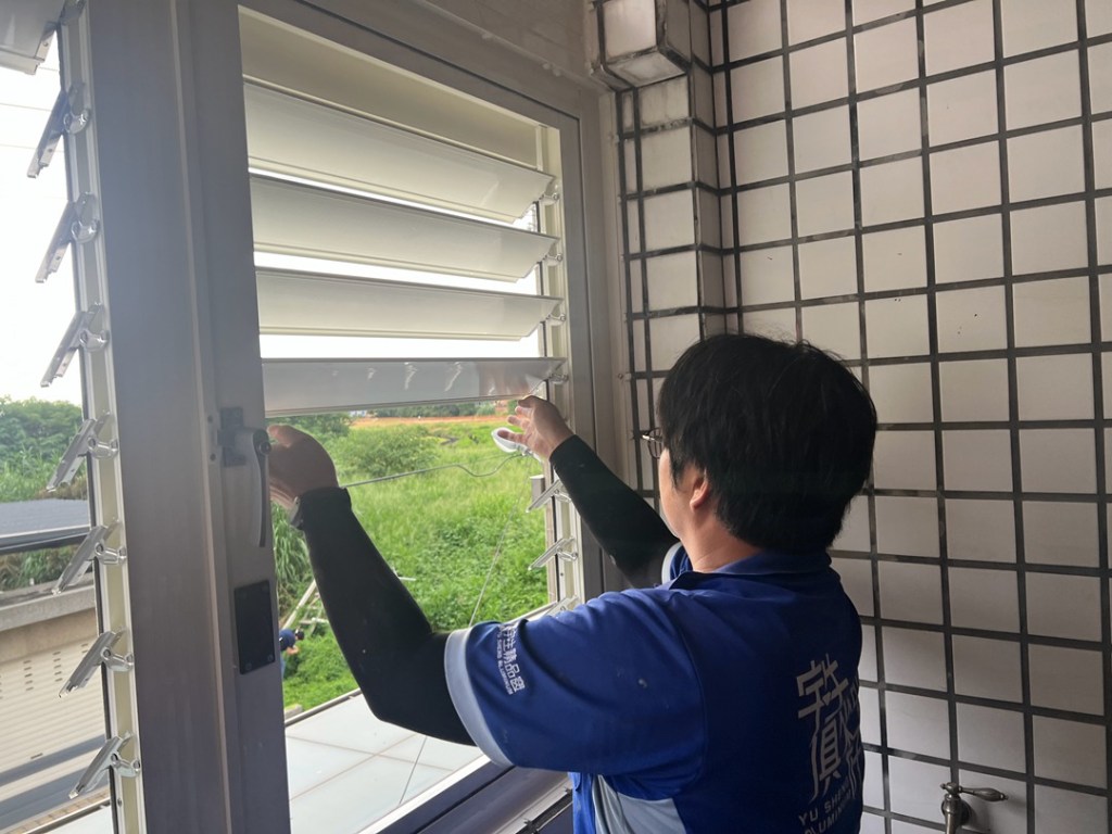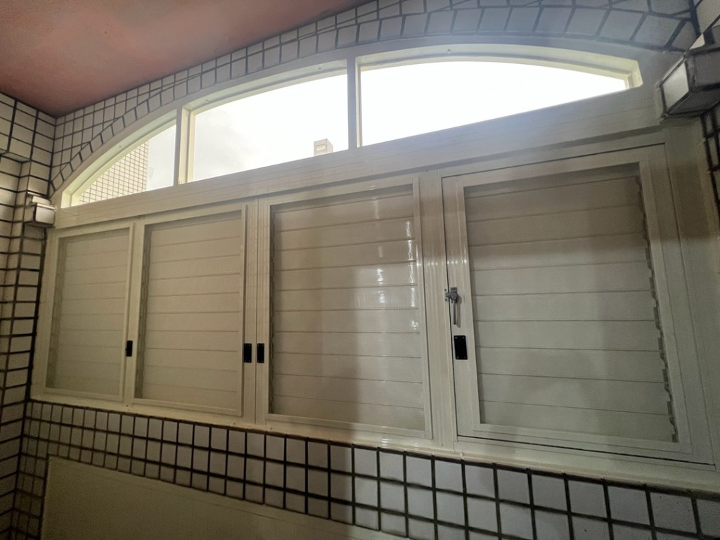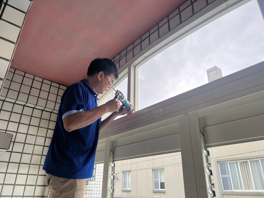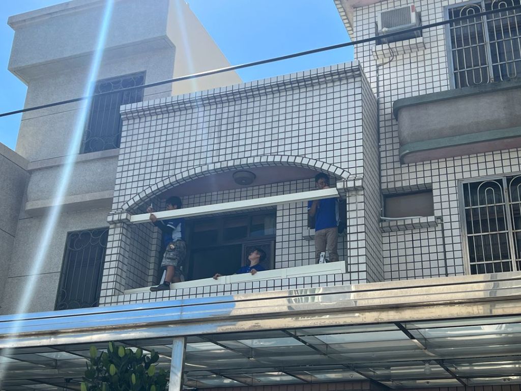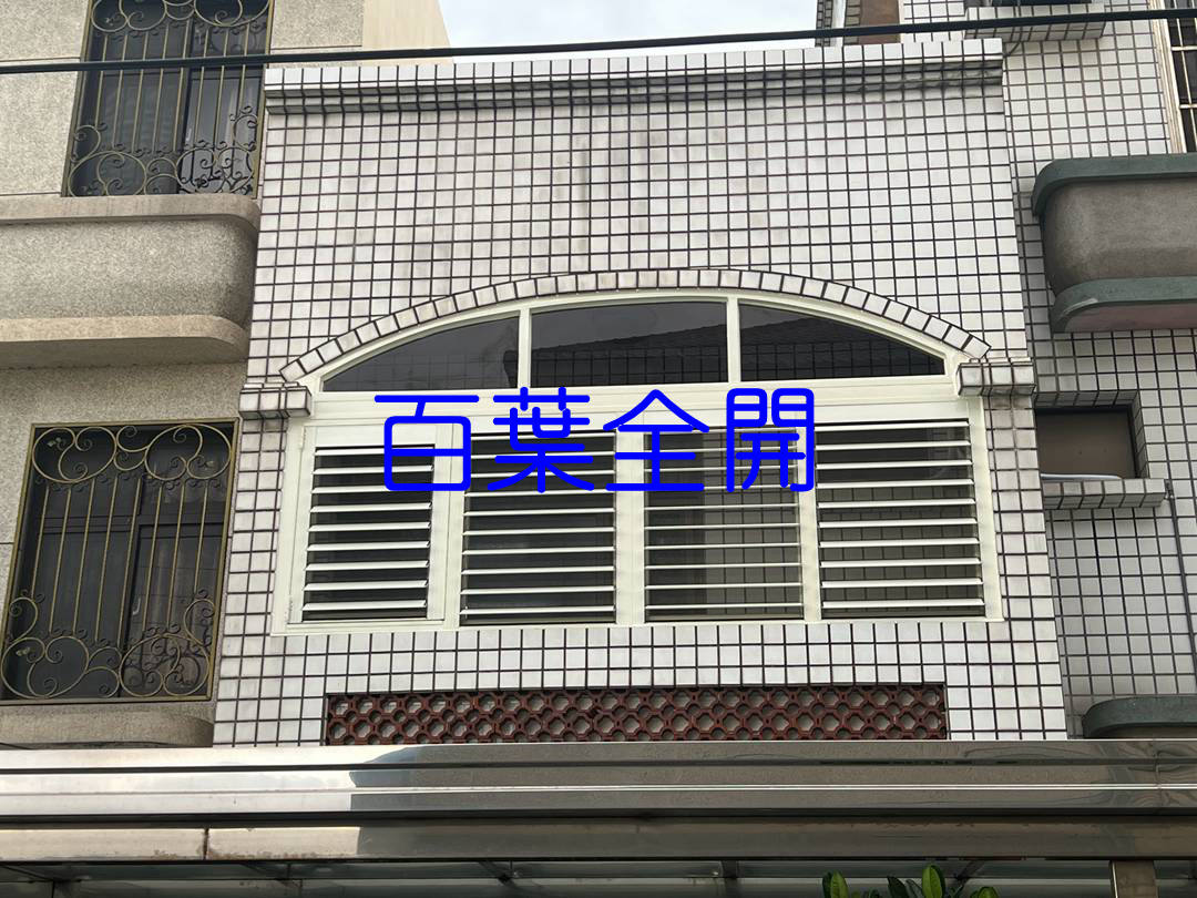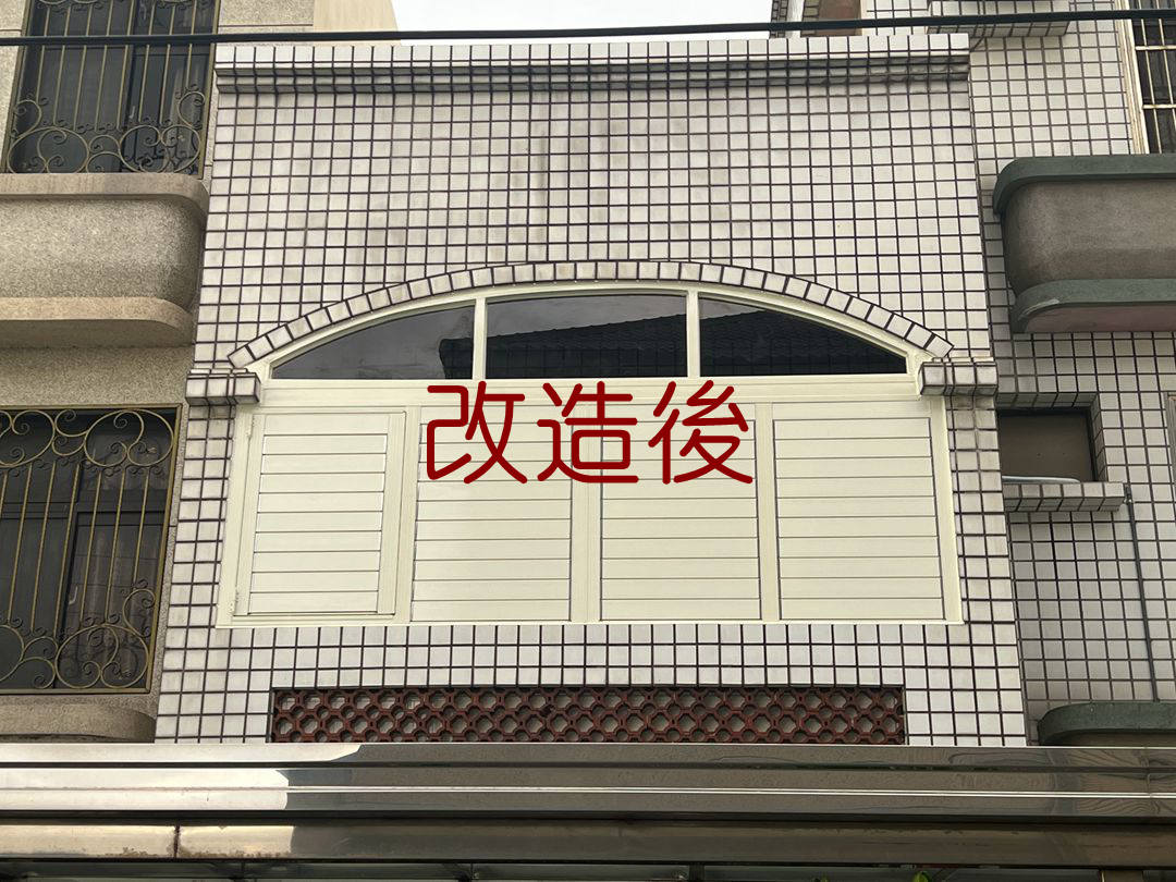 難度最高的頂部圓拱造型,需現場精密測量並量身打造,才能達到美觀與防水密合度最佳要求,業主住宅面西,有西曬的困擾,因為裝設鋁百葉窗,白天進光量已減弱一半。業主希望圓拱部份安裝茶色玻璃,讓室內保留些許陽光照入。下牆面樓空磚造型牆則以鋁板密封擋雨,鋁百葉橫樑則加強支撐可抵擋強颱,施工一日可完成。