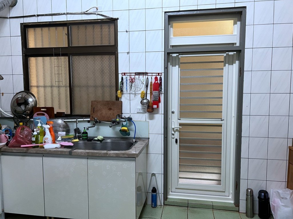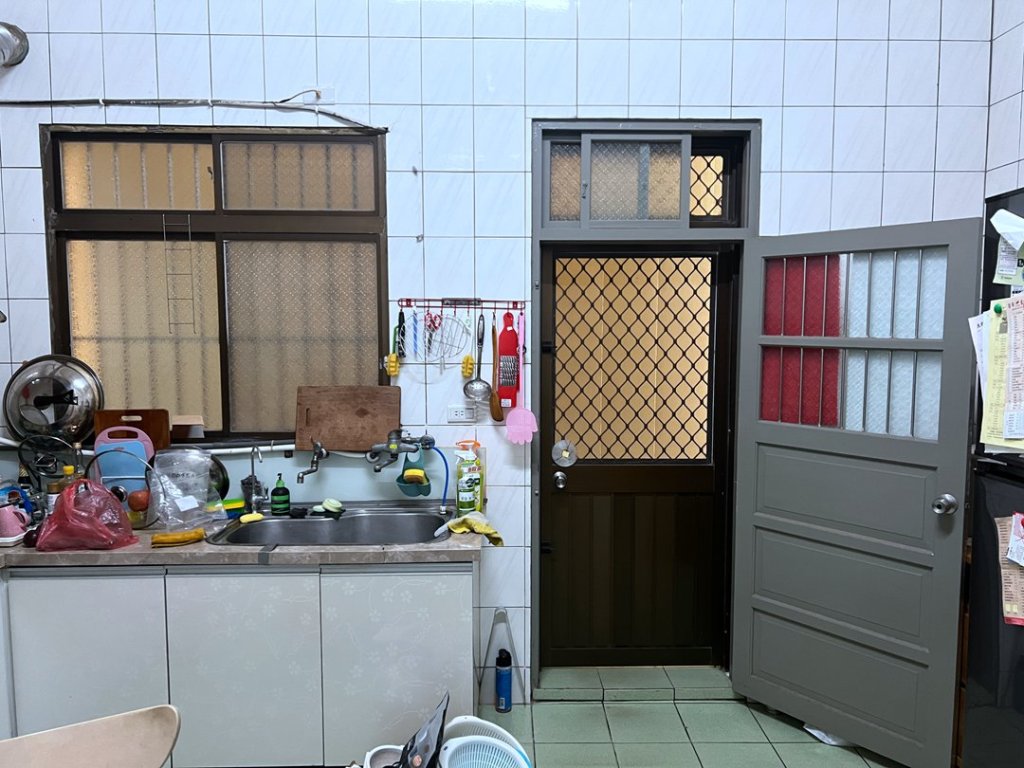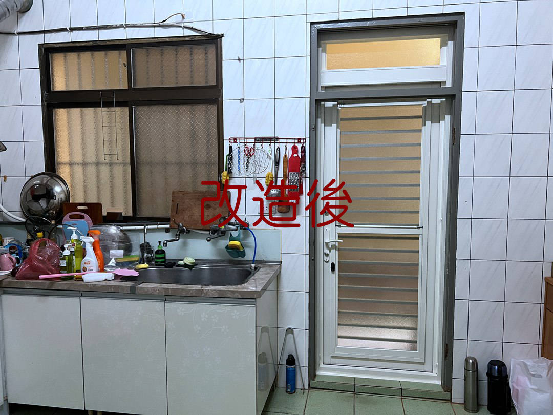 業主家廚房後門原為一道傳統紗門加木門,為了使用更方便,想改裝設多段式微調三合一通風門。 業主原決定拆除外紗門保留室內木門,施作過程中業主決定將木門一併拆除。