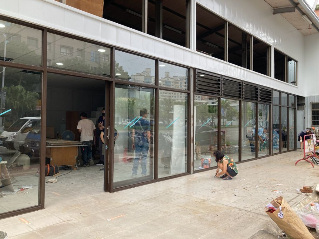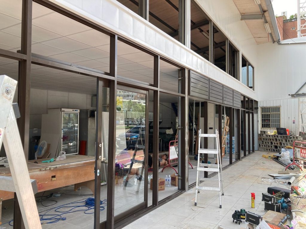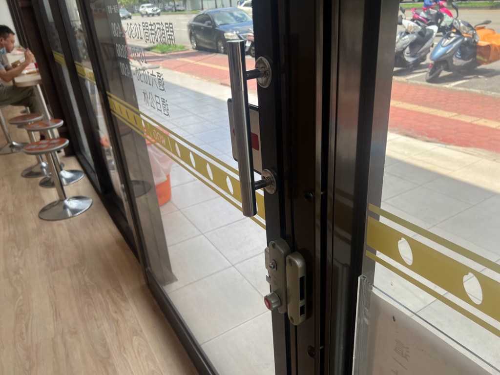此次業主選擇咖啡色鋁門,全數採用強化玻璃的安全設計。懸吊式拉門選配門弓器,半自動關門設計,讓營業空間可常保乾淨減少落塵,消費更安心。