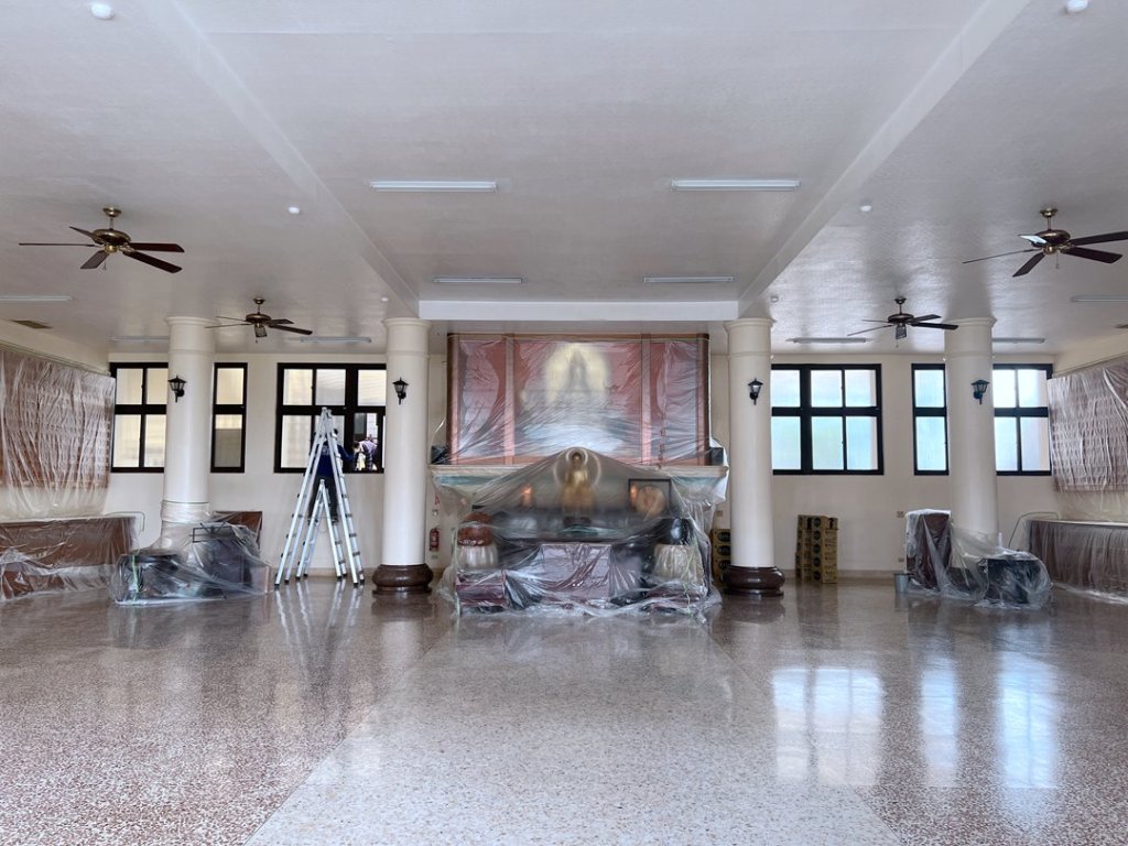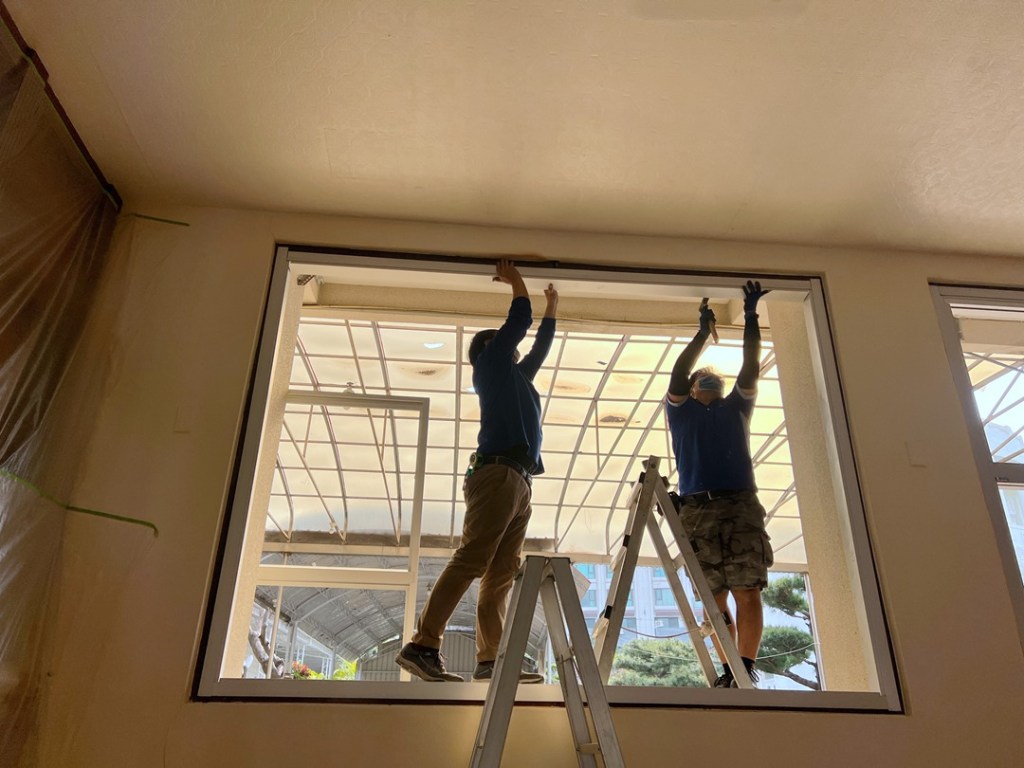 佛寺大殿整修, 大殿後二側的塑鋼窗長久未開啟,原來加裝大片玻璃阻風,希望更換窗戶後能保留採光,但不需要再開啟。