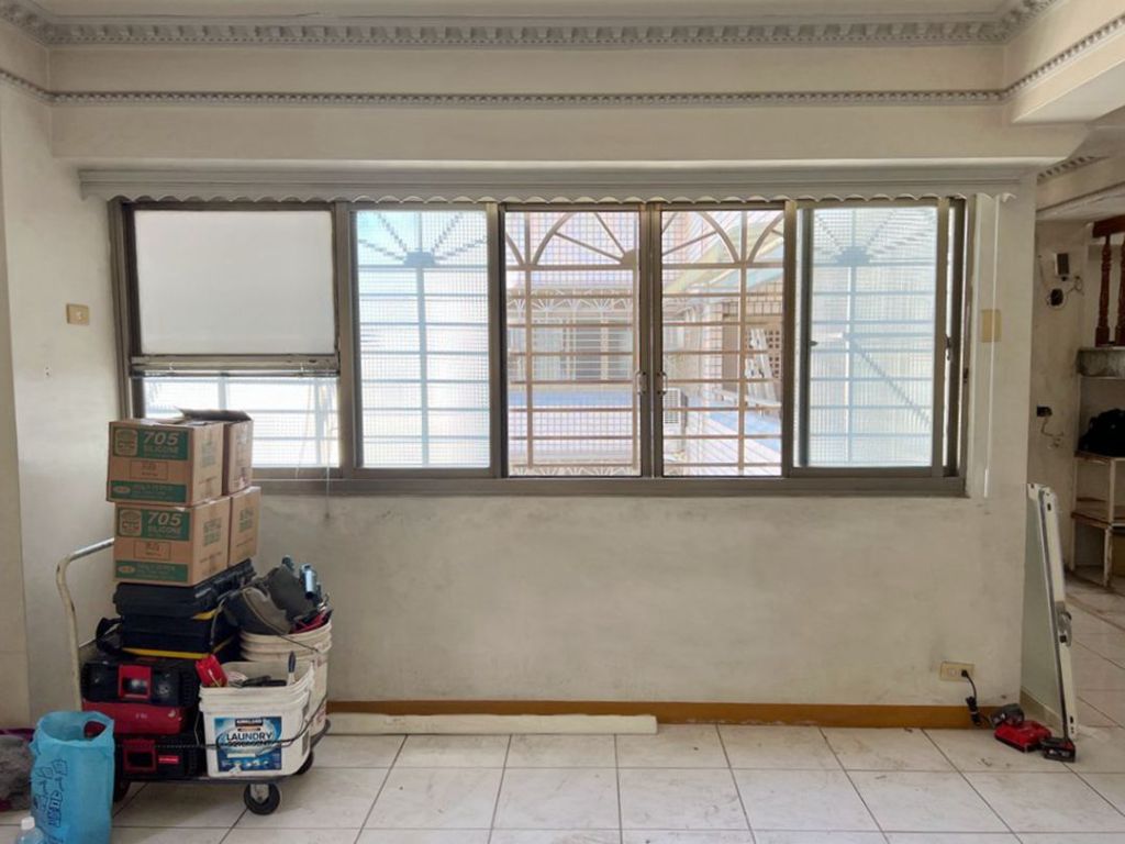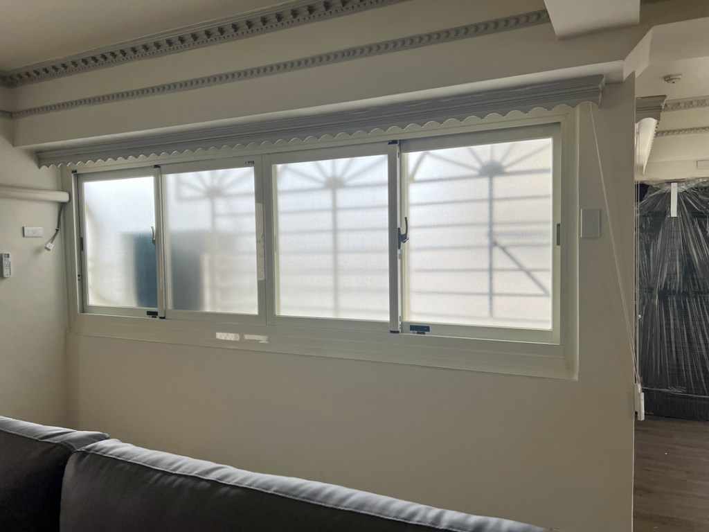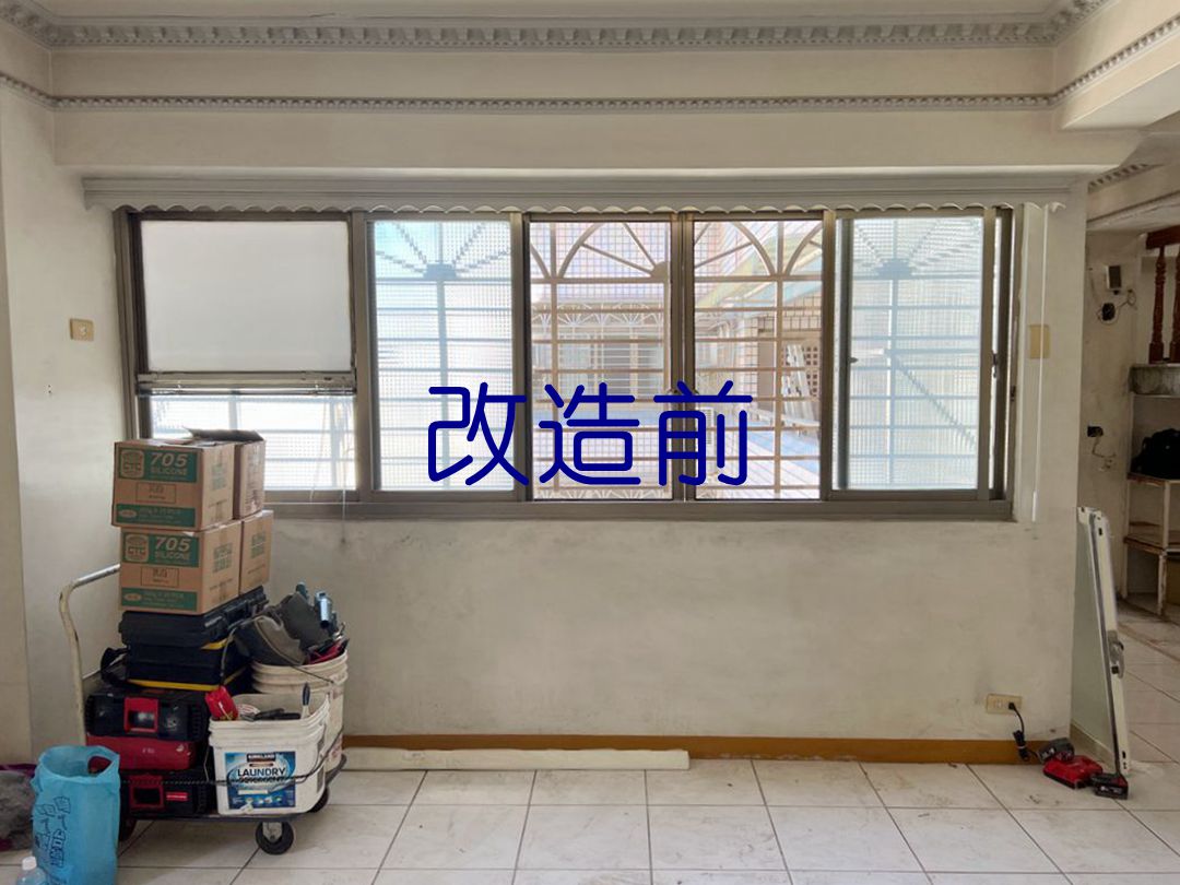 業主客廳早年已作陽台外推,原裝設的舊式鋁窗要改氣密窗。側邊原留窗口放窗型冷氣,現已不用可全打通。建議採用四拉型氣密窗,讓窗台的面寬能享有最大採光度及最佳視野。氣密窗以乳白色鋁窗搭配銀霞玻璃,銀霞玻璃採光度佳,乳白色氣密窗有讓室內空間放大感。