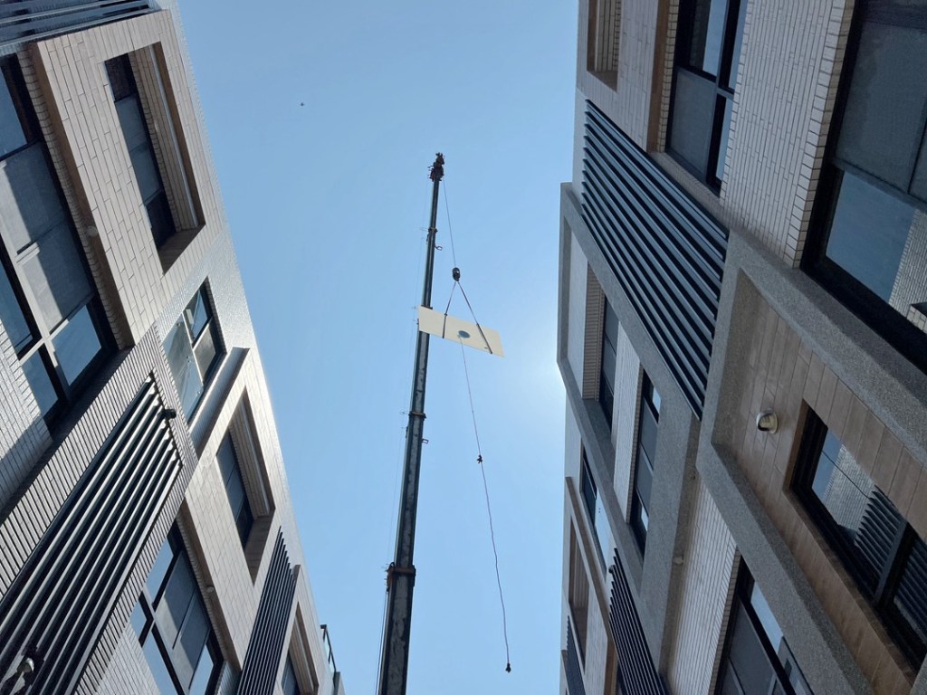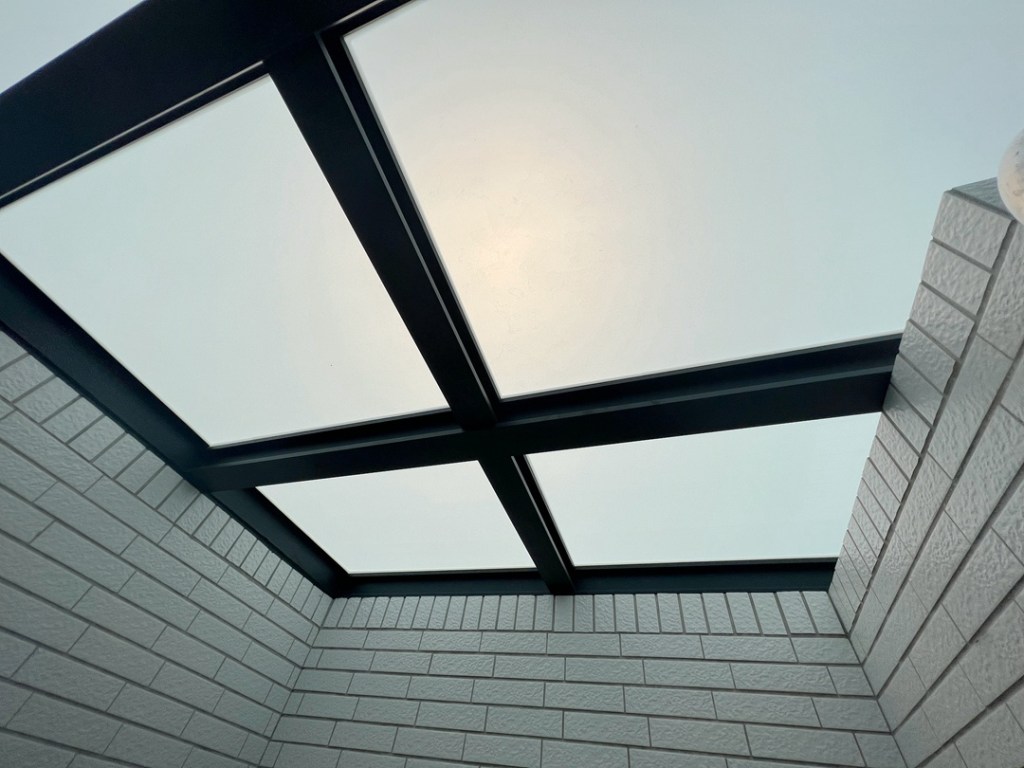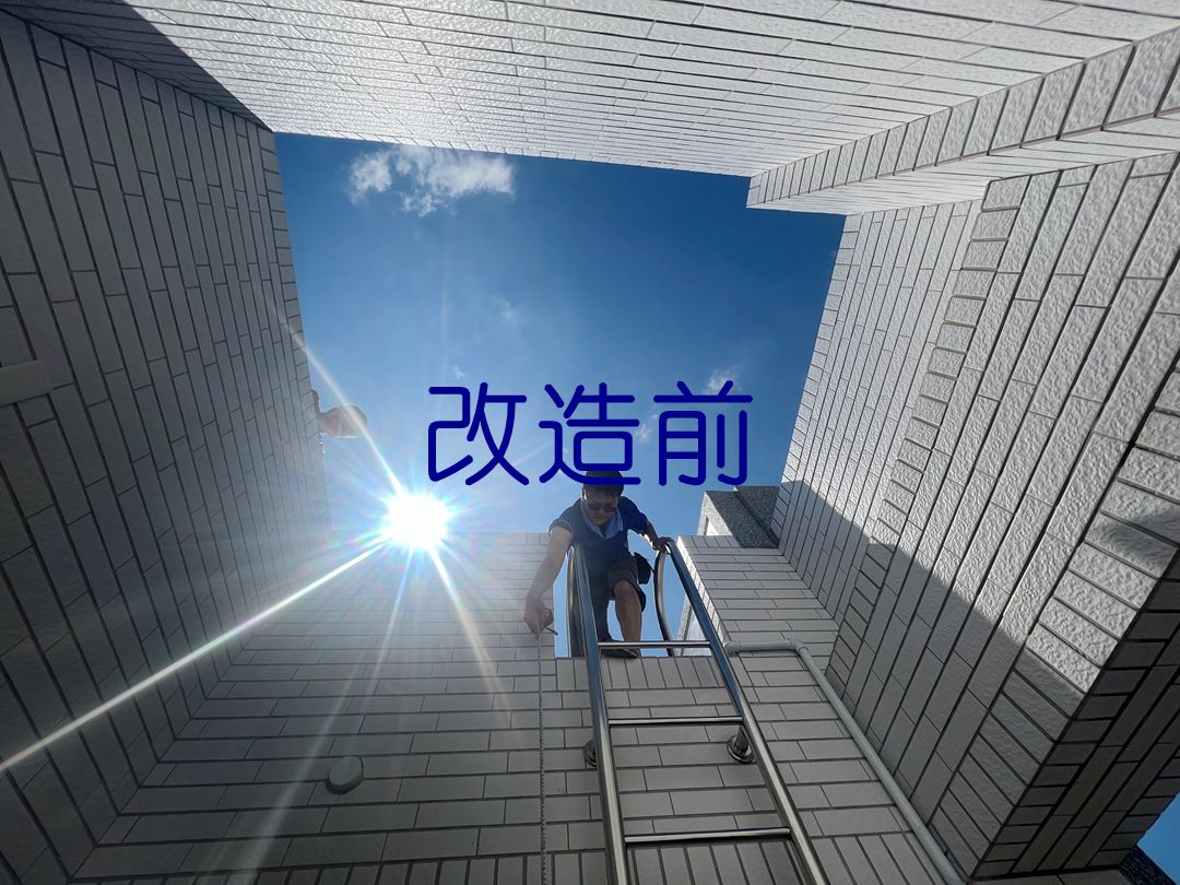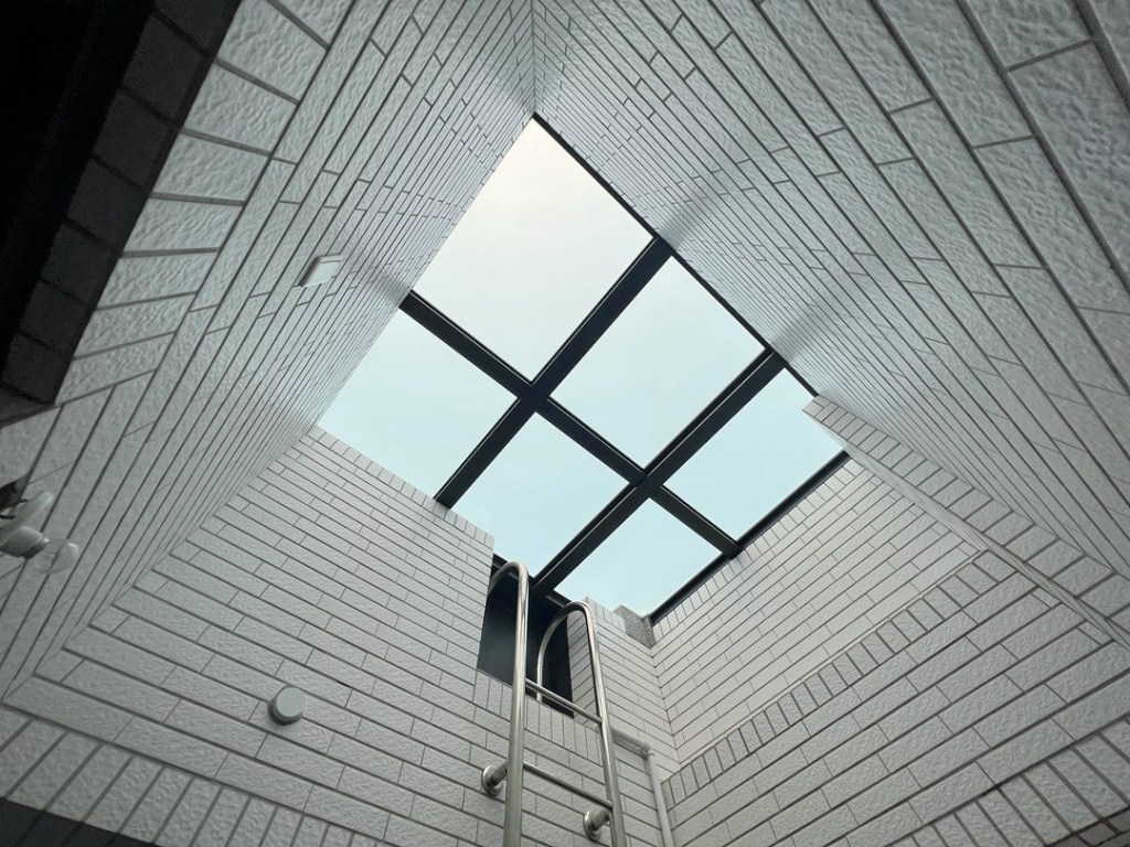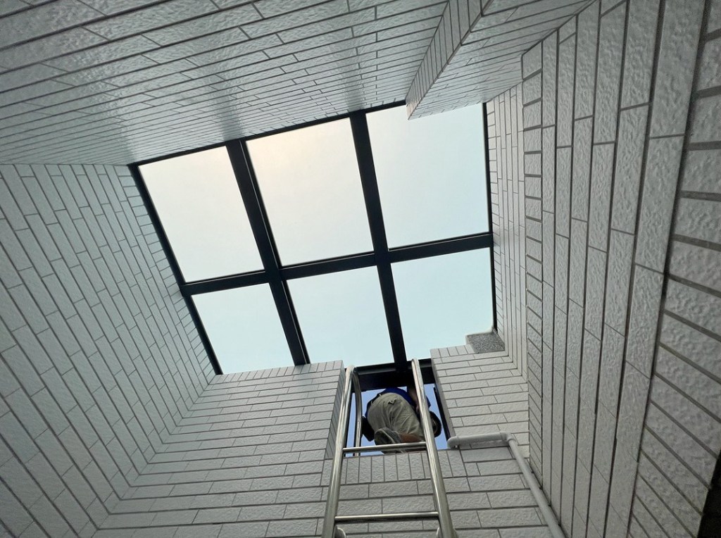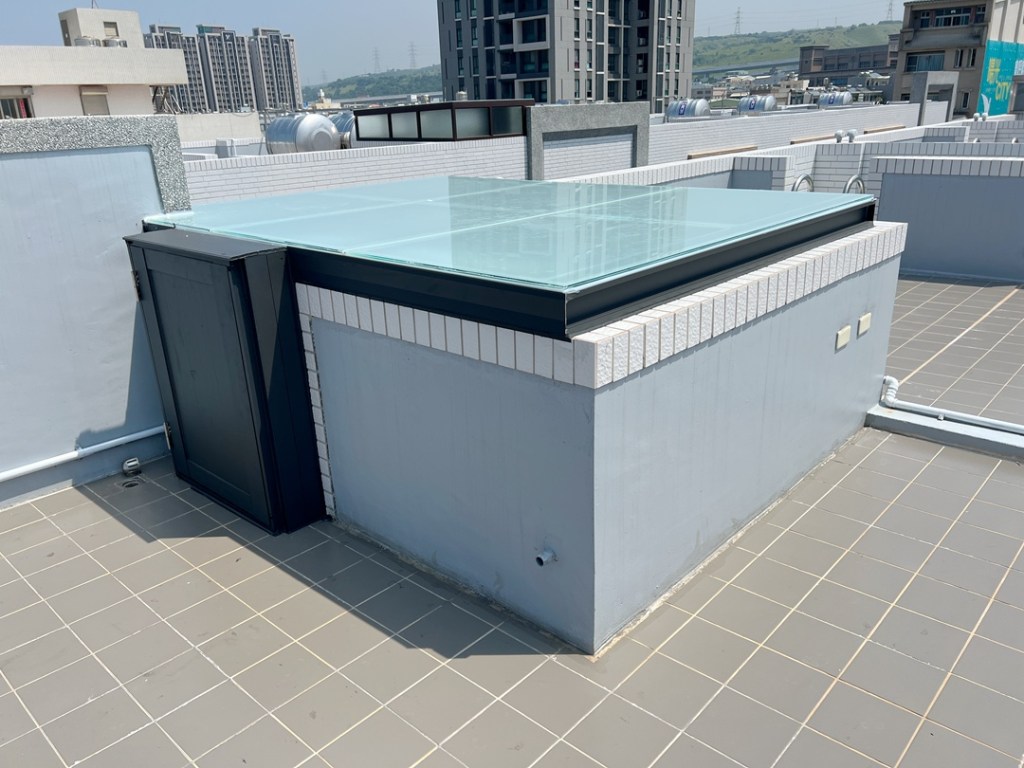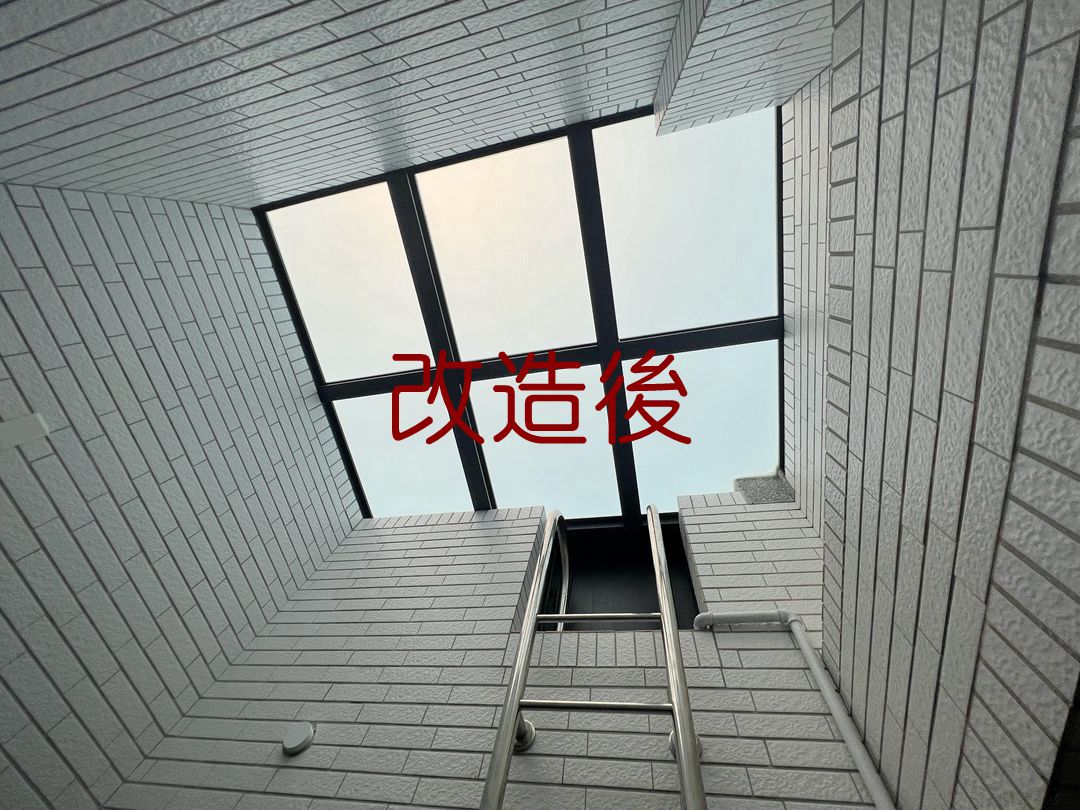 業主透天自宅,空間原設計為活動梯架在天井上頂樓。業主希望能將天井加採光罩防止雨水潑入,並於活動出入口增設一鋁門,可上鎖防盜。