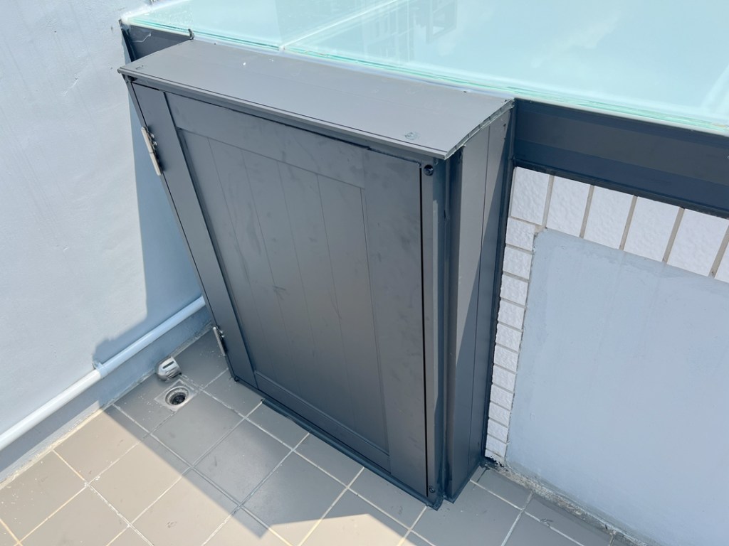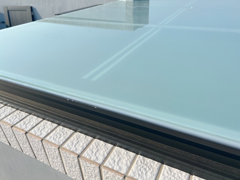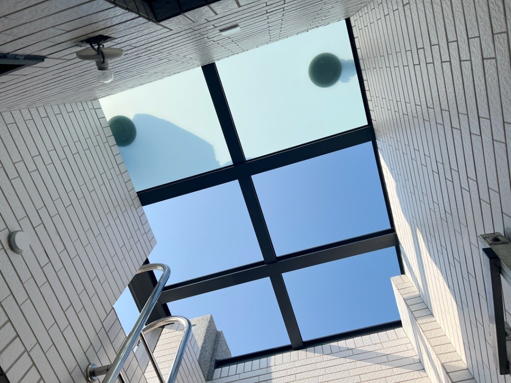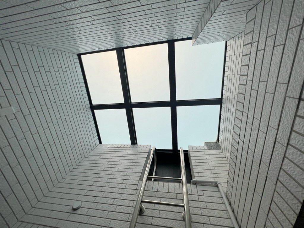 上層玻璃採用白膜膠合安全玻璃,保有隱私和隔熱。側邊活動出入口,設計一活動鋁門外開,平時可在內上鎖。