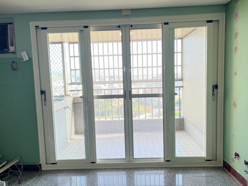 業主購中古屋重新裝潢,原客廳的落地窗有開天窗,讓整個視野被壓縮。建議業主重作落地窗,並直接改作四拉型氣密落地窗。乳白色氣密窗搭配透明玻璃,可讓室內空間感覺放大。