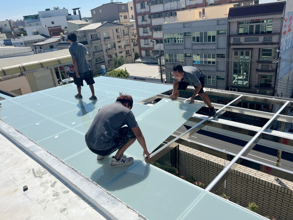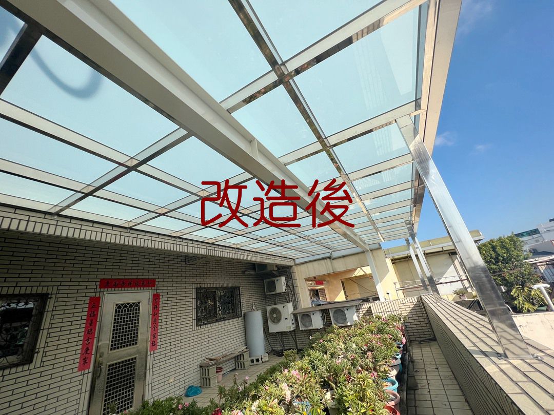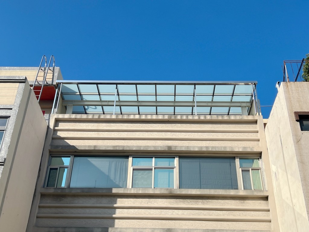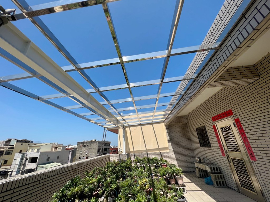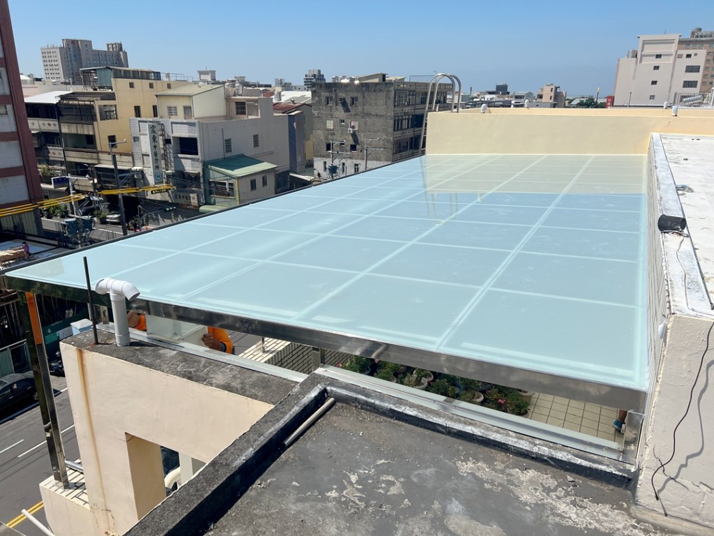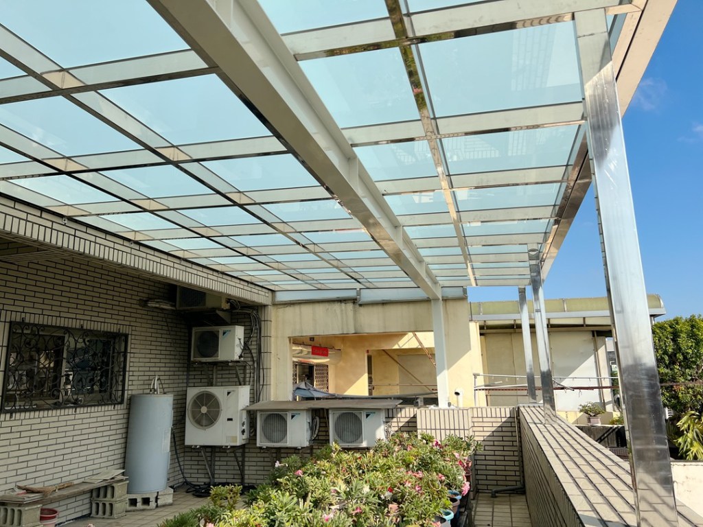 業主頂樓前後大陽台,希望作採光罩。因面積較大業主決定採用不銹鋼支架,並搭配5mm+5mm膠合安全玻璃。