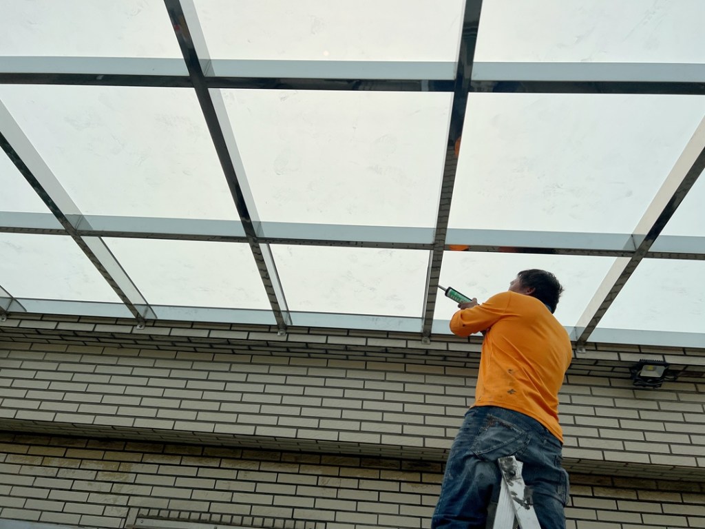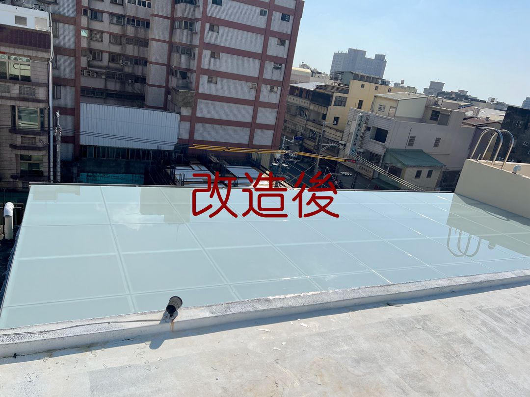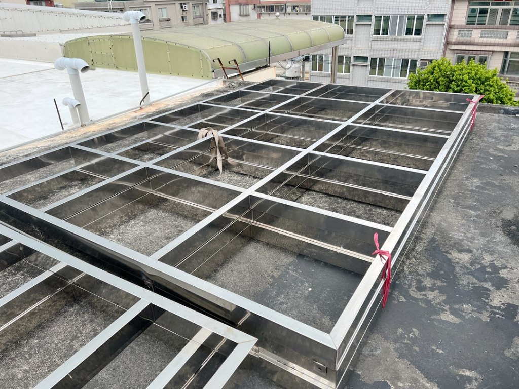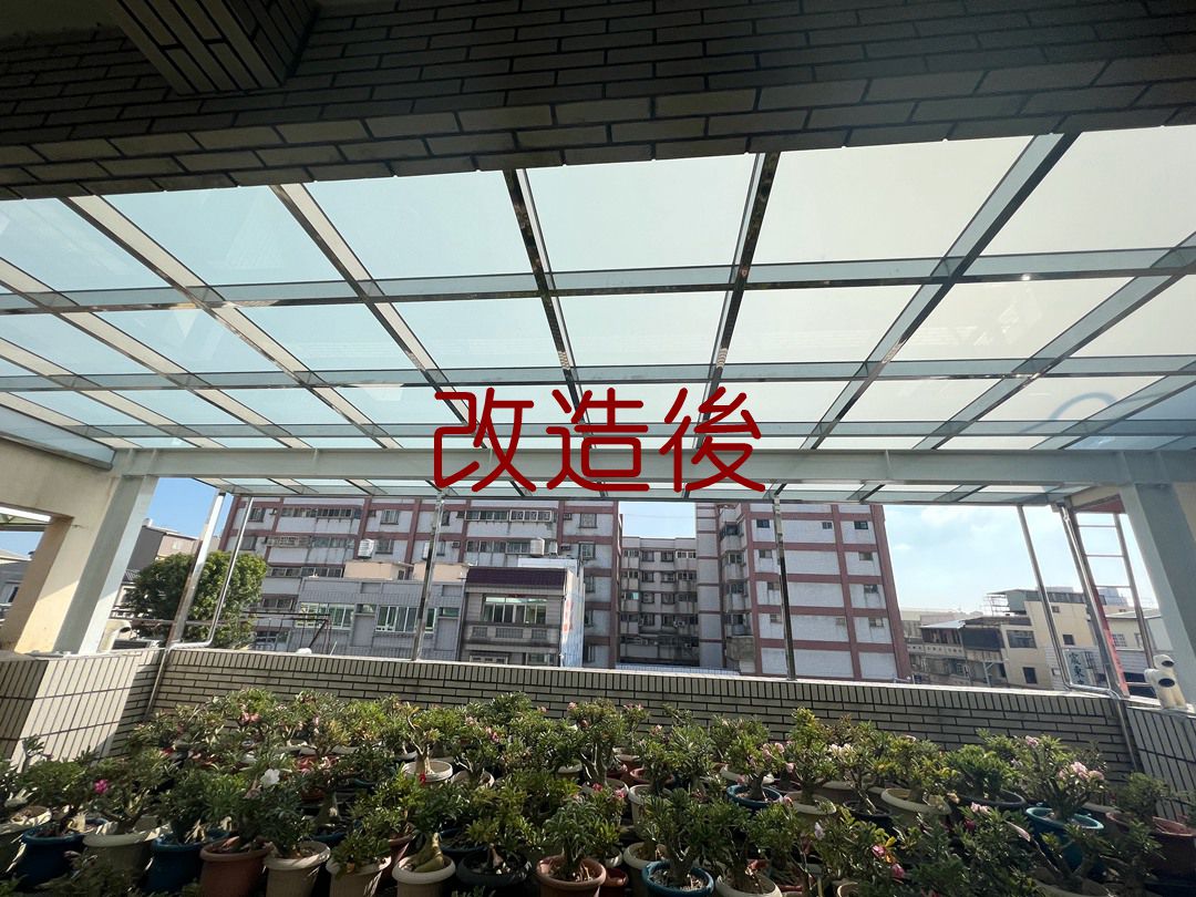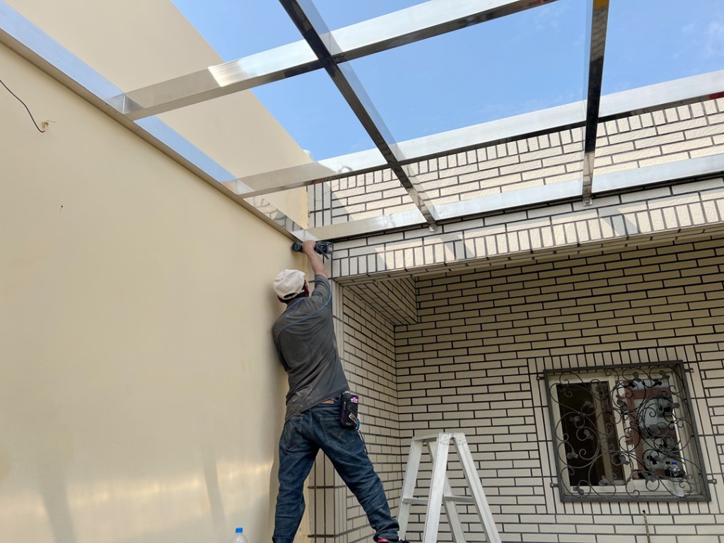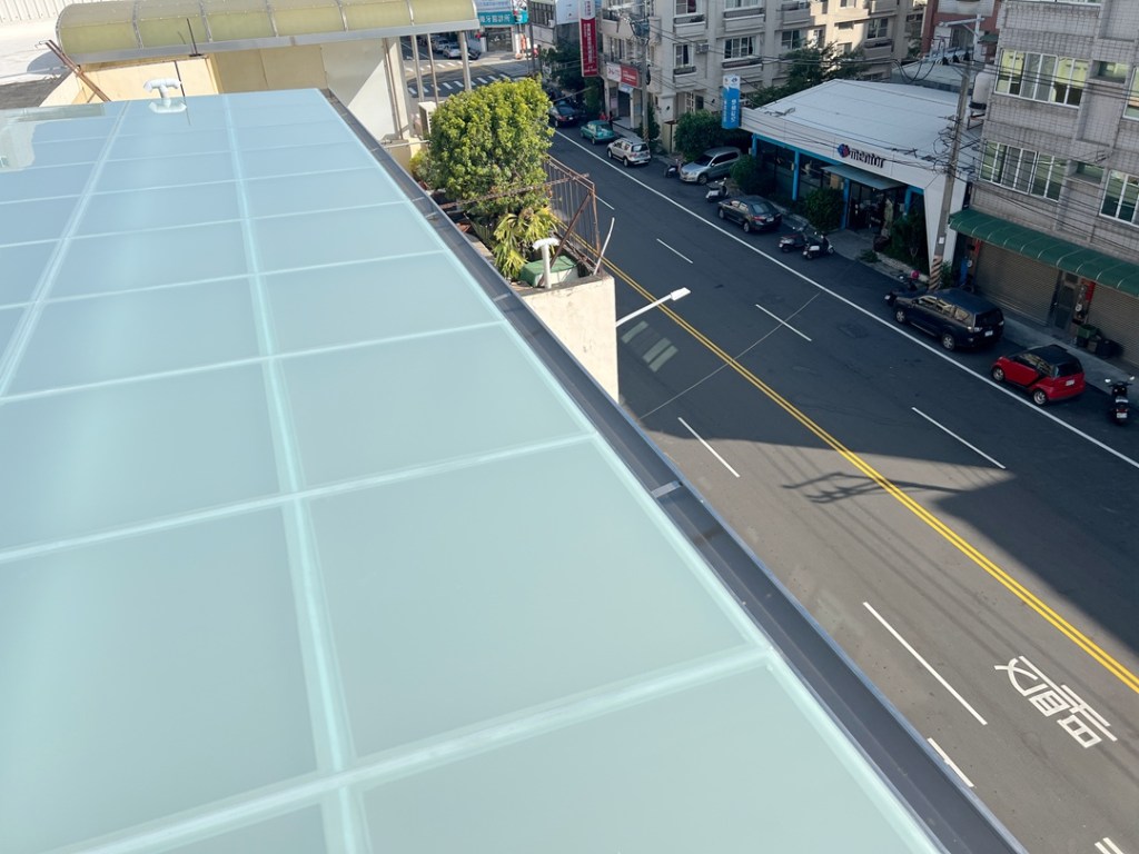 業主頂樓前後大陽台,希望作採光罩。因面積較大業主決定採用不銹鋼支架,並搭配5mm+5mm膠合安全玻璃。
