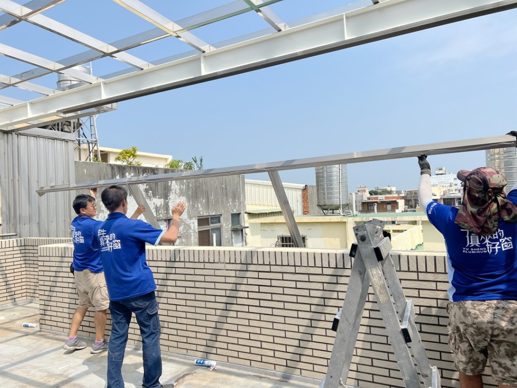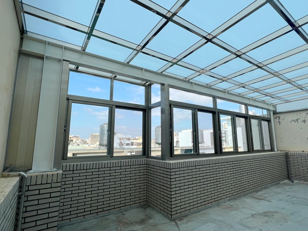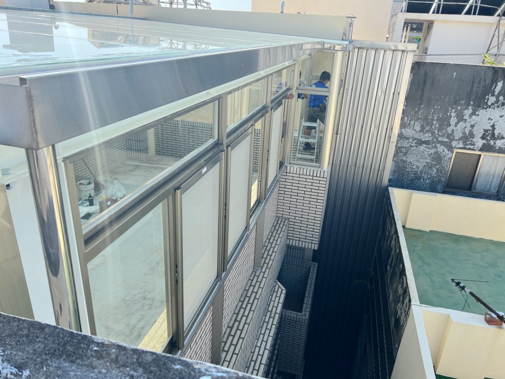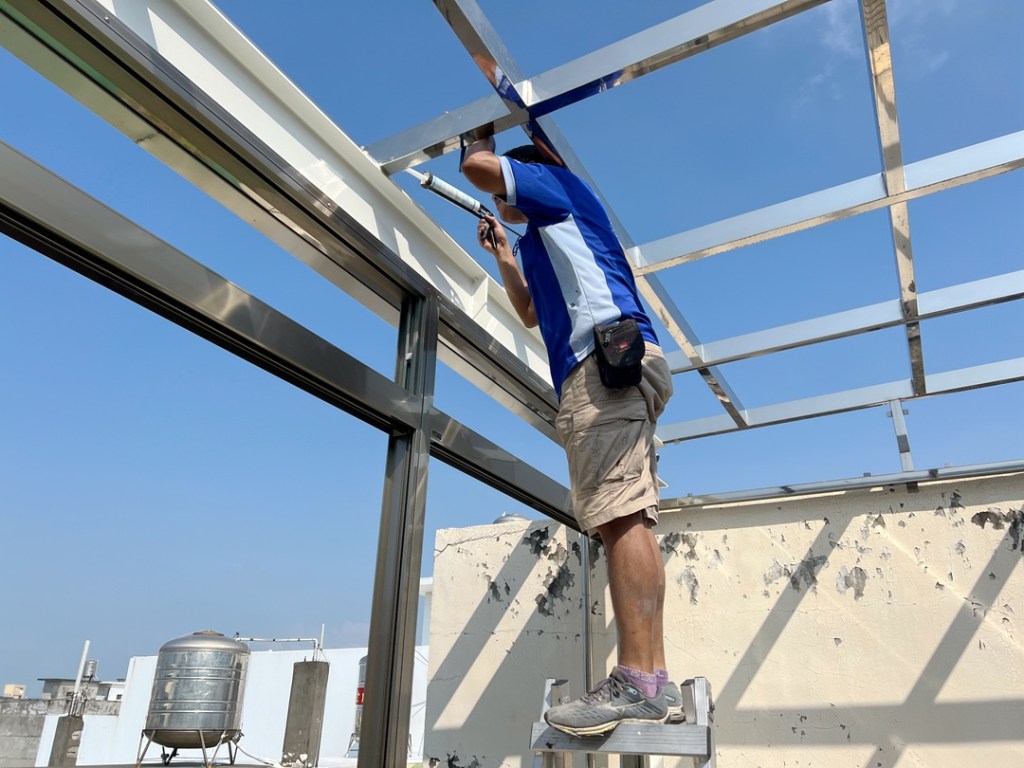 後陽台部份,除了採用採光罩專用不銹鋼骨架搭建,業主更要求正面以氣密窗全封,阻擋強風,以便使用。