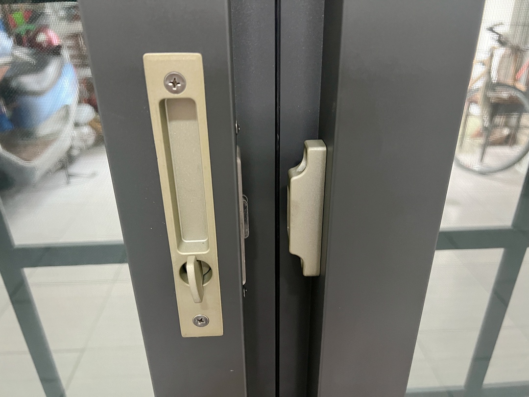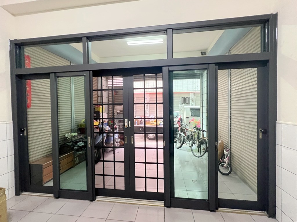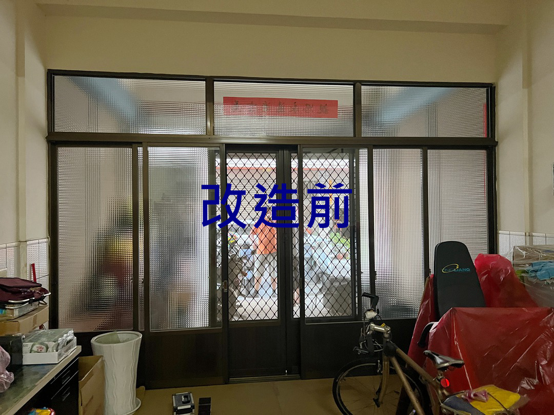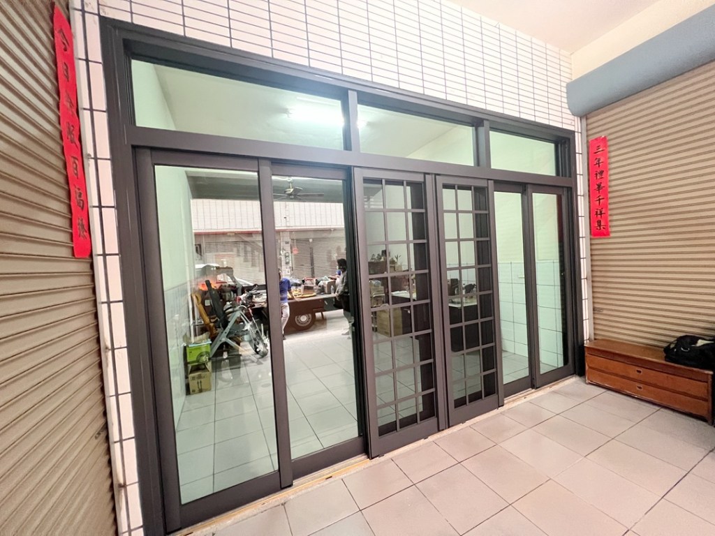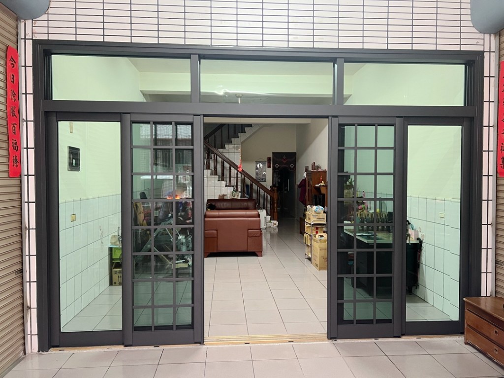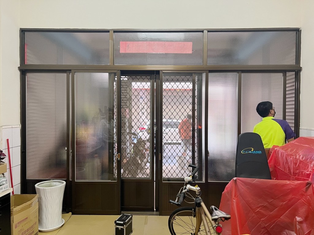 業主一樓客廳原為傳統落地門,冬天冷風強勁,希望改為防風保暖的氣密門窗。上開天氣窗不常開啟則改為固定玻璃,保留光線不落塵,紗門應業主喜好,加裝鋁格。落地窗的玻璃採用綠色玻璃,搭配鐵灰砂色氣密落地門。