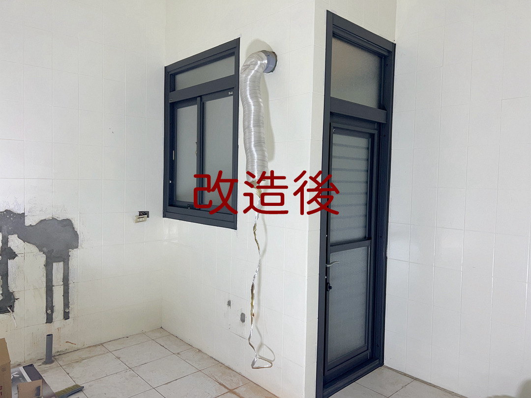 業主廚房重新整修,將舊鋁窗改氣密窗,後門原為傳統鋁門改三合一通風門,二個同日施工,當天完工可使用。