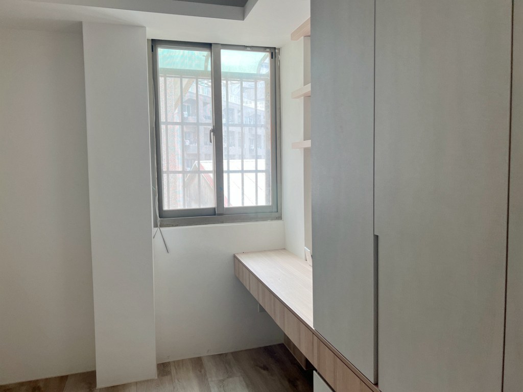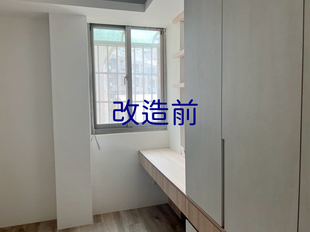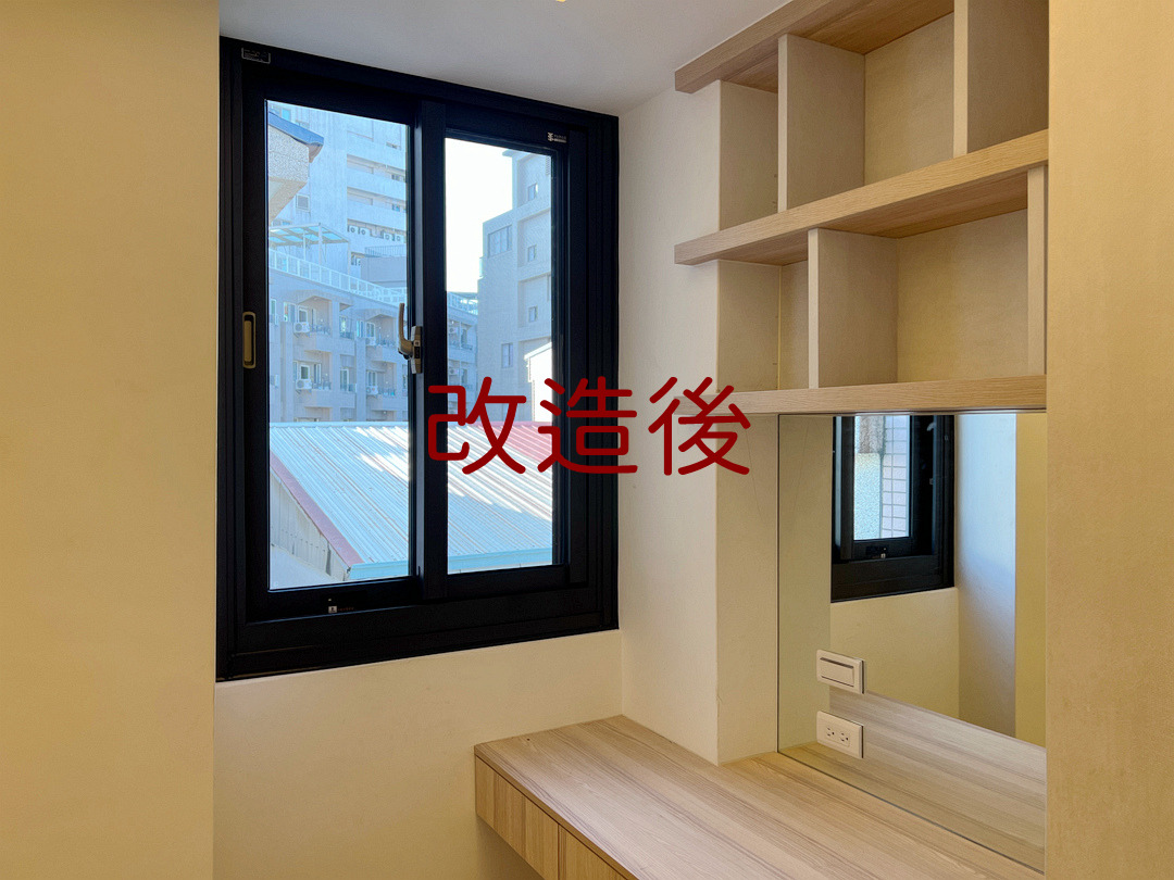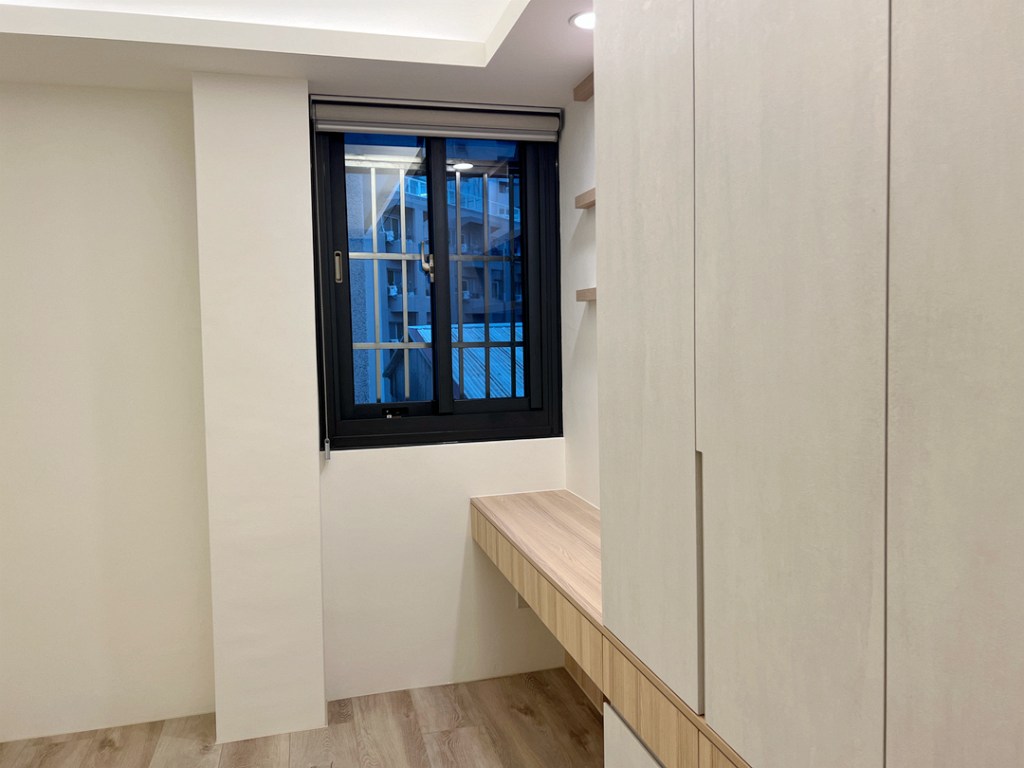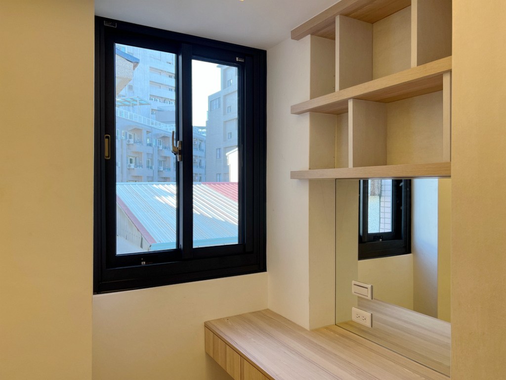 業主新購入位於台中北區中古屋,請設計師協助規劃重新設計房子。次臥的梳妝台旁更換氣密窗,玻璃採用透明玻璃,自然光線讓使用者化妝更自然。氣密窗設計,隔絕室外灰塵和噪音,讓室內保持乾淨。