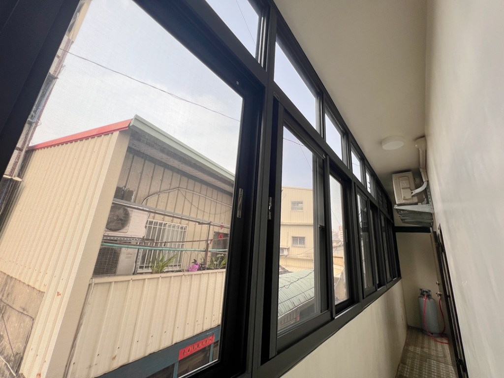 此次業主選用低調現代風的鐵灰砂色氣密窗搭配灰色玻璃。氣窗則採用固定玻璃和鋁百葉窗搭配,保持陽台通風。二側配合排氣管線固定於鋁板,乾淨耐用省空間。