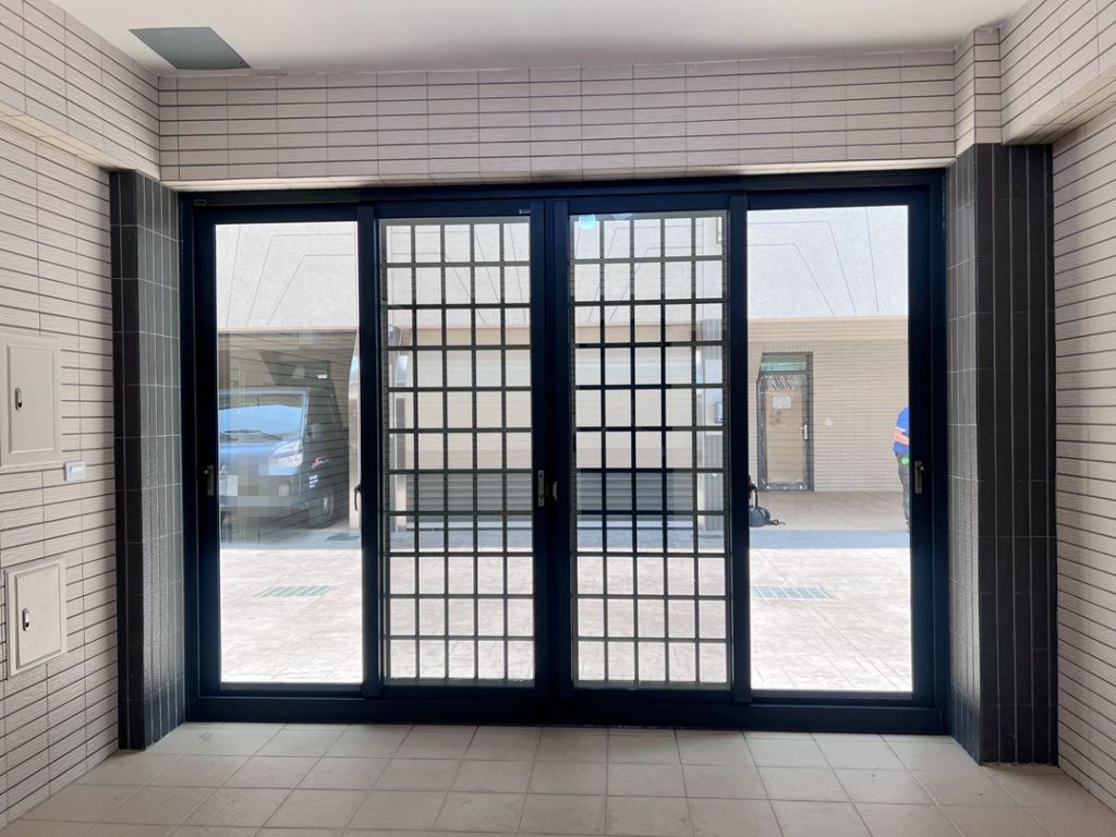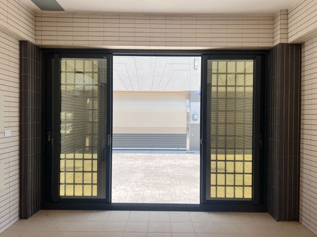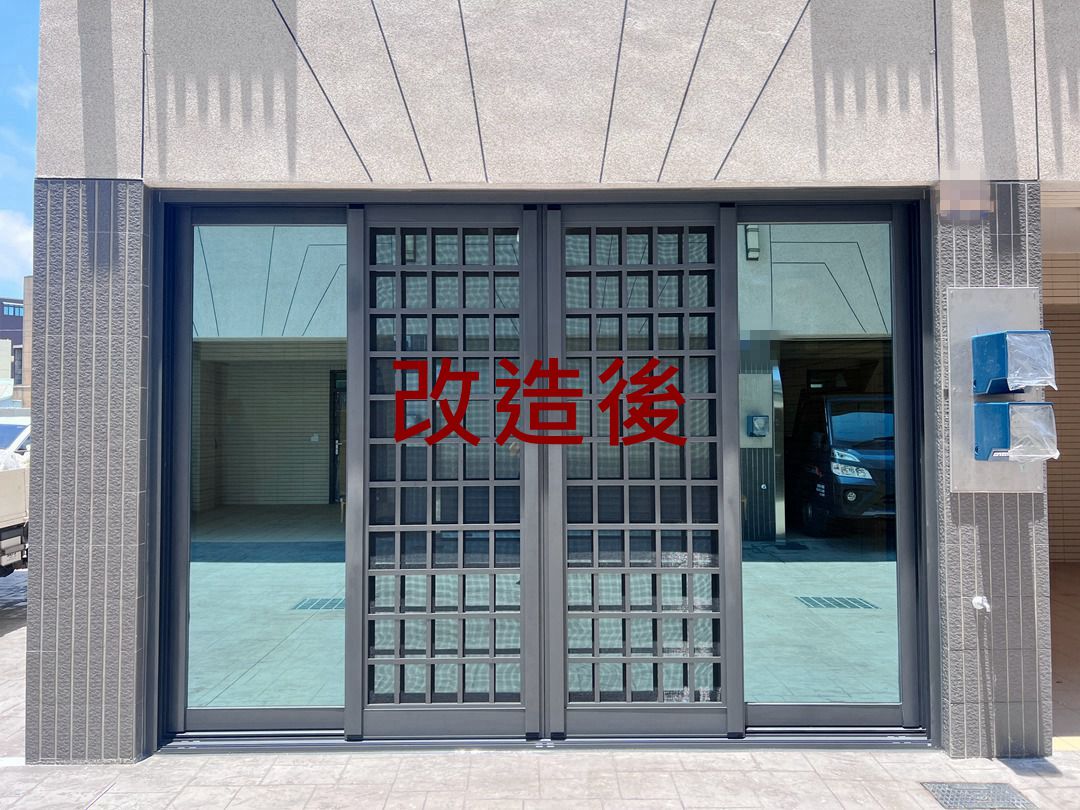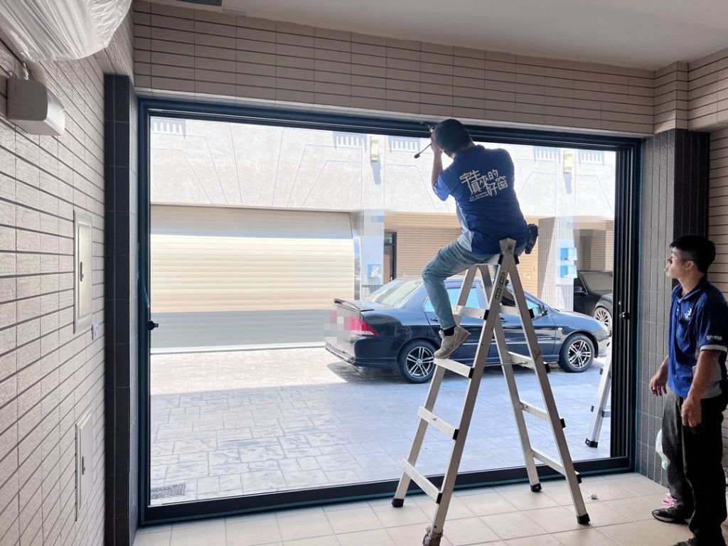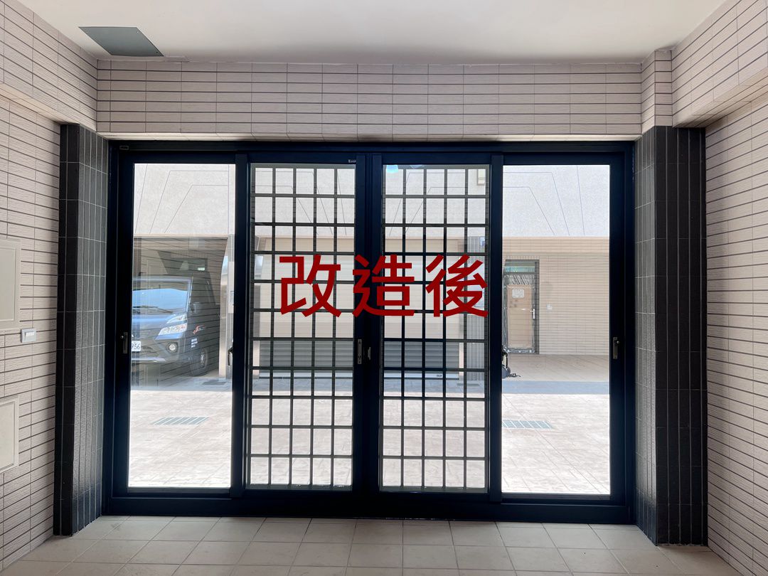 業主一樓空間要作為客廳,希望安裝氣密落地窗。考慮隱私和夏季炎熱,業主選用反射玻璃搭配鐵灰砂色落地窗。四拉型氣密落地窗,當天施工完成入住。