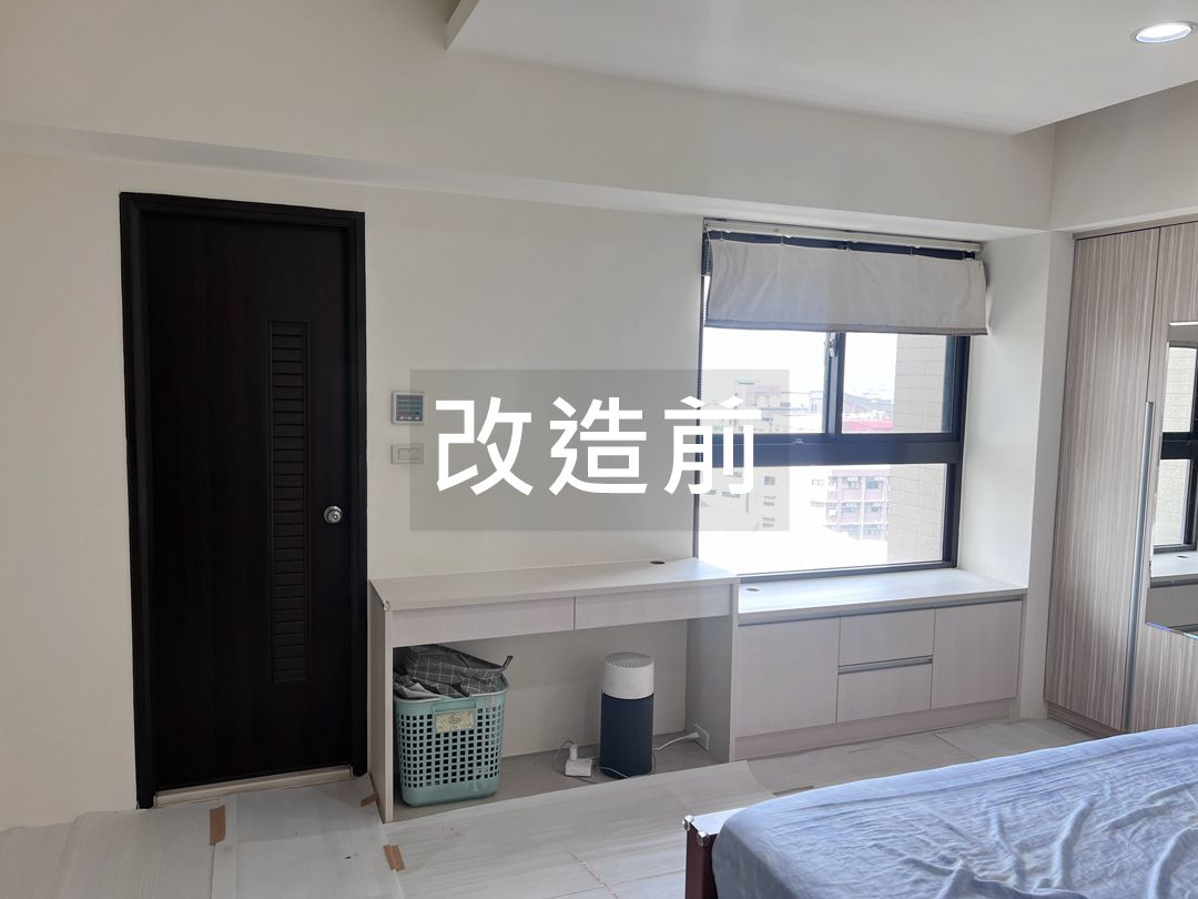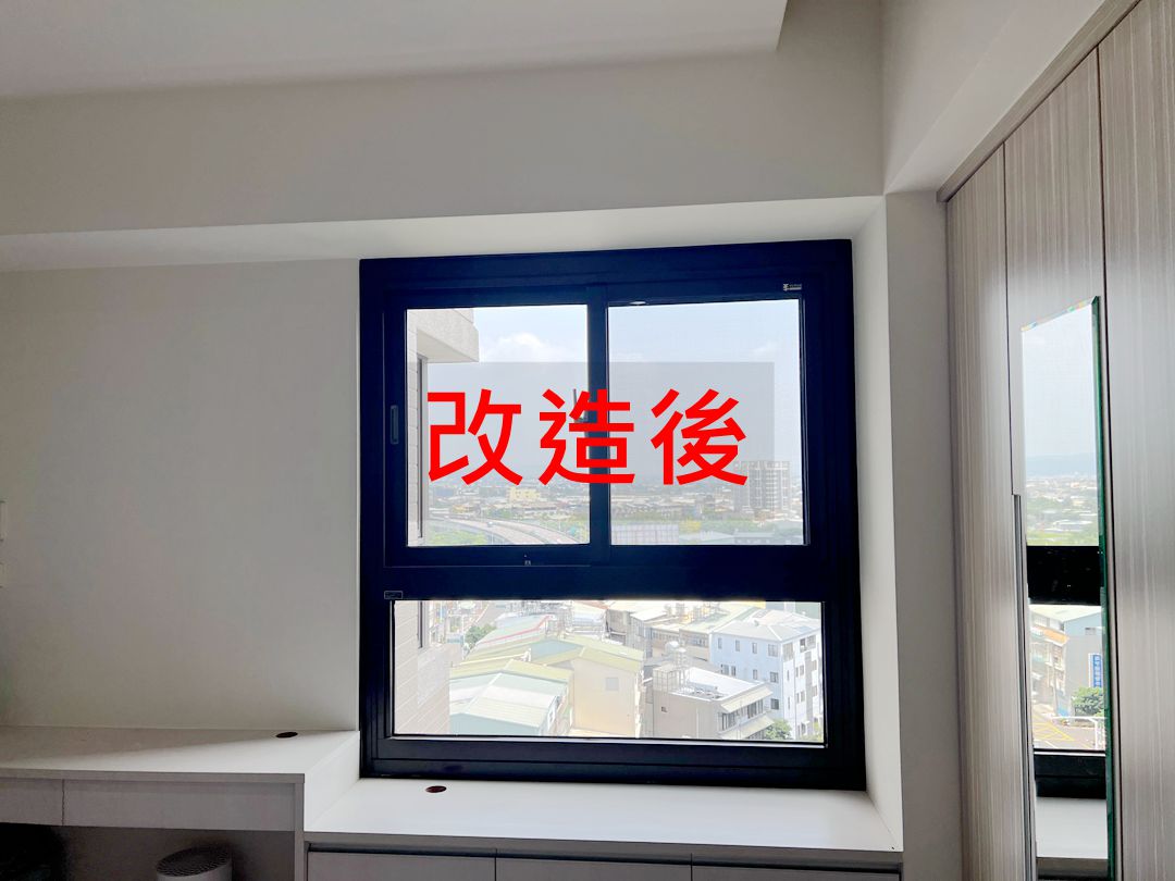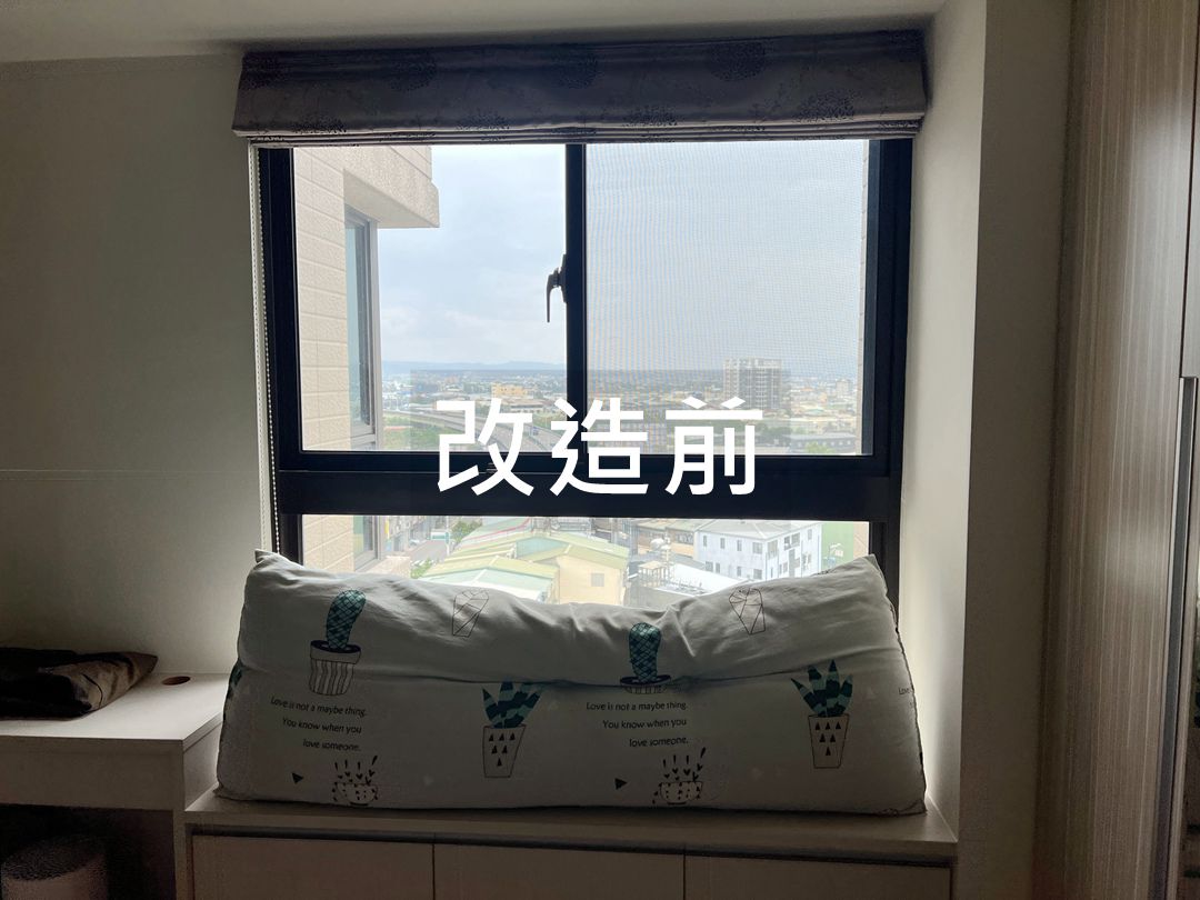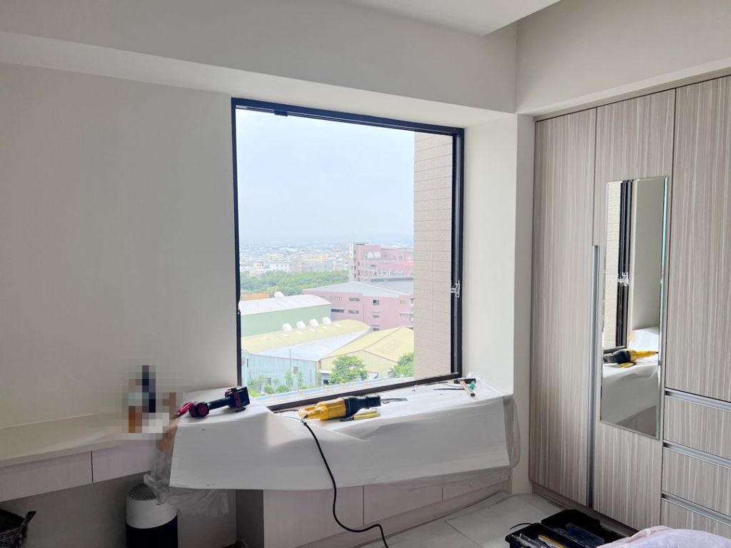 台中南區的總太居易社區緊臨中投公路,車流繁忙噪音大。業主主臥房間希望在不用動到泥作更換等級更高的氣密窗。建議以乾式施工的包框方式,將舊窗更換為高等級氣密窗。因業主要求加強隔音效果,所以氣密窗選擇搭配更厚的膠合安全玻璃。新的氣密窗顏色和外觀符合大樓要求,少粉塵好清潔。