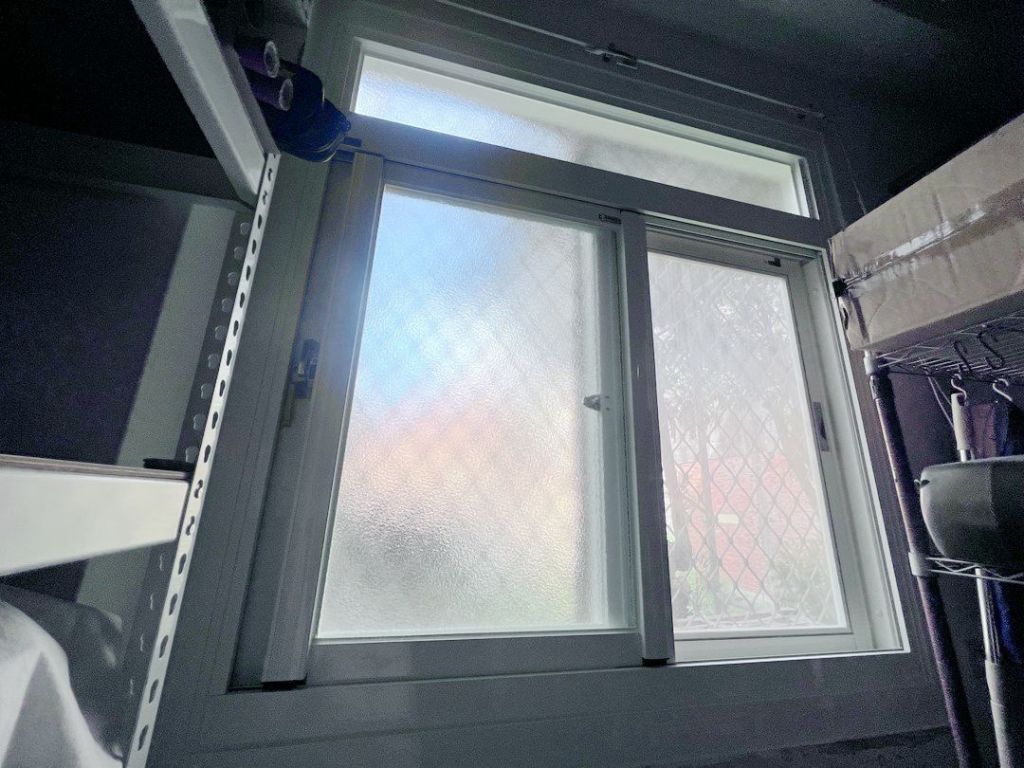一樓的儲藏室更換氣密窗,因氣窗不常開啟,建議不再保留氣窗,將上氣窗改為固定玻璃,減少落塵。採用乳白色搭配霧面玻璃,透光不透視,採光好又有隱私性。