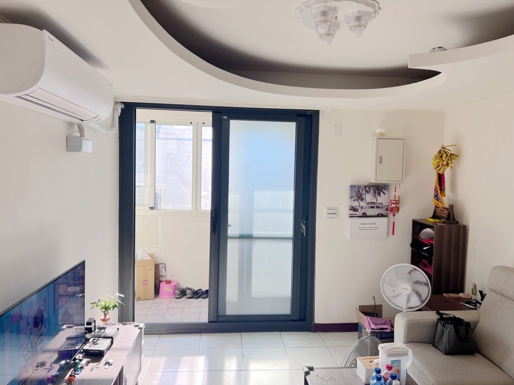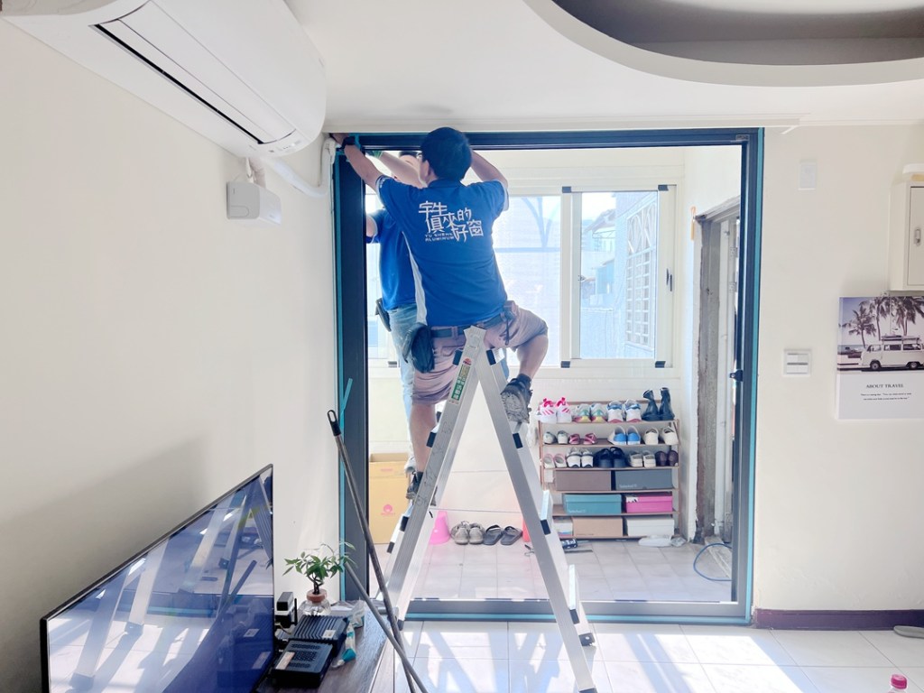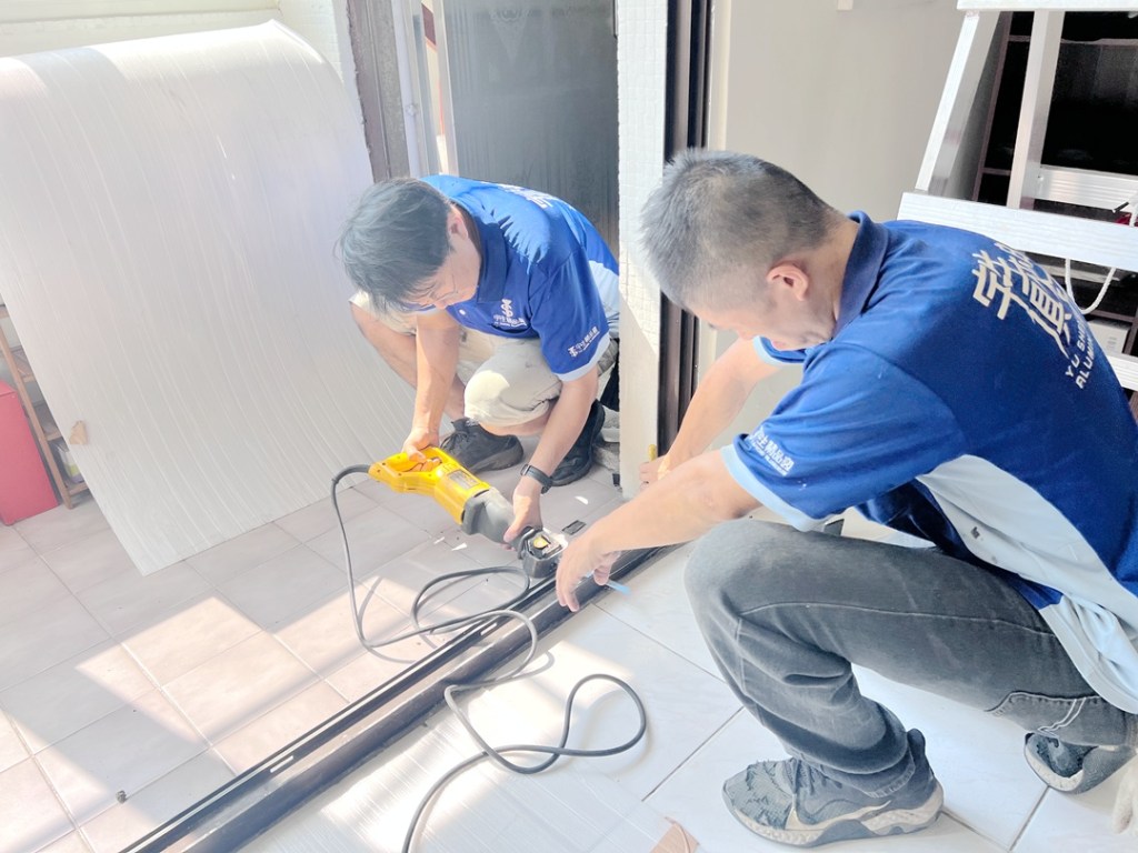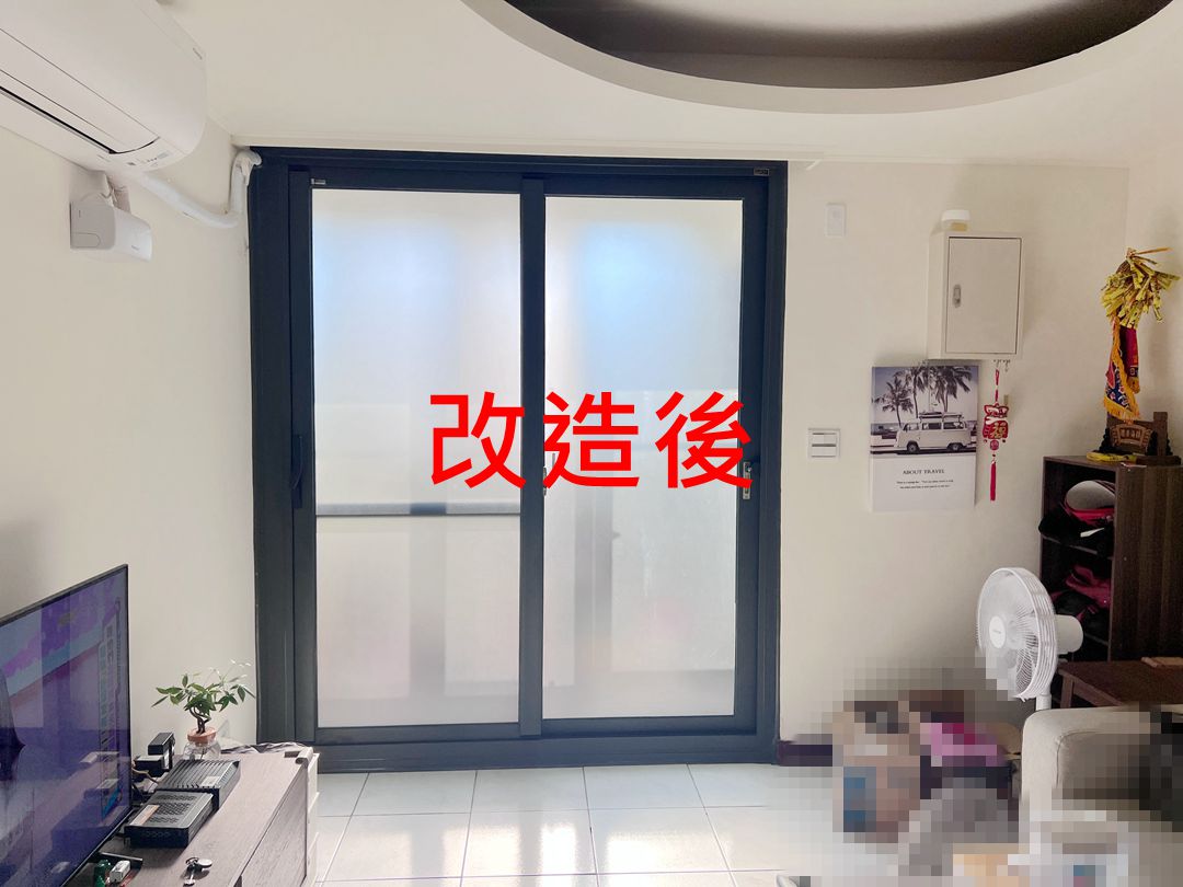 業主家客廳為二拉落地窗,希望更換有氣密效果的落地窗。因為客廳有冷氣管線,要求落地窗側邊保留管線位置。