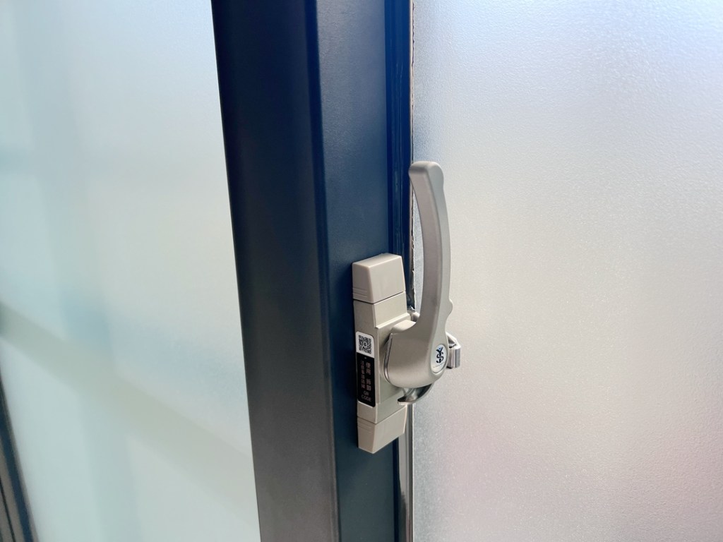 落地窗的玻璃採用噴砂玻璃保留隱私和採光,搭配鐵灰砂色氣密落地窗,簡約俐落線條的現代風。