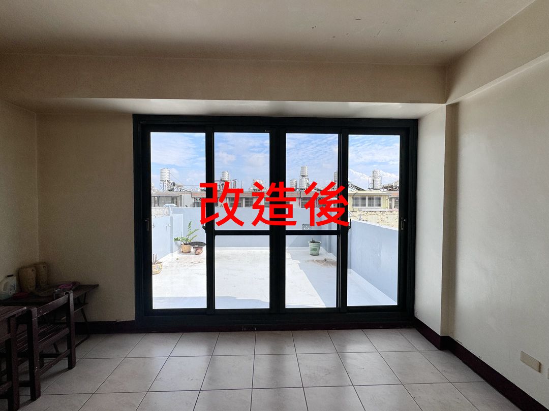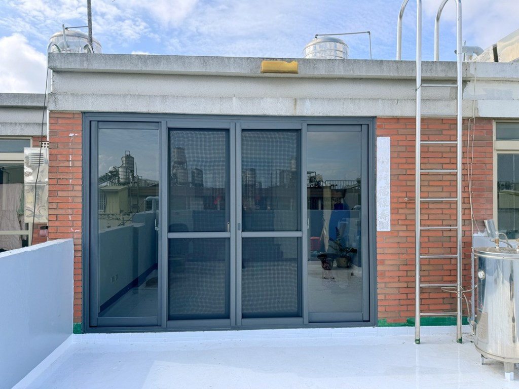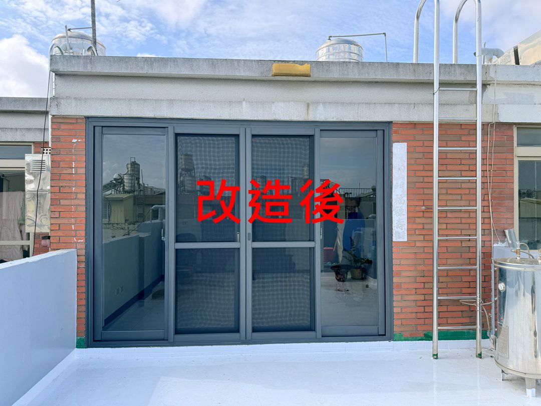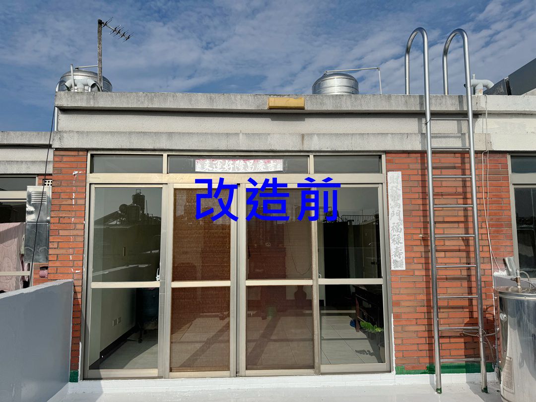 業主家神明廳位於頂樓,有落地窗需更新的需求。業主希望更換有氣密效果的落地窗。原有舊落地窗拆除後,不再保留氣窗,四片落地玻璃更顯大氣。