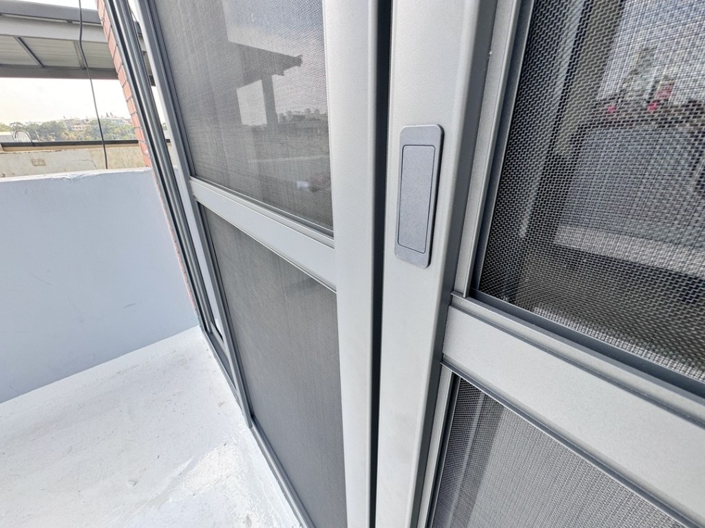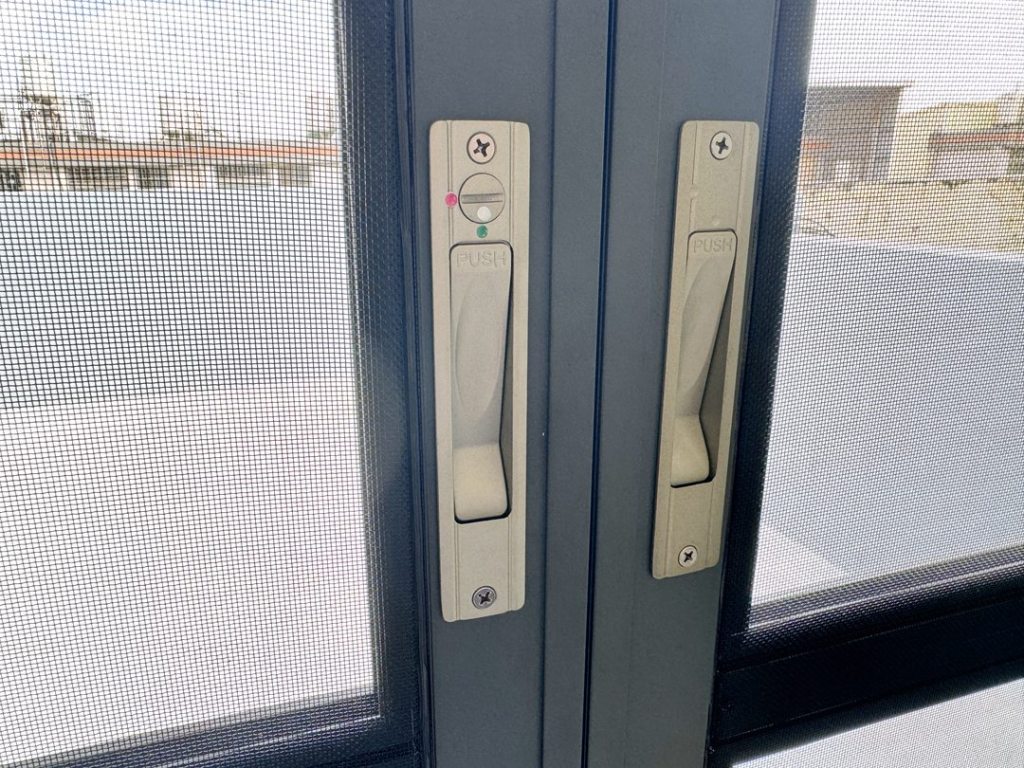 落地窗的玻璃採用灰色玻璃保留採光又減少太陽直晒,搭配鐵灰砂色氣密落地窗,素雅不失莊重的潔淨風格。