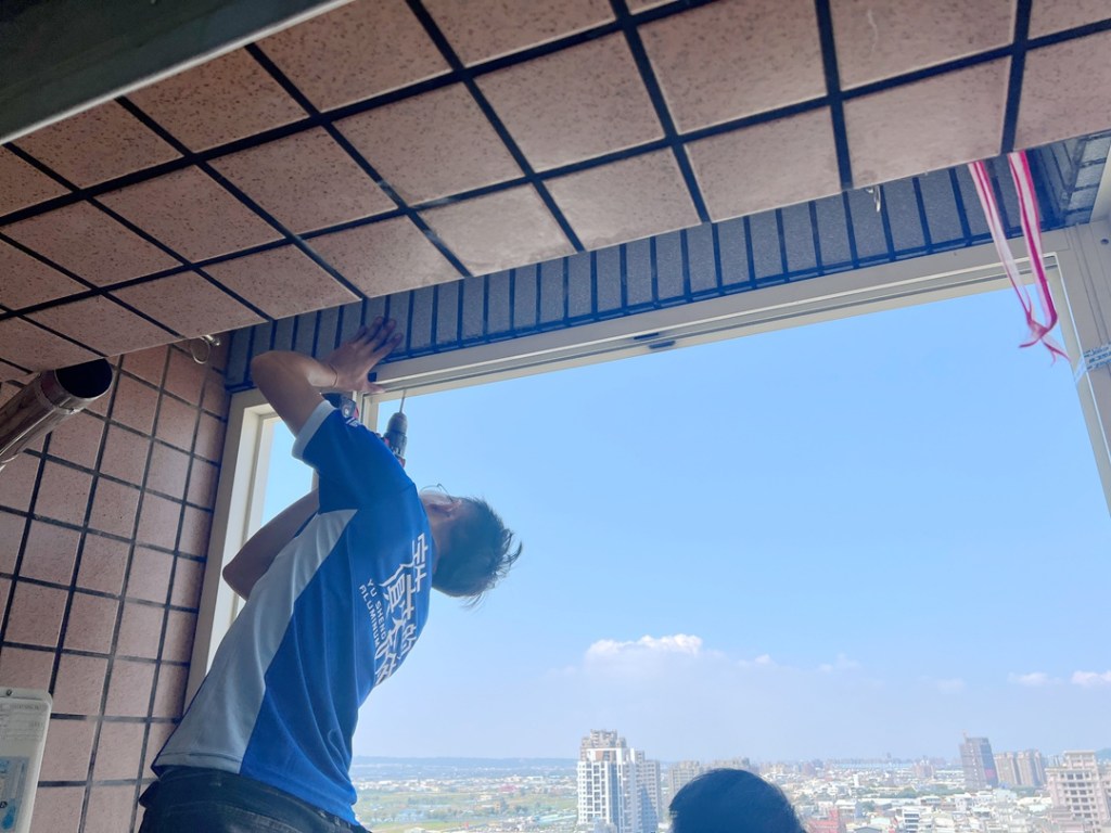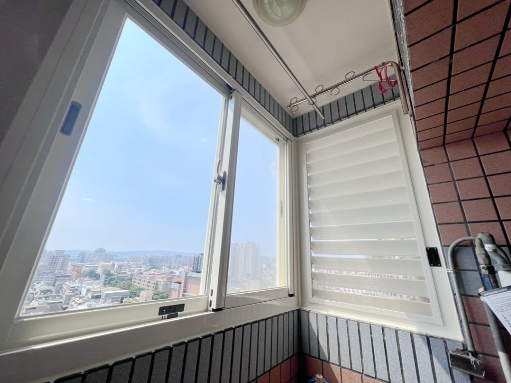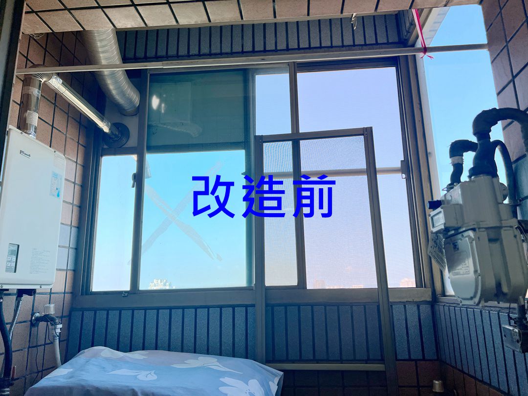 業主的陽台原有舊鋁窗,希望改造能通風的晒衣空間,建議以氣密窗搭配鋁合金百葉窗,平時可開啟百葉窗通風,防潑水擋紫外線,也不怕臨時下雨要收衣服。
