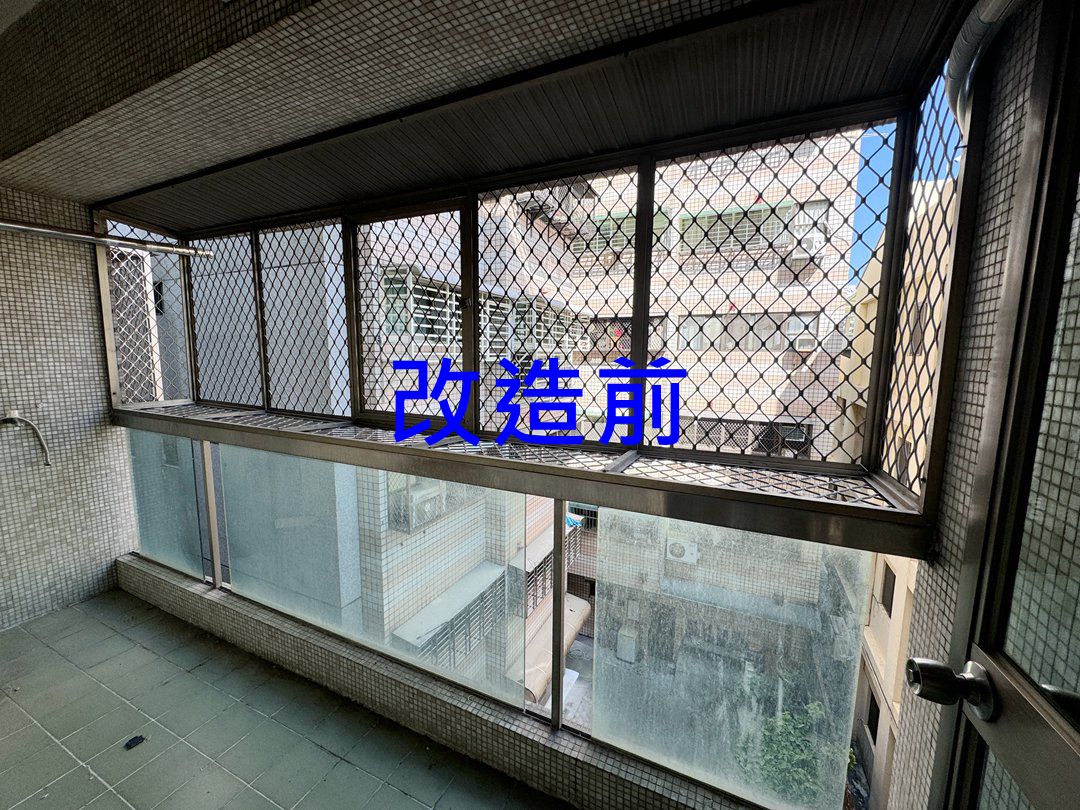 業主的陽台原有舊防盜窗,希望改造能通風且讓貓咪可以在這晒太陽玩耍的空間。建議以氣密窗搭配鋁合金百葉窗,平時可開啟百葉窗通風不悶熱,也不用擔心貓咪會跳出窗外。