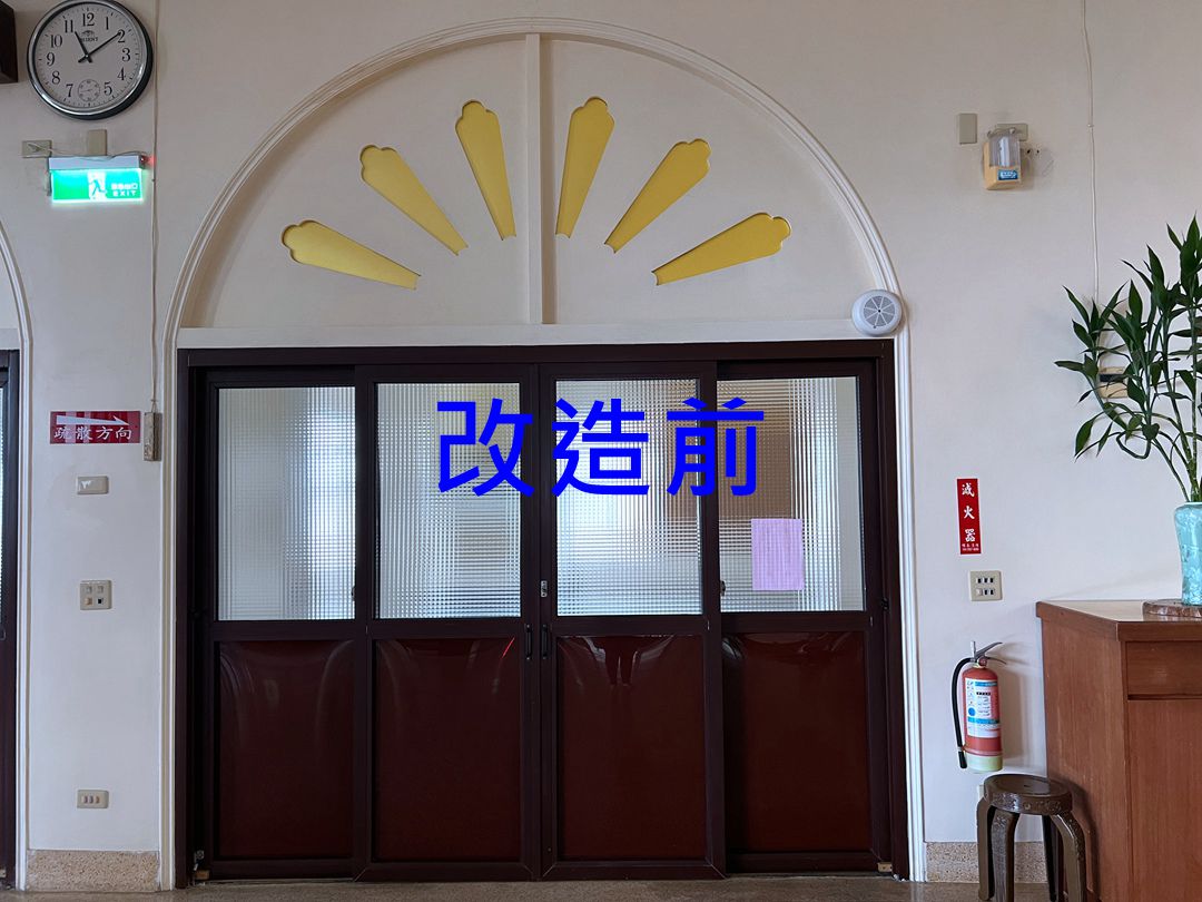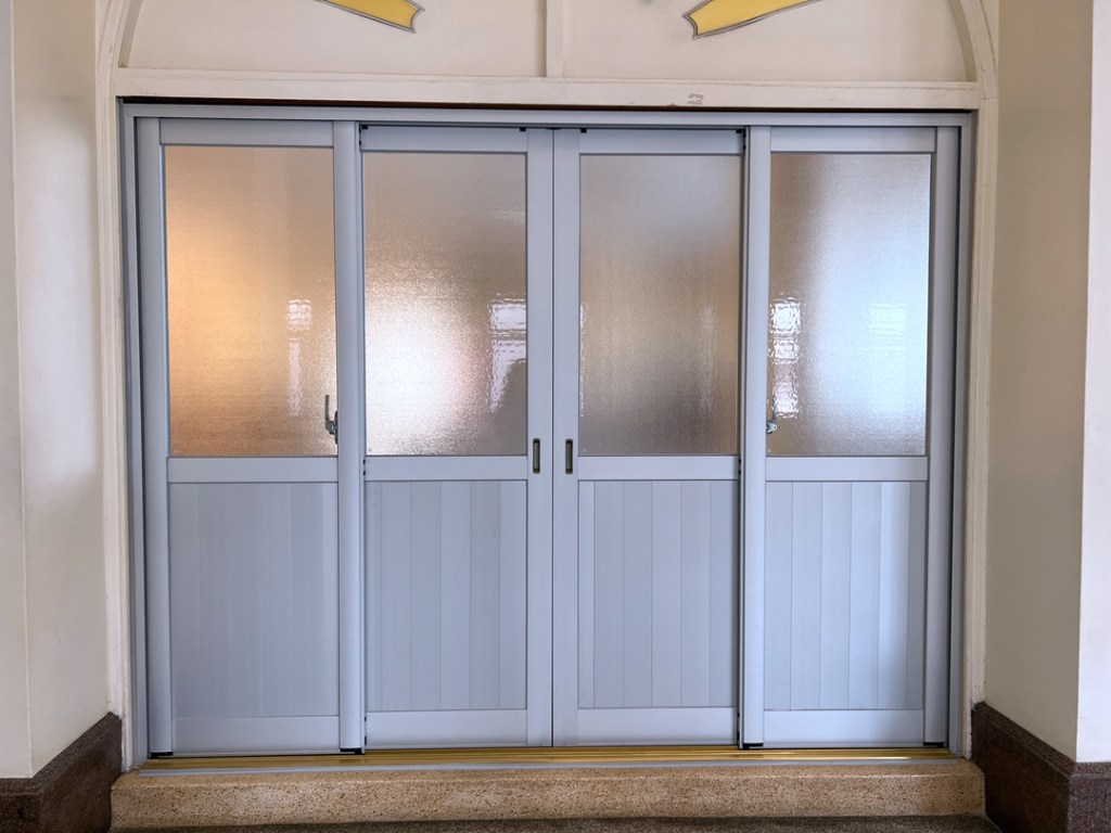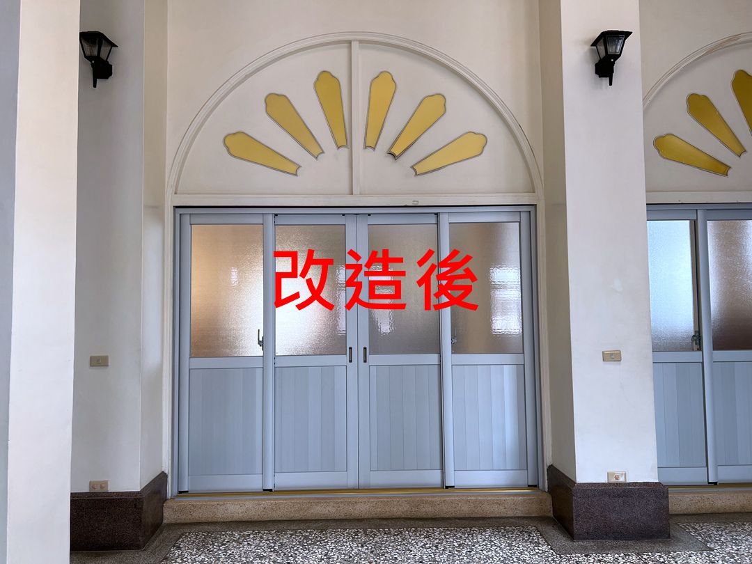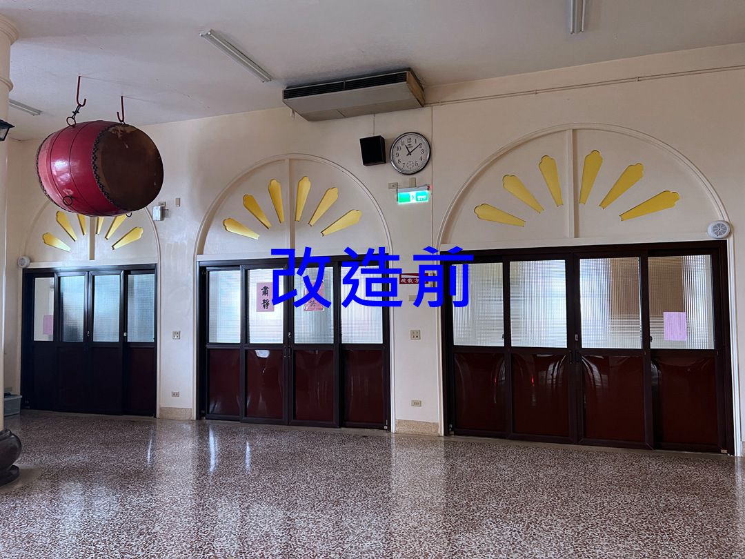 佛寺大殿整修,大殿一樓兩側原為塑鋼落地窗,老舊汰換。此次選擇宇生精品窗的四拉氣密落地窗上霧面玻璃搭配下鋁板設計,保留採光與減少落塵,讓室內保有自然光線。