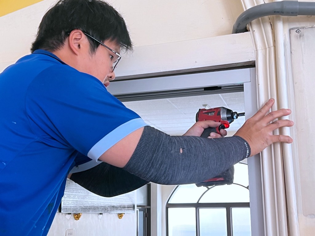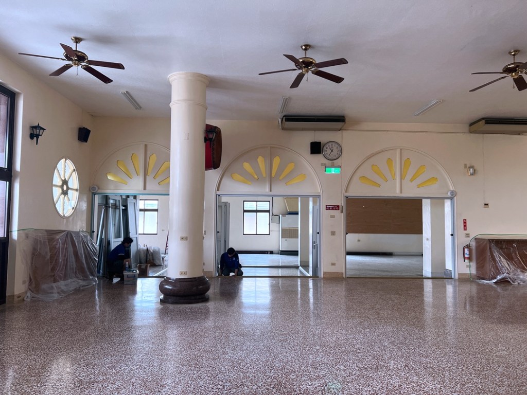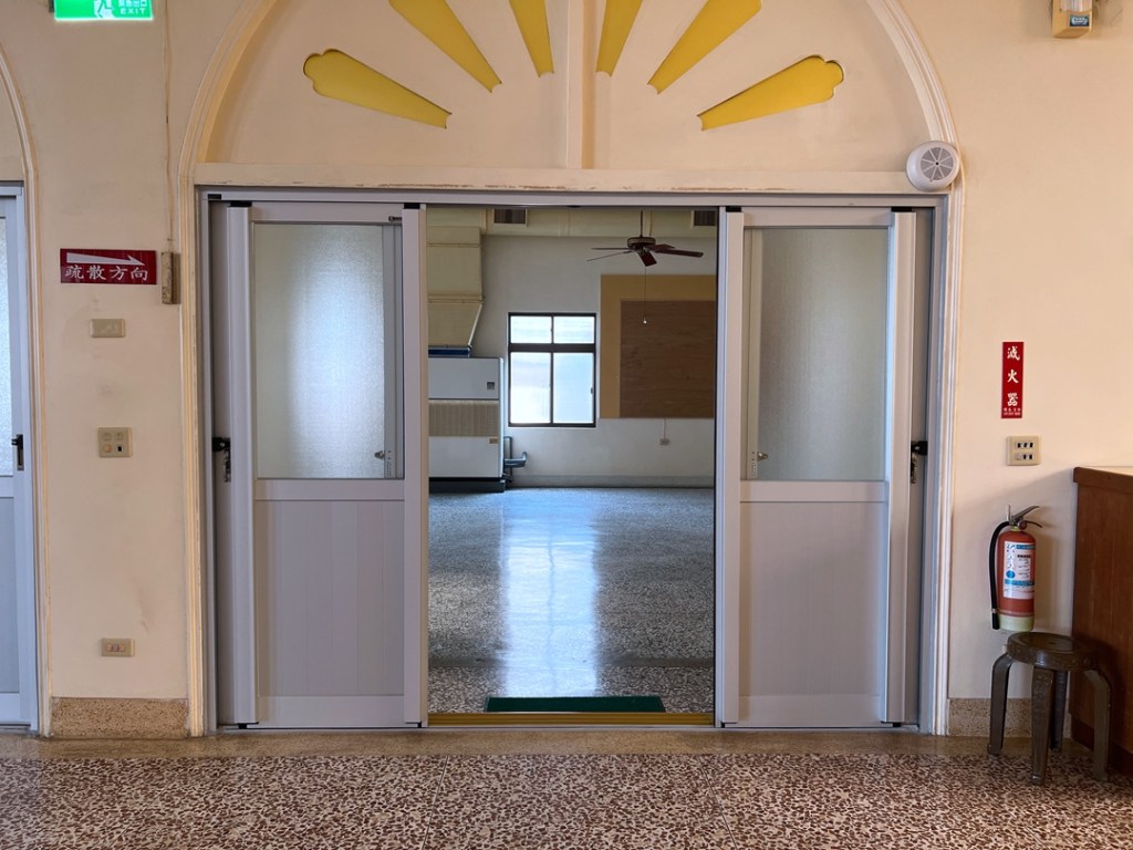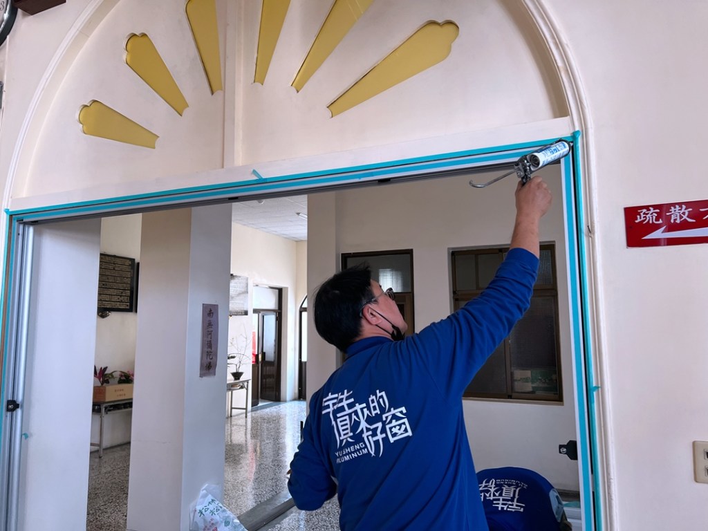 佛寺大殿整修,大殿一樓兩側原為塑鋼落地窗,老舊汰換。此次選擇宇生精品窗的四拉氣密落地窗上霧面玻璃搭配下鋁板設計,保留採光與減少落塵,讓室內保有自然光線。