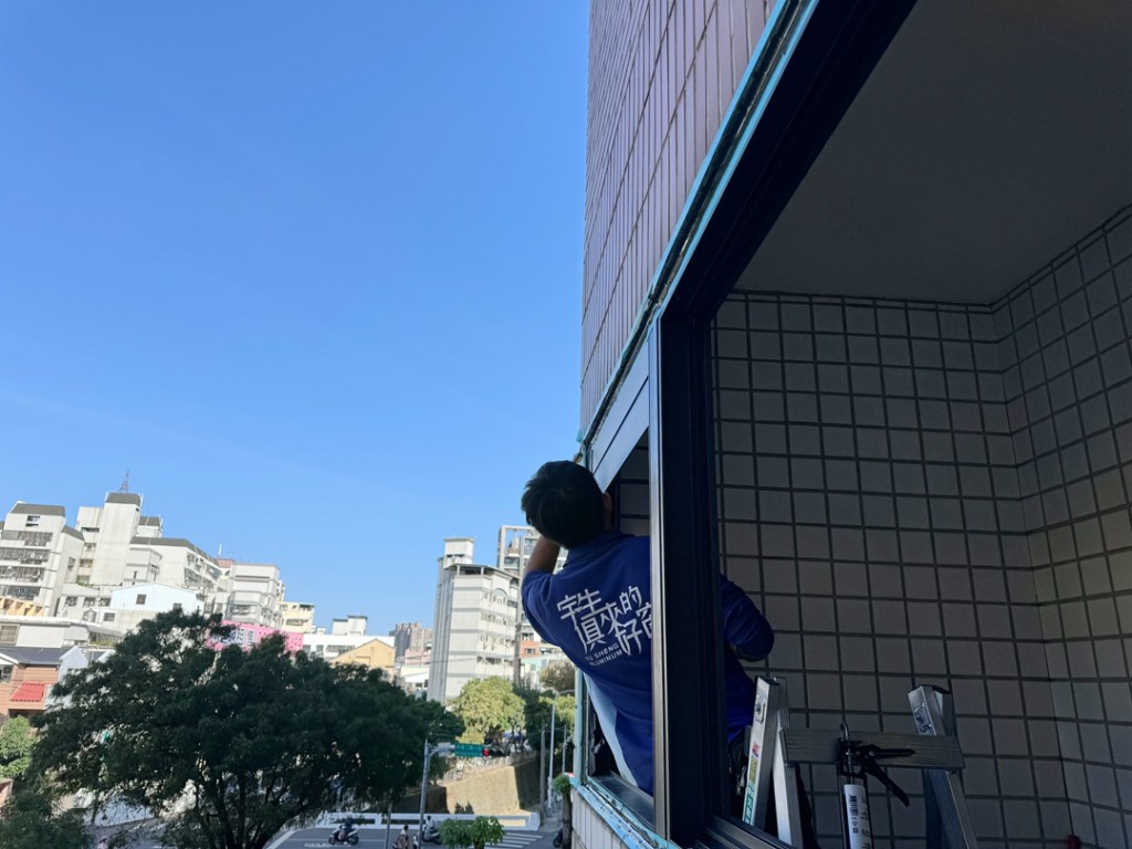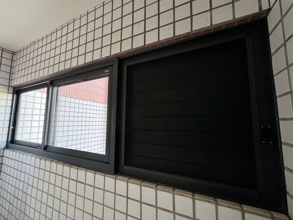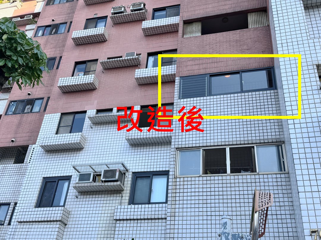 顏色部分,業主陽台百葉氣密窗採用鐵灰砂色搭配透明玻璃,落地氣密窗則採用乳白色搭配透明玻璃