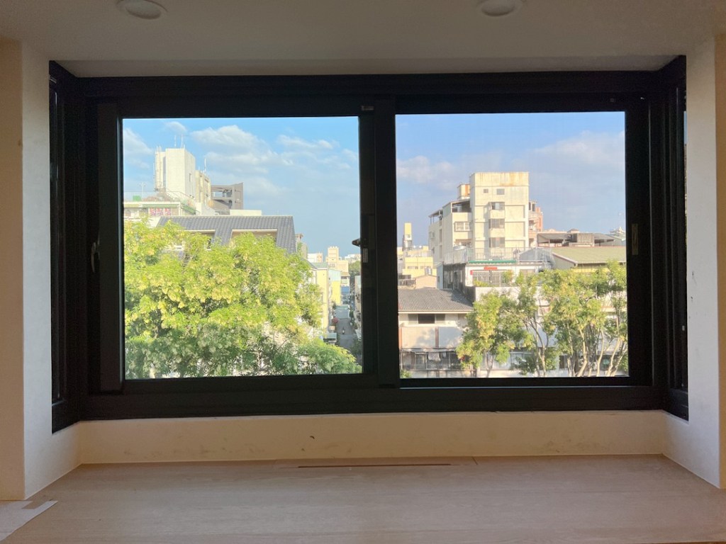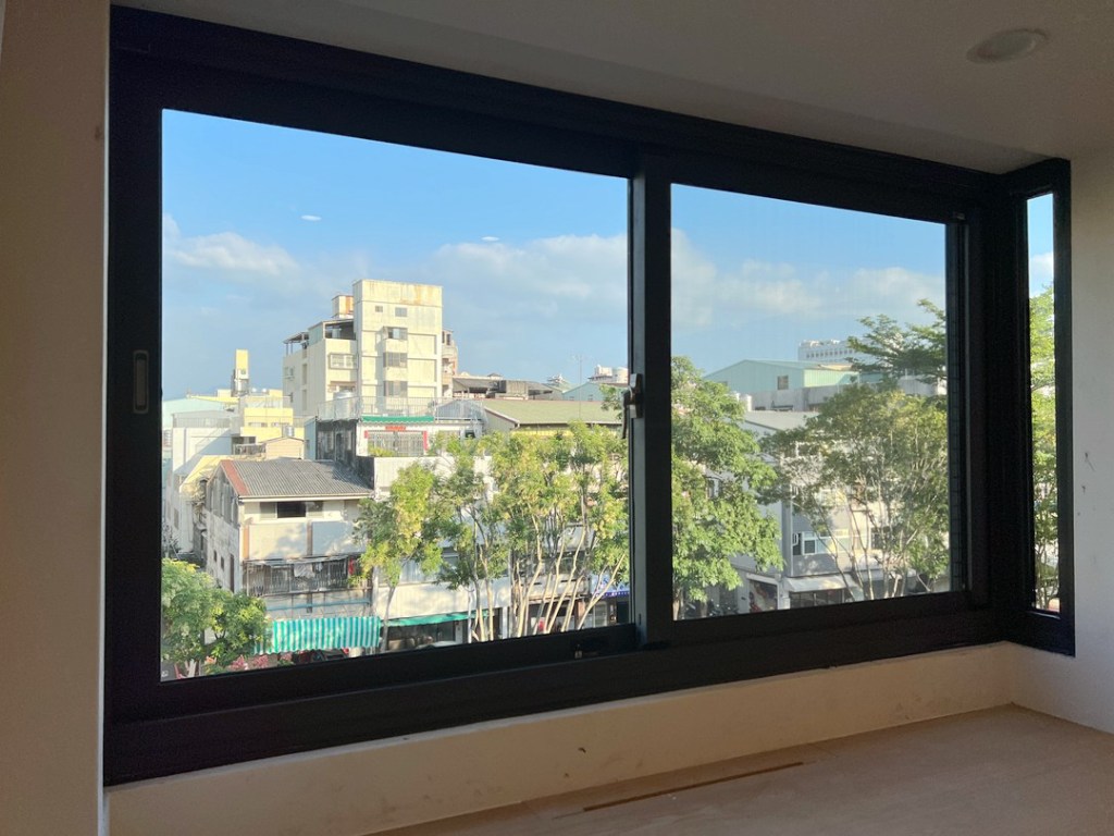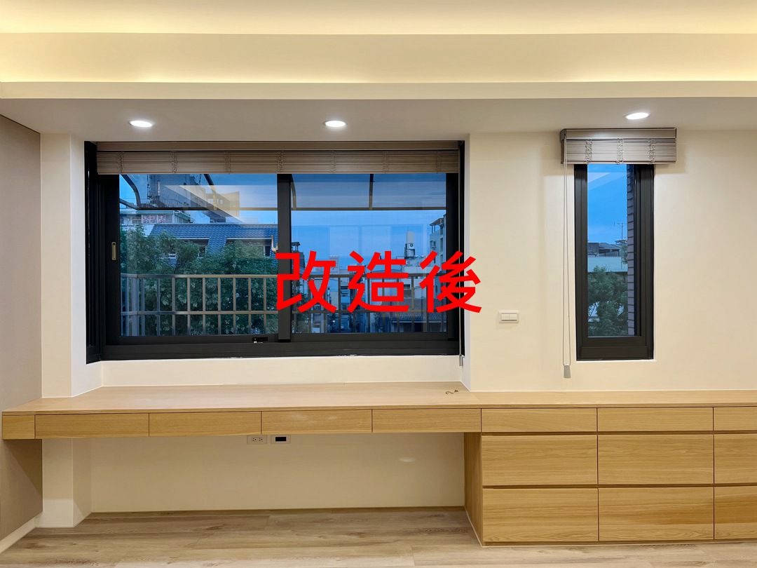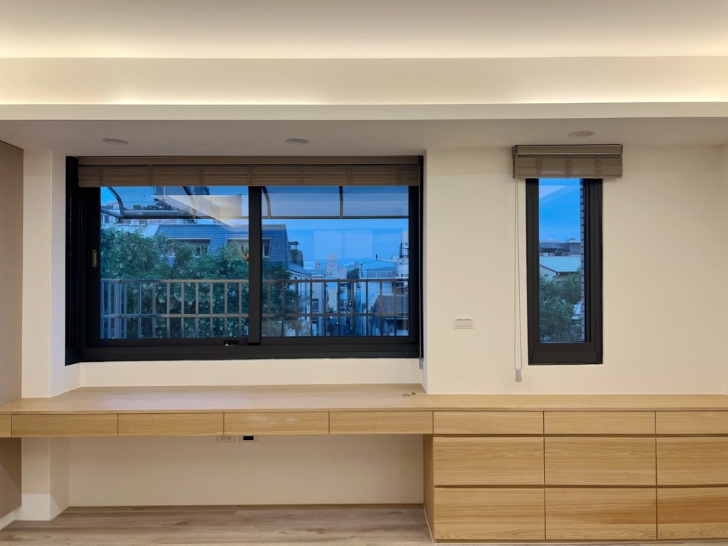 業主書房廣角窗,原為多分格的窗型。配合設計師建議,將正面窗型改為二拉大面寬氣密窗,將室外風景納入室內設計,空間感更舒適。側邊長型窗戶,因不常開啟,改封固定玻璃窗,只保留採光。