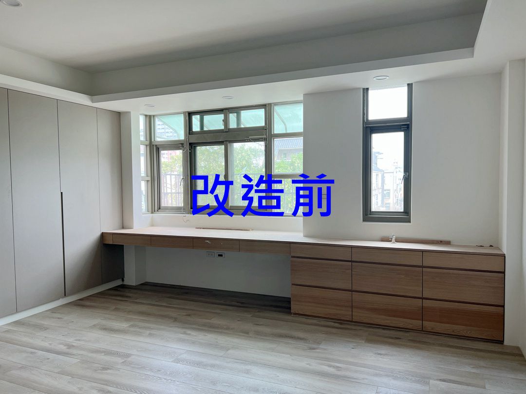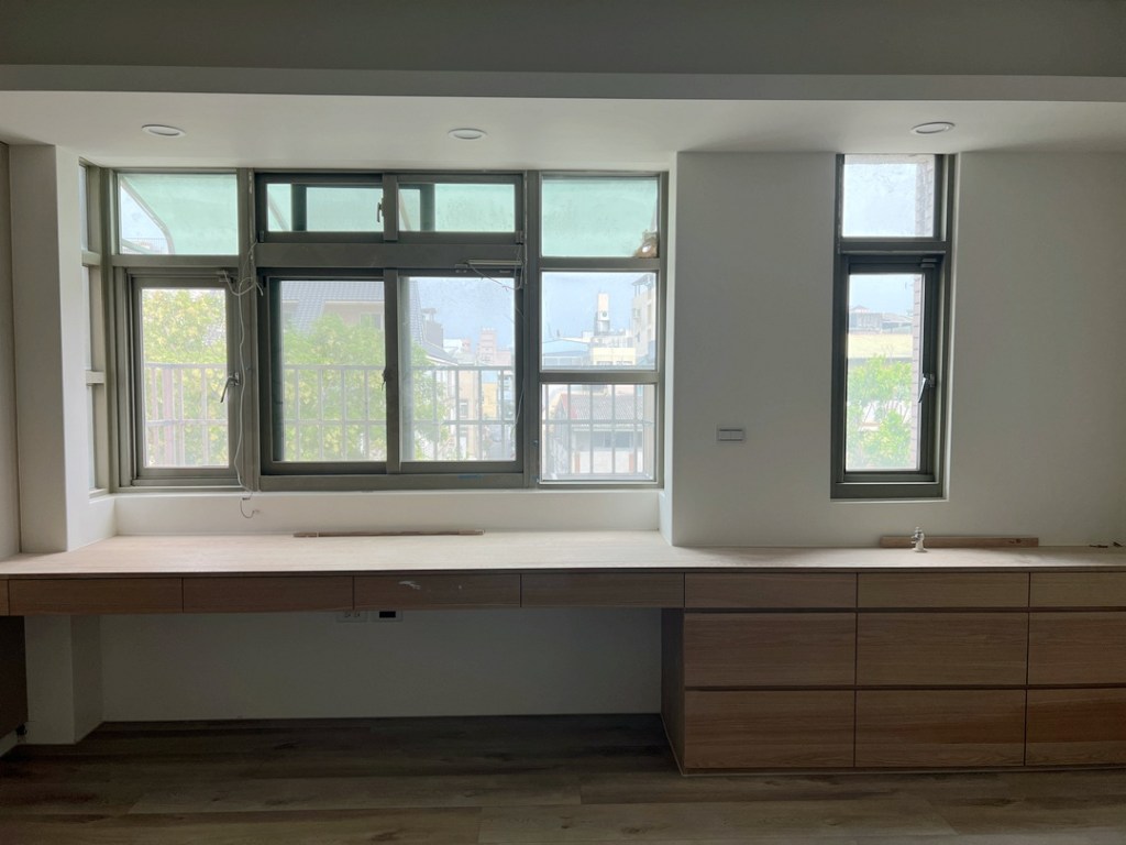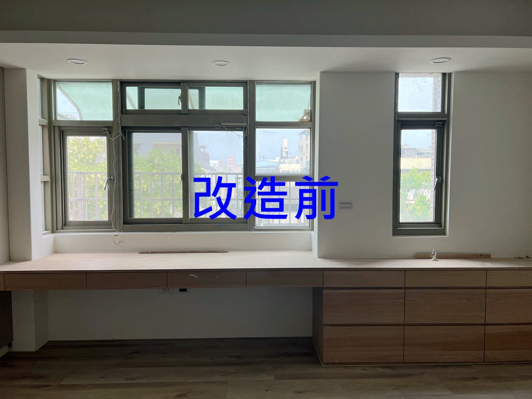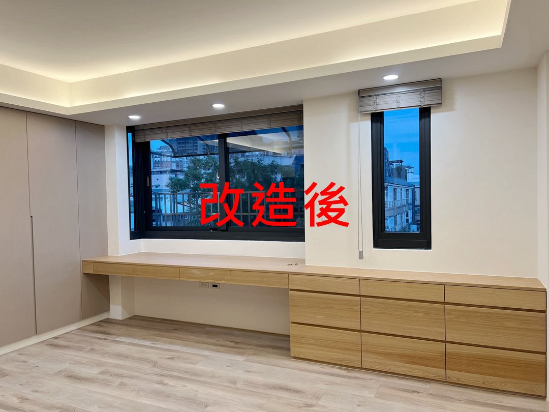 業主書房廣角窗,原為多分格的窗型。配合設計師建議,將正面窗型改為二拉大面寬氣密窗,將室外風景納入室內設計,空間感更舒適。側邊長型窗戶,因不常開啟,改封固定玻璃窗,只保留採光。