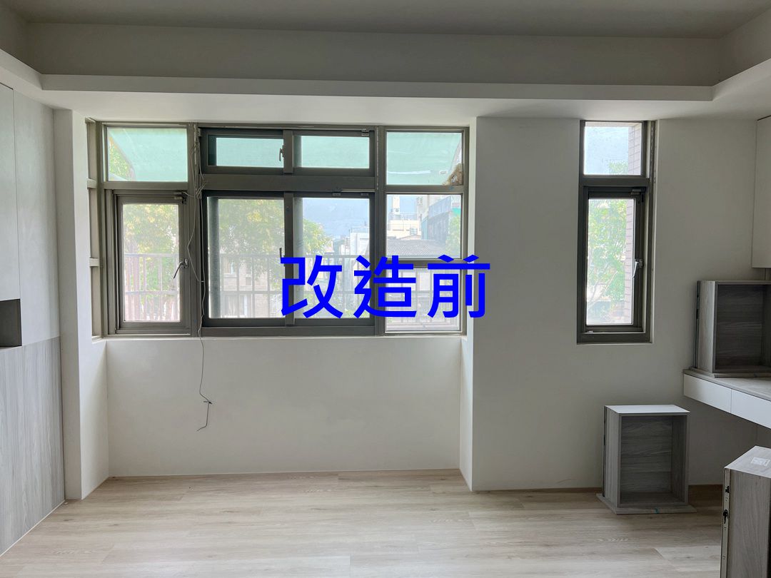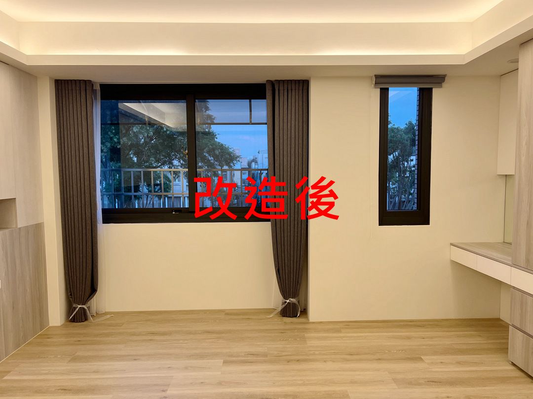 業主客房廣角窗,原為多分格的窗型。配合設計師建議,將正面窗型改為二拉大面寬氣密窗,將室外風景納入室內設計,空間感更舒適。側邊長型窗戶,因不常開啟,改封固定玻璃窗,只保留採光。