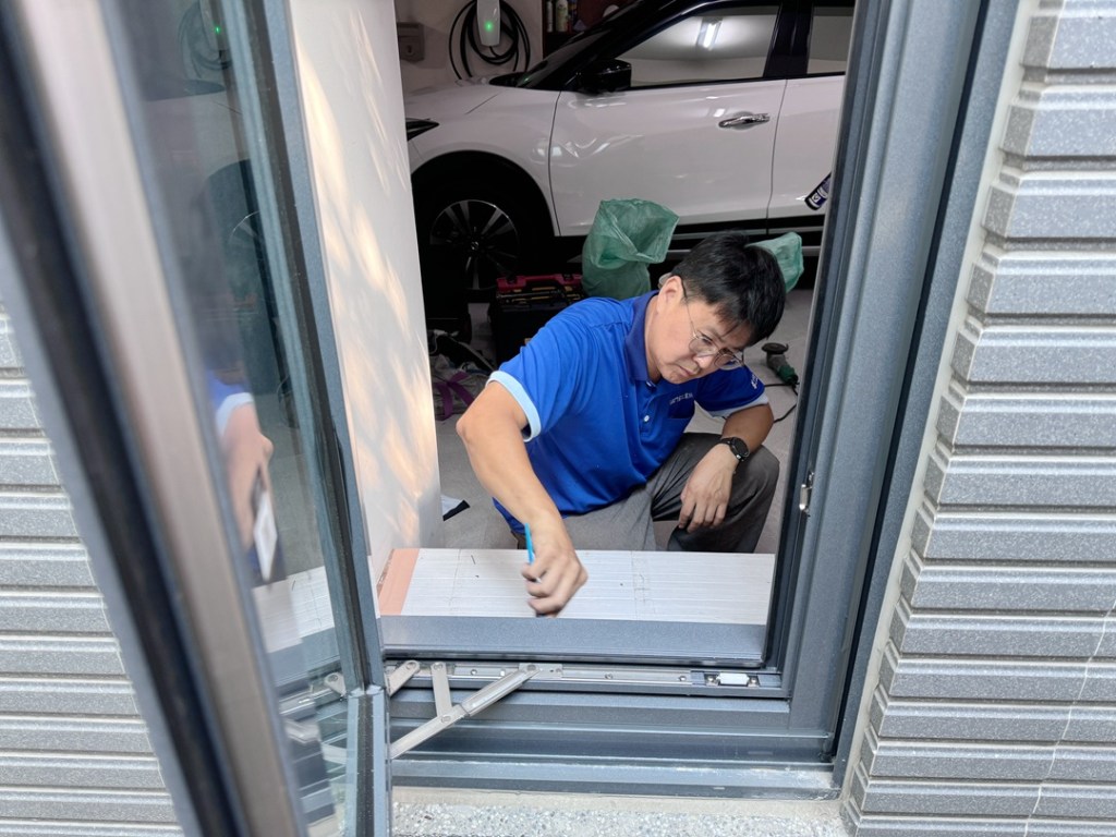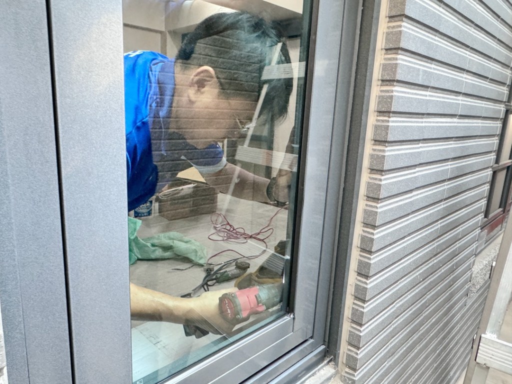 業主窗戶原設計為上下推窗,因不符合使用需求,建議改密合度更好的靜音加壓推開窗。以乾式施工包框方式換新窗,推開窗加裝折疊紗窗防蚊,可依需求控制開窗幅度,安全性高,並輔以三道防盜鎖,不僅是防盜,更配有獨立鎖,避免家中幼童誤開窗跌落。水密防水效果經國家級實驗室測試,可達 150 kgf/m²以上,耐風壓可達360 kgf/m²。