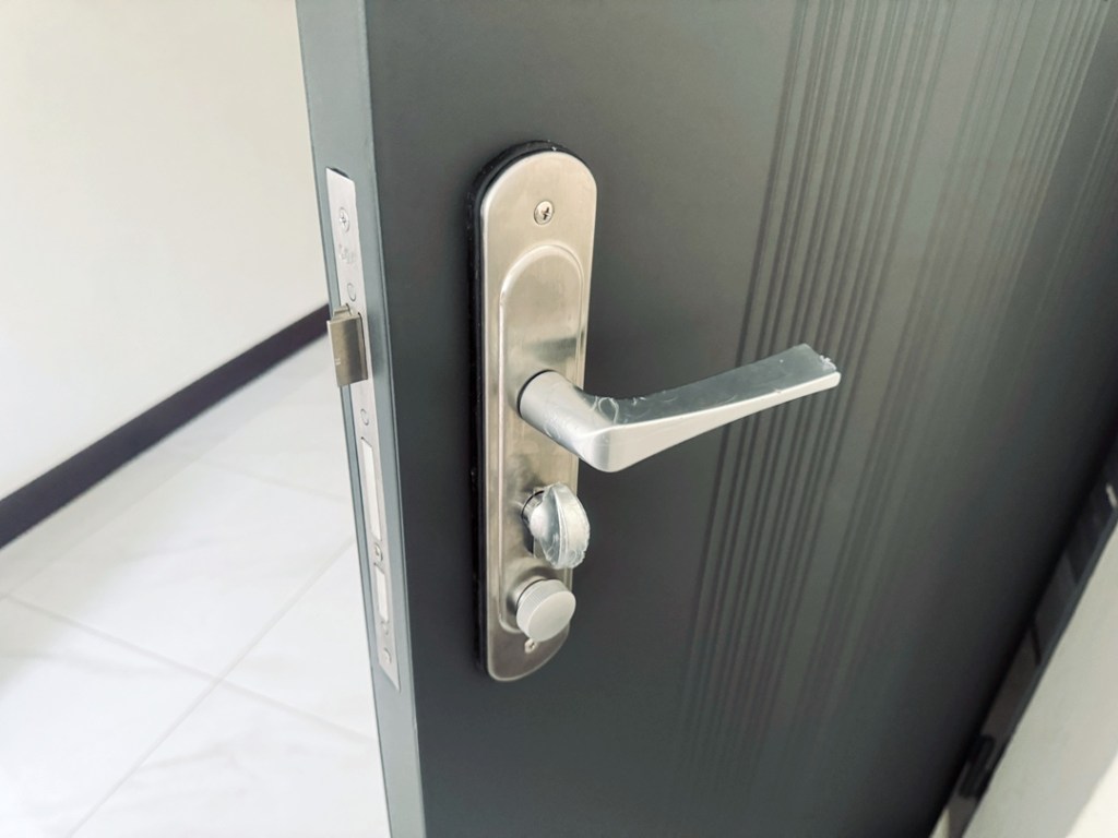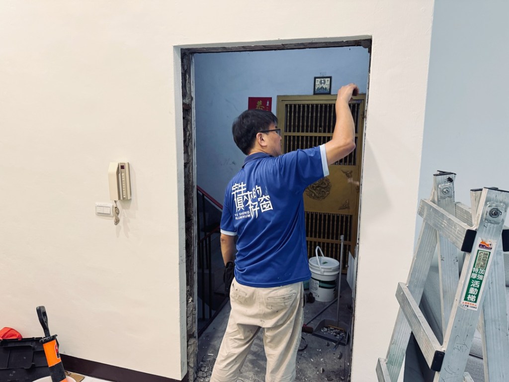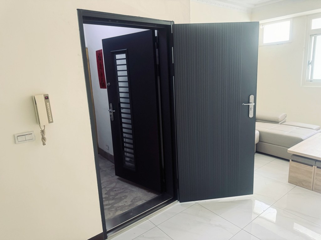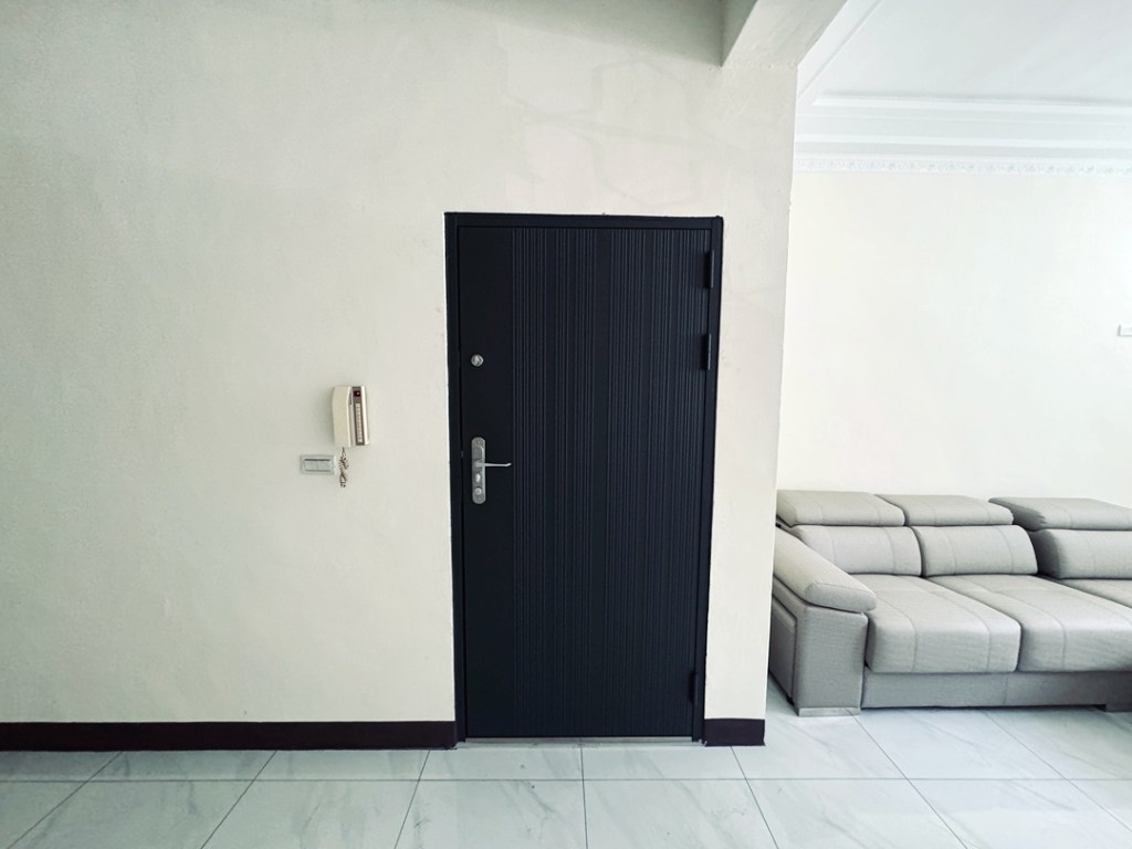業主家原為舊式內外玄關門,業主希望更換更現代化的門面,並維持現在雙玄關門的型態。推薦安裝雙玄關鍍鋅鋼板門,業主選擇鐵灰砂色門片款式,外門片玻璃為透明玻璃,替代傳統貓眼。施工只需一天。