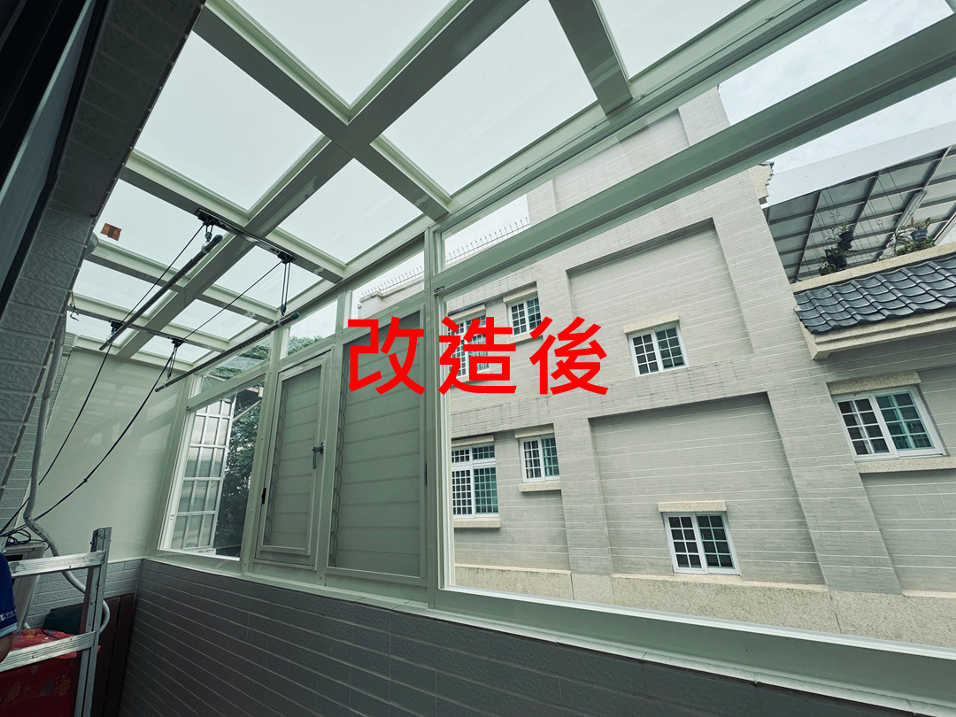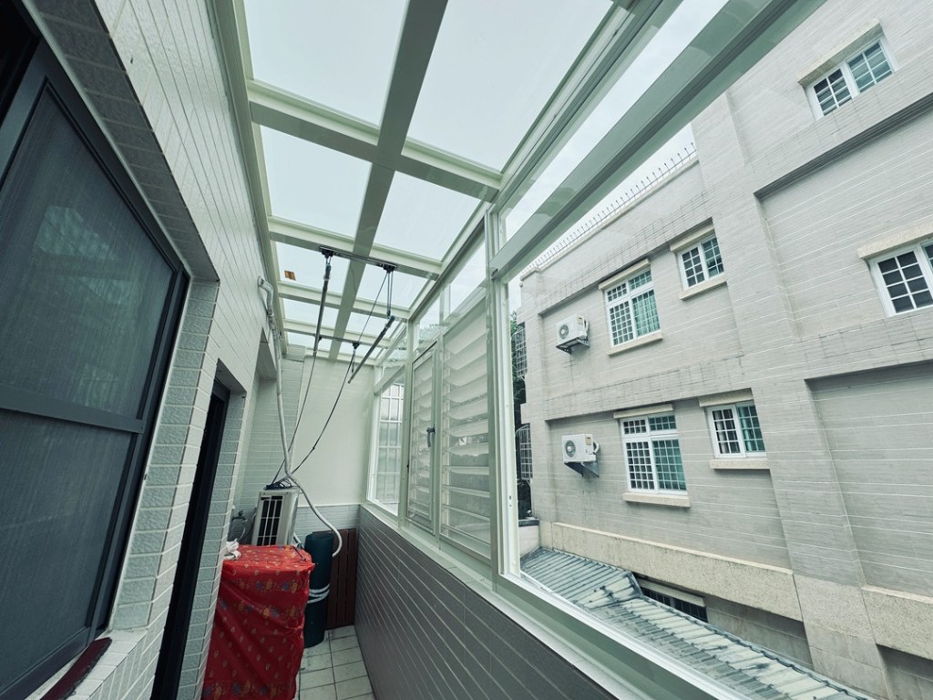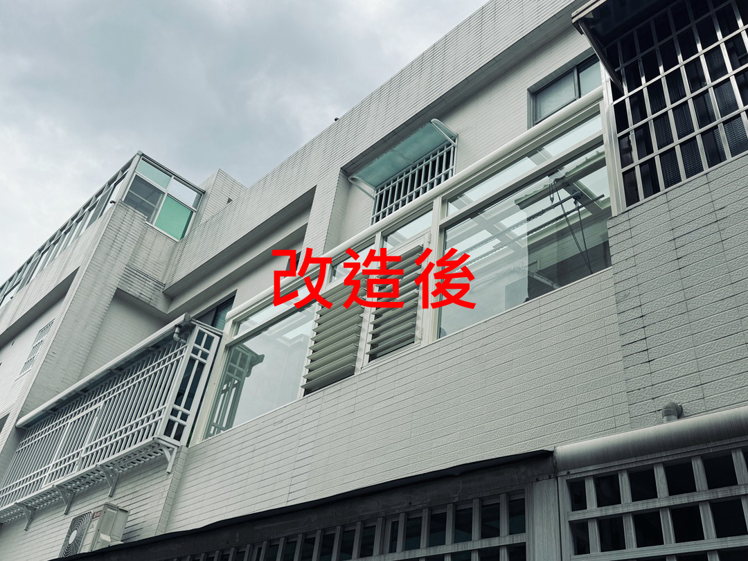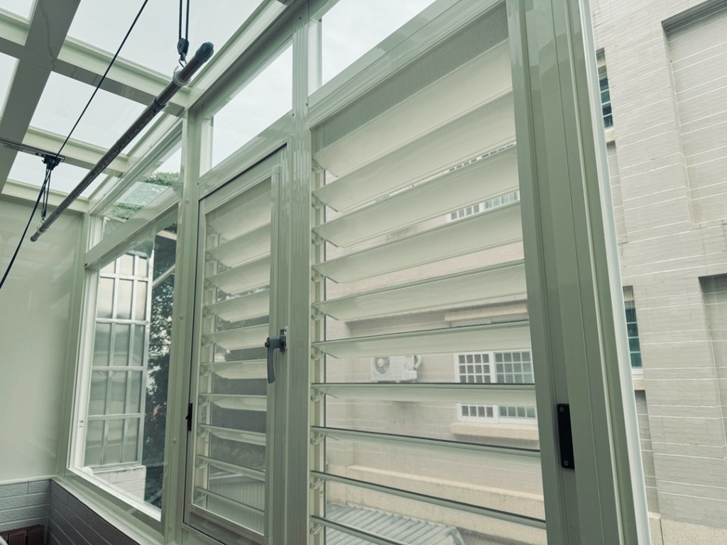 業主陽台原先是鐵窗,希望可以改造成明亮空間,並可當室內使用。因業主希望前面採用大玻璃景觀窗,建議正面對外可以大片固定玻璃窗+鋁合金百葉窗的組合。鋁百葉窗有防盜功能,平日可開啟通風,並有紗窗防蚊蟲,玻璃景觀窗則實現業主對歐洲生活的夢想。