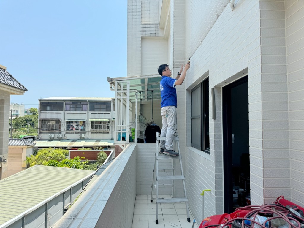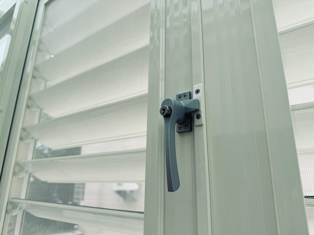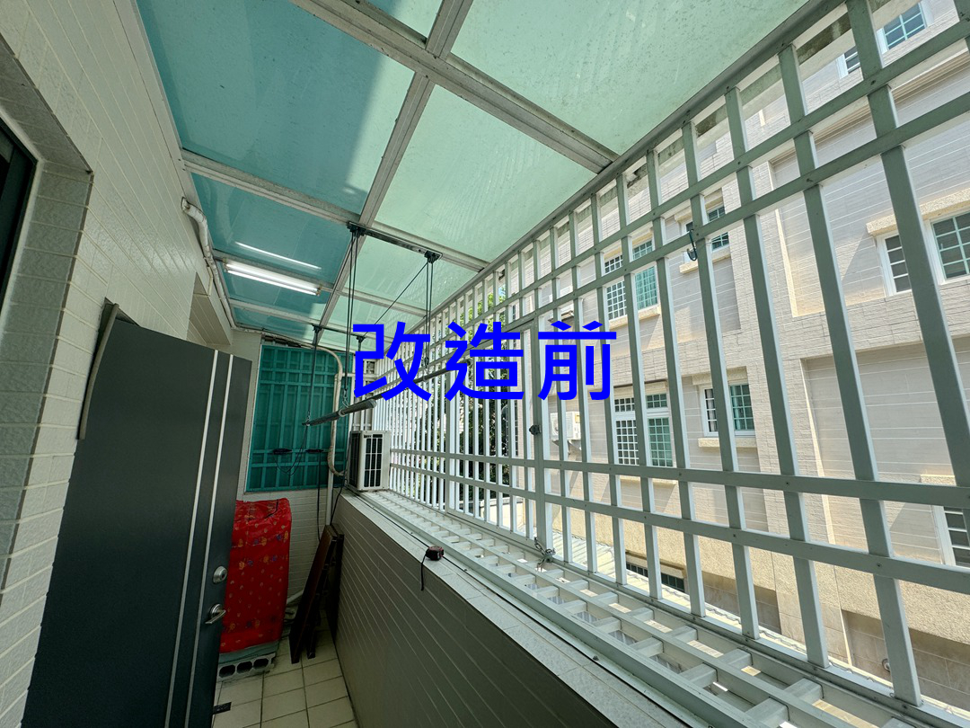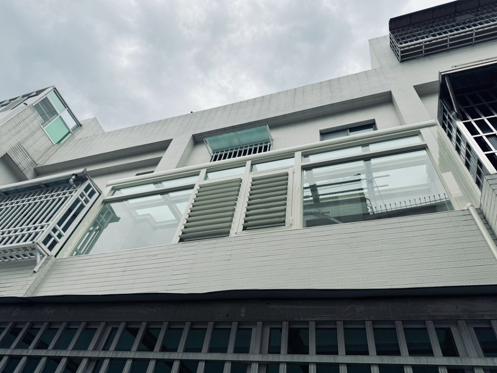 業主陽台原先是鐵窗,希望可以改造成明亮空間,並可當室內使用。因業主希望前面採用大玻璃景觀窗,建議正面對外可以大片固定玻璃窗+鋁合金百葉窗的組合。鋁百葉窗有防盜功能,平日可開啟通風,並有紗窗防蚊蟲,玻璃景觀窗則實現業主對歐洲生活的夢想。