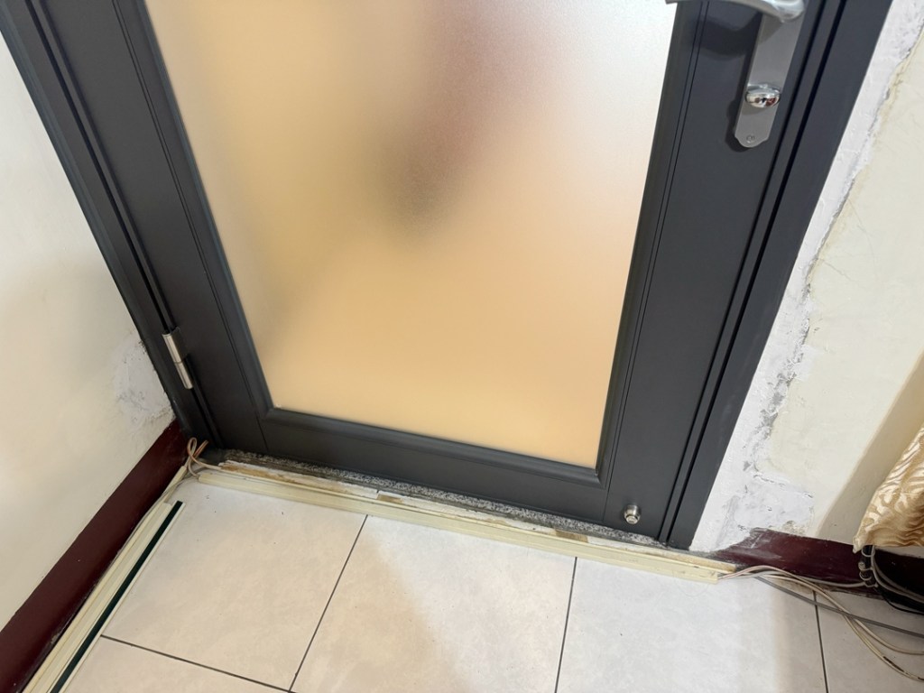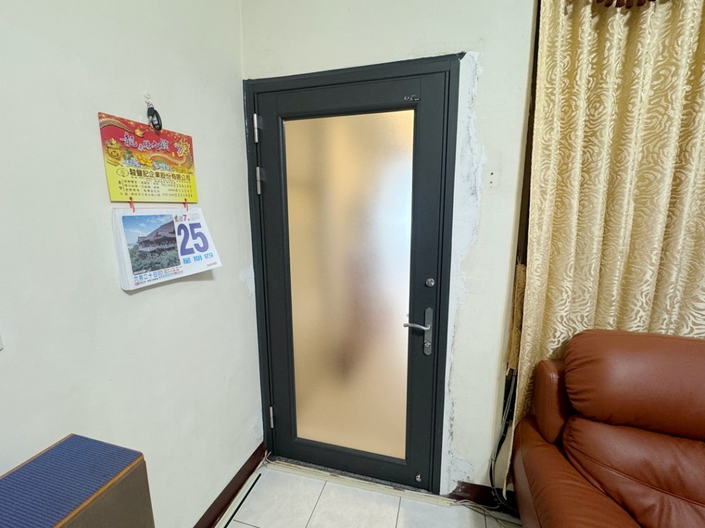 因業主希望保持原來門寬,建議舊有的硫化銅門舊框全部拆除,改安裝精緻玻璃鋁門。
