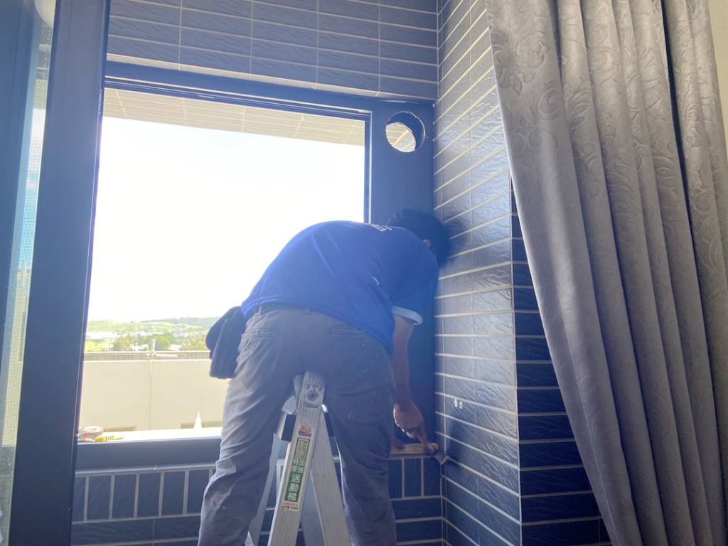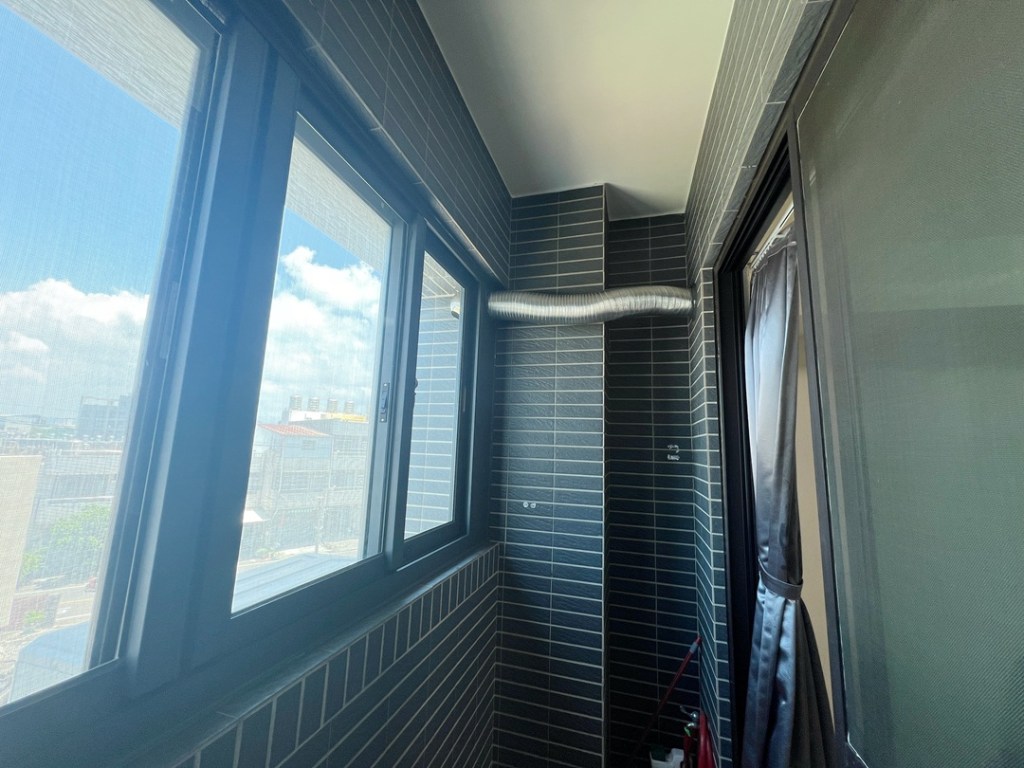 業主選擇在陽台上安裝氣密窗,希望將排油煙機排煙管往外延伸到室外。建議安裝陽台氣密窗,側留管道讓排煙管通過,氣密窗可正常使用。窗戶關閉時成為室內空間,下雨時雨水不會噴進室內,雨天也能正常曬衣服,擁有清潔且宜人的陽台空間。
