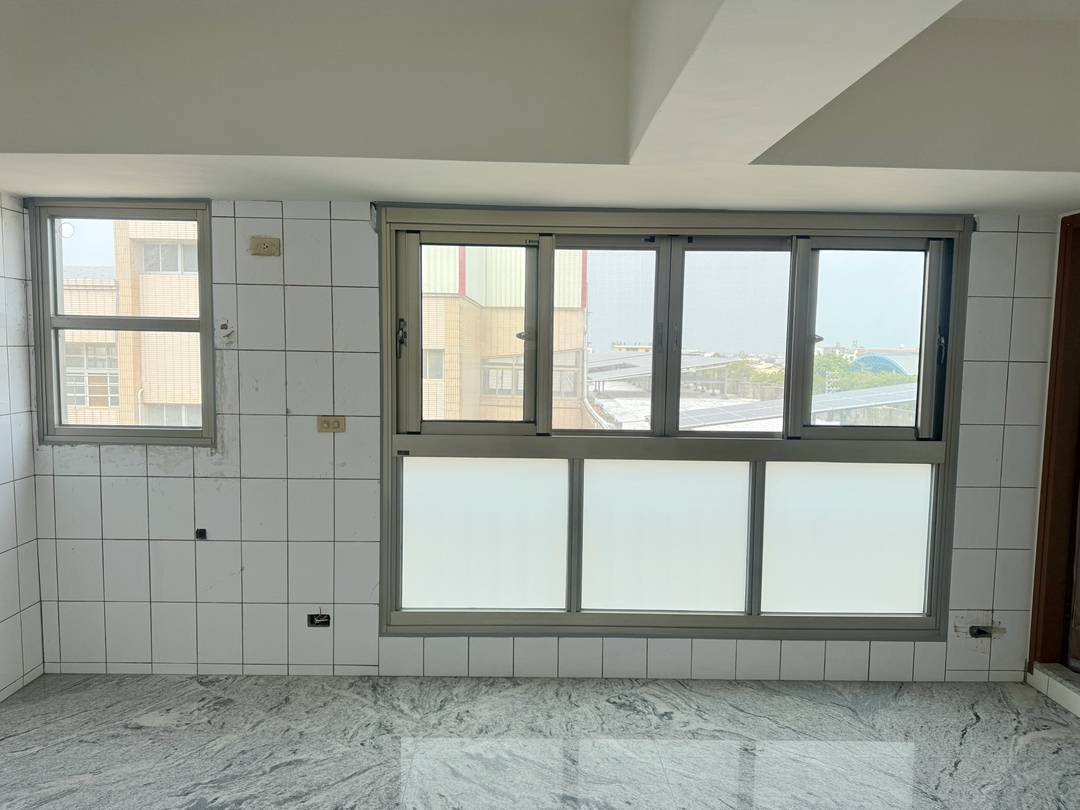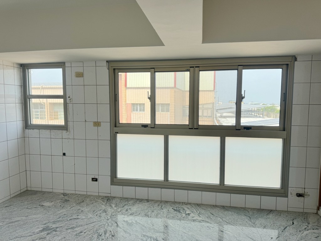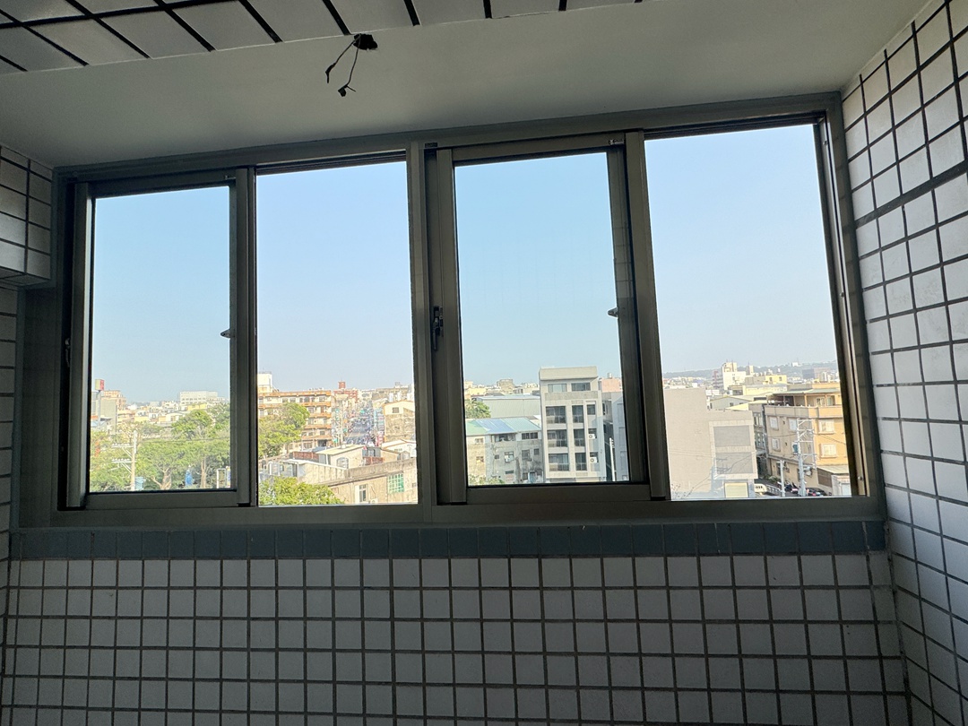 業主全室重新裝潢,更換氣密窗及陽台窗。由於房間和浴室原設計的窗戶較低,依業主需求,將落地窗改為不透明的下固定玻璃搭配上氣密窗,較為安全。二座陽台,小陽台作二拉二併陽台氣密窗,大陽台則再以鋁門隔間成為一個獨立儲藏間,內留百葉窗通風。透過陽台,客廳仍有充份採光和通風。
