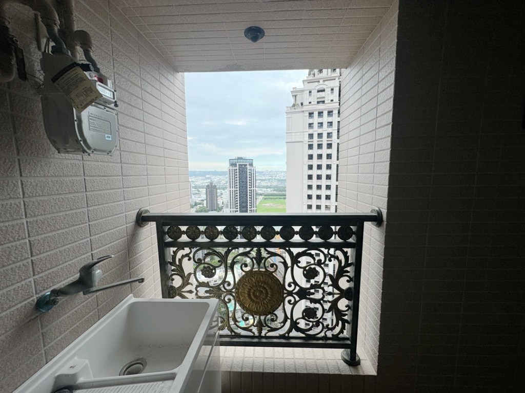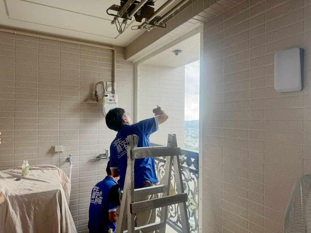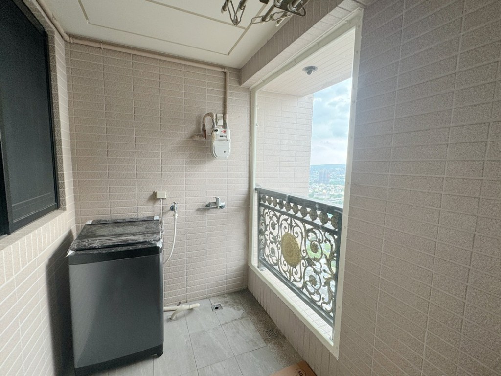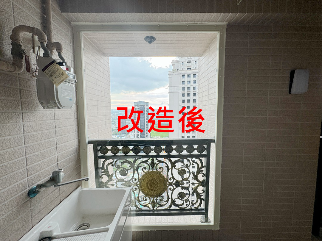 業主居住高樓層,陽台放置洗衣機,要求安裝不影響大樓外觀又可擋雨的窗戶。建議於陽台內作大片玻璃落地窗,擋雨防風。